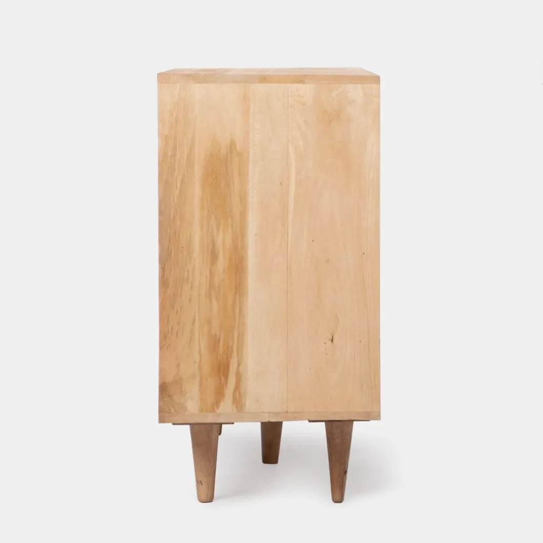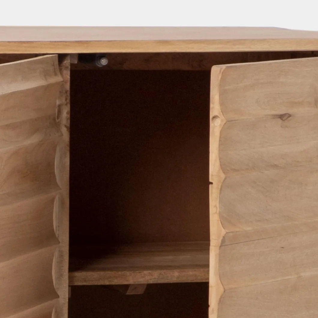 El aparador en madera de mango Sama derrocha estilo y personalidad. Sus tres puertas han sido talladas a mano por maestros artesanos, por lo que se trata de una pieza única. Cuenta con un sistema de apertura push que permite abrir y cerrar el conjunto fácilmente, aunque si lo prefieres puedes utilizar el uñero. Para mayor estabilidad del mueble, aconsejamos su anclaje a la pared. Consigue el look completo combinándolo con el mueble TV de la misma colección.