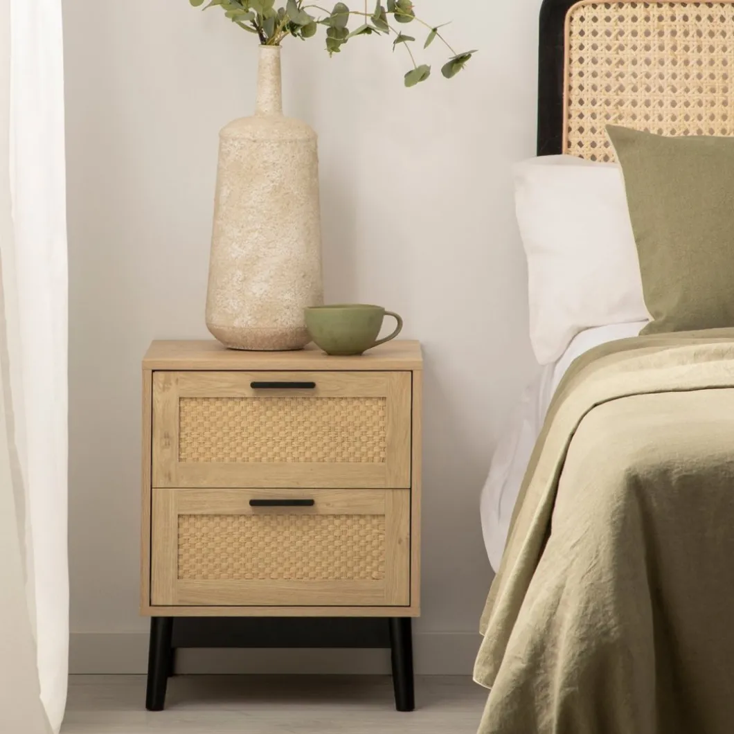 Transforma tu dormitorio en un espacio acogedor y con estilo con la mesita de noche Samoa en madera color natural y fibra natural. Con dos amplios cajones, esta pieza ofrece un generoso espacio de almacenamiento para ropa, accesorios y objetos personales. Ideal para quienes buscan una pieza versátil y atemporal que complemente la decoración de su hogar.