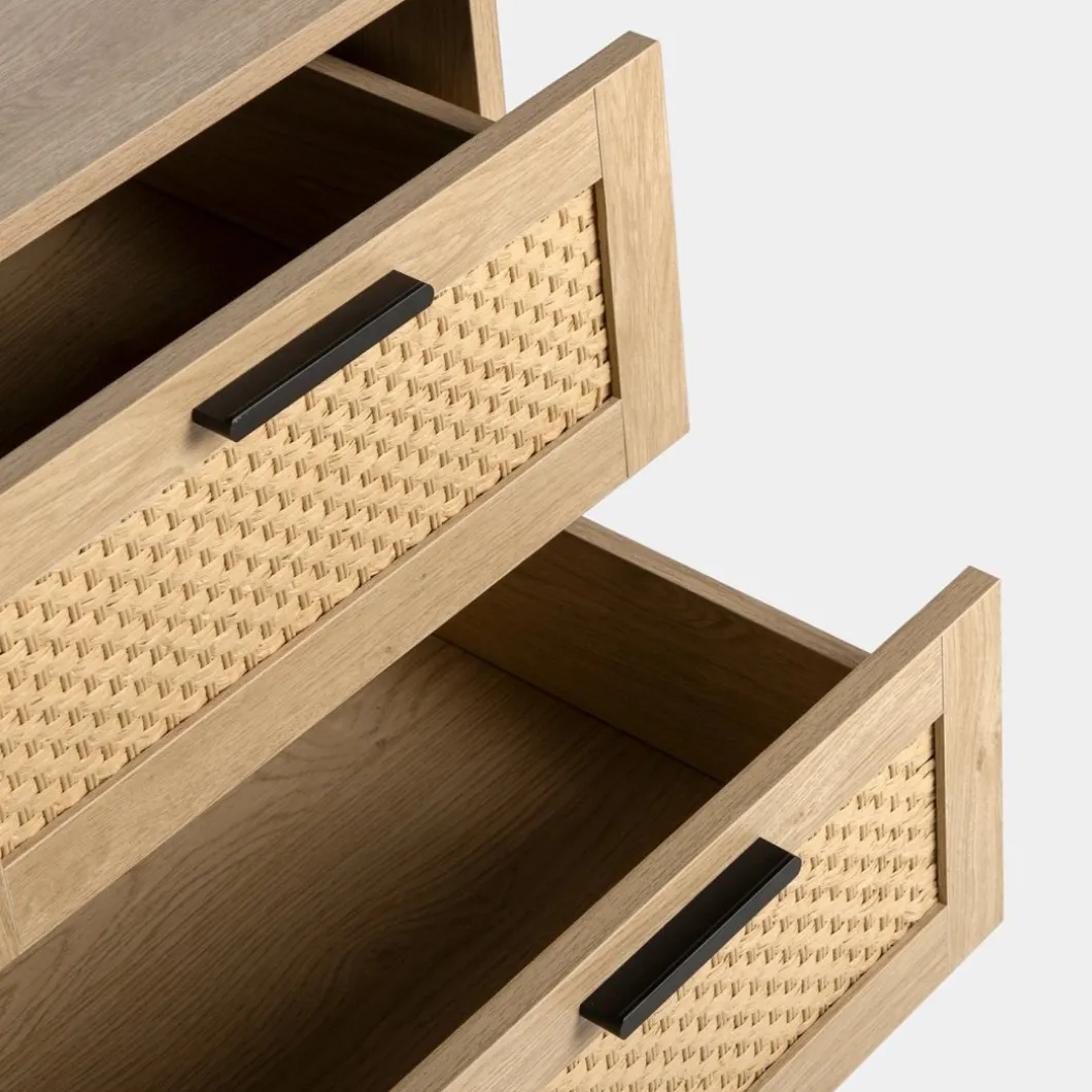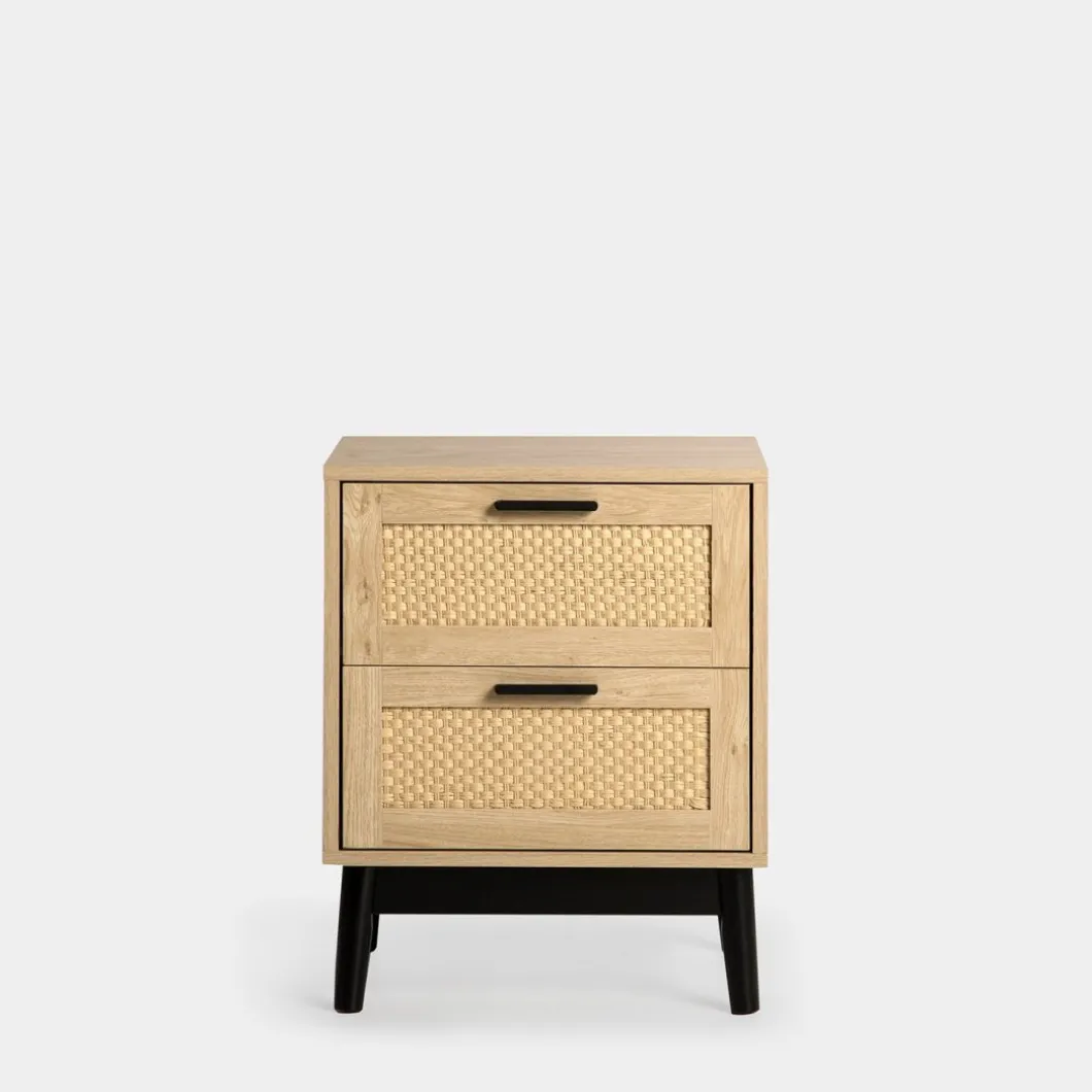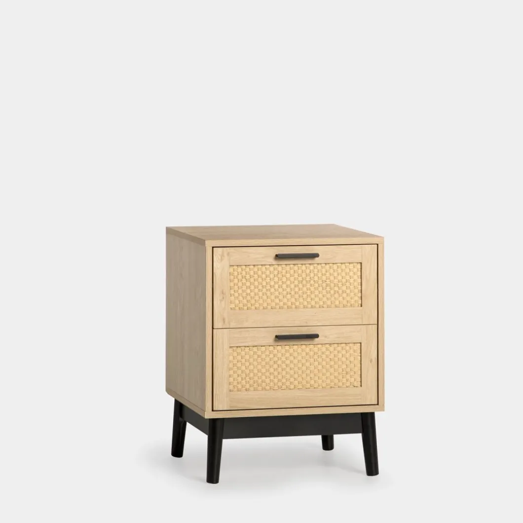 Transforma tu dormitorio en un espacio acogedor y con estilo con la mesita de noche Samoa en madera color natural y fibra natural. Con dos amplios cajones, esta pieza ofrece un generoso espacio de almacenamiento para ropa, accesorios y objetos personales. Ideal para quienes buscan una pieza versátil y atemporal que complemente la decoración de su hogar.