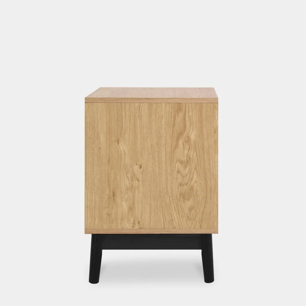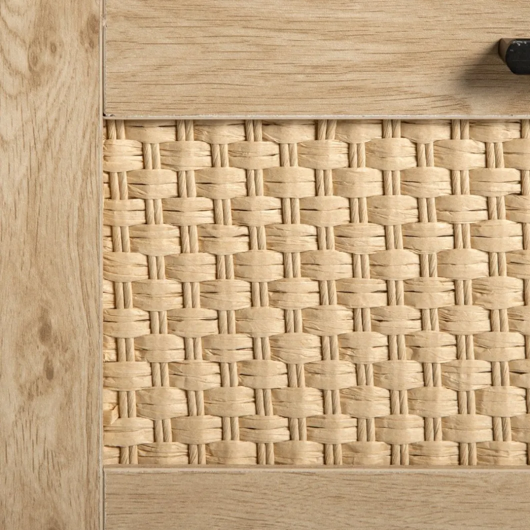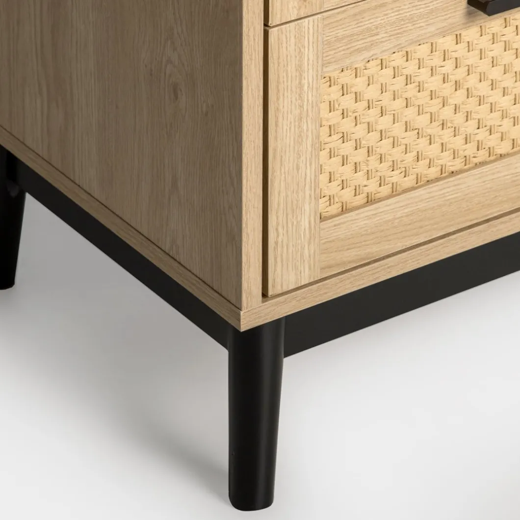 Transforma tu dormitorio en un espacio acogedor y con estilo con la mesita de noche Samoa en madera color natural y fibra natural. Con dos amplios cajones, esta pieza ofrece un generoso espacio de almacenamiento para ropa, accesorios y objetos personales. Ideal para quienes buscan una pieza versátil y atemporal que complemente la decoración de su hogar.