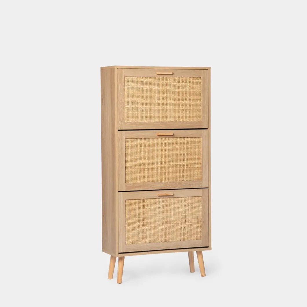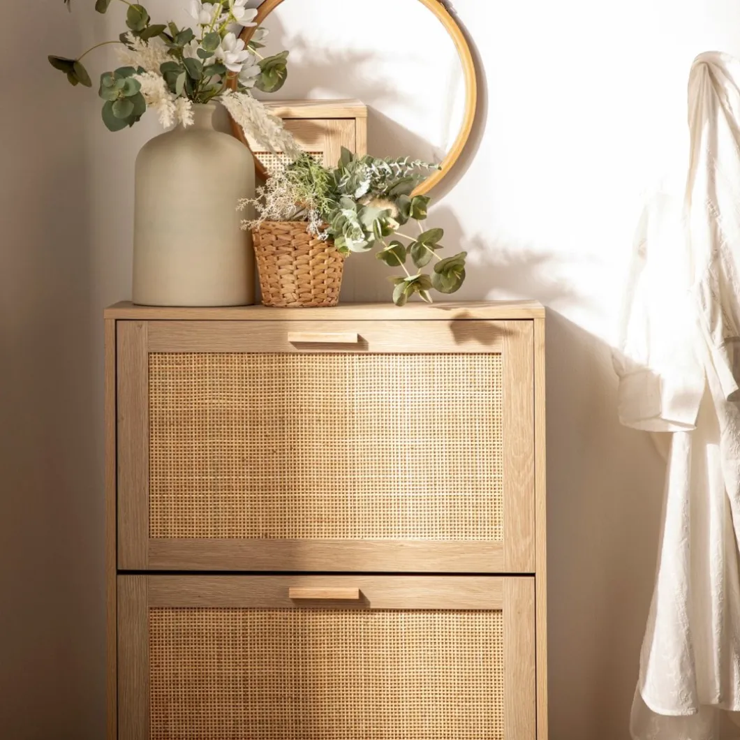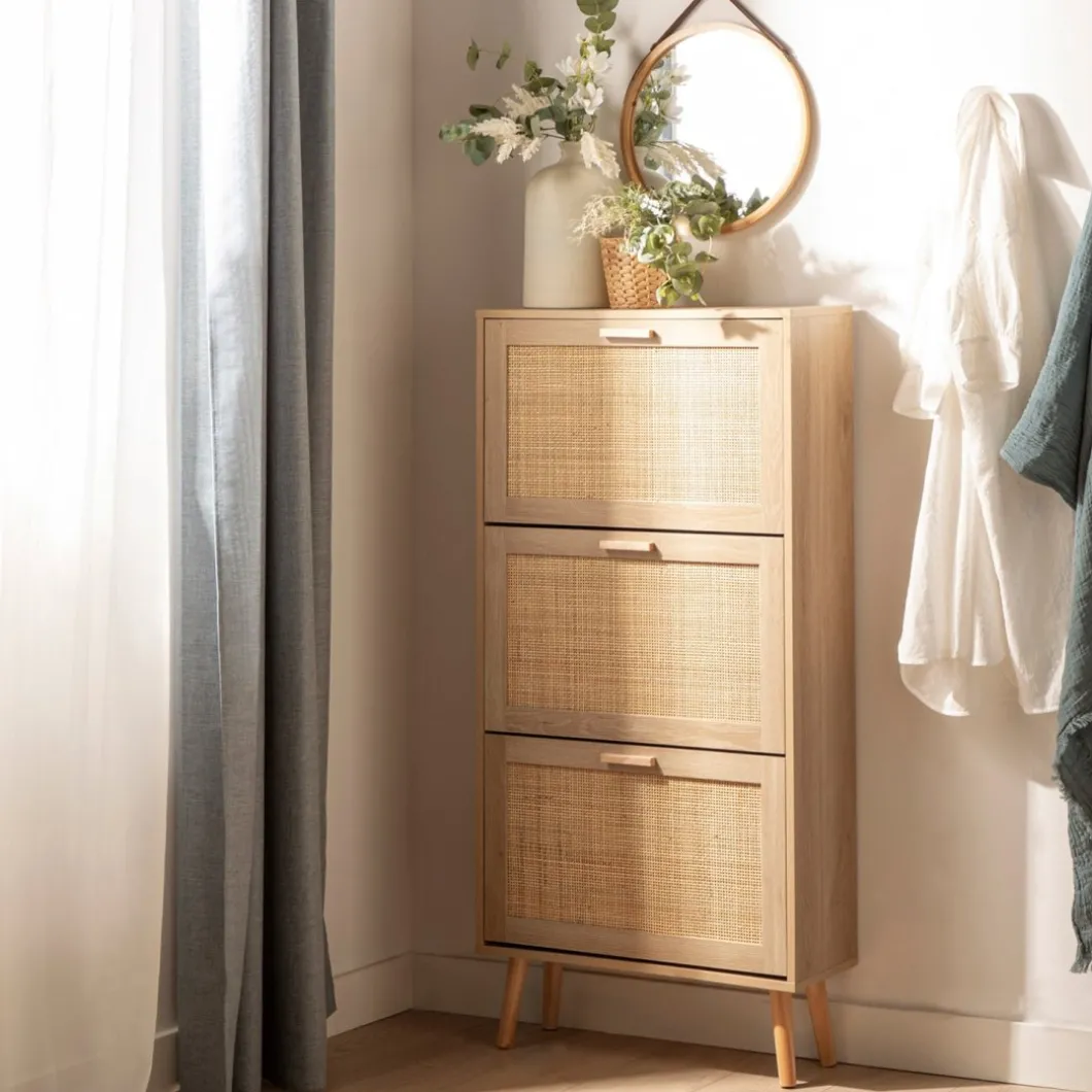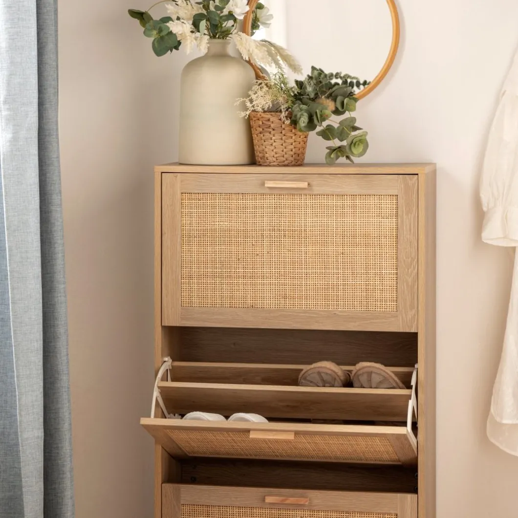 Mantén tus zapatos organizados y accesibles con el zapatero estrecho en ratán natural Tahiti. Sus tres puertas abatibles ofrecen generoso espacio para almacenar hasta 15 pares de zapatos, asegurando que tengas tu calzado favorito siempre a mano. Además, cada contenedor cuenta con un separador extraíble, lo que te permite adaptar el espacio para guardar calzado de mayor volumen con facilidad. Este zapatero fusiona funcionalidad y estilo de forma impecable, convirtiéndose en una pieza indispensable para tu hogar.