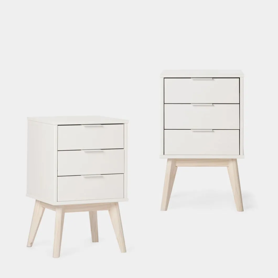 ¡Aprovéchate de este pack de 2 mesitas! La mesita de noche lacada en blanco Troy de 3 cajones y patas en madera de pino natural es perfecta para conseguir almacenaje extra y mantener tu dormitorio limpio y ordenado. Gracias a su diseño sencillo y atemporal encaja en cualquier estilo decorativo.