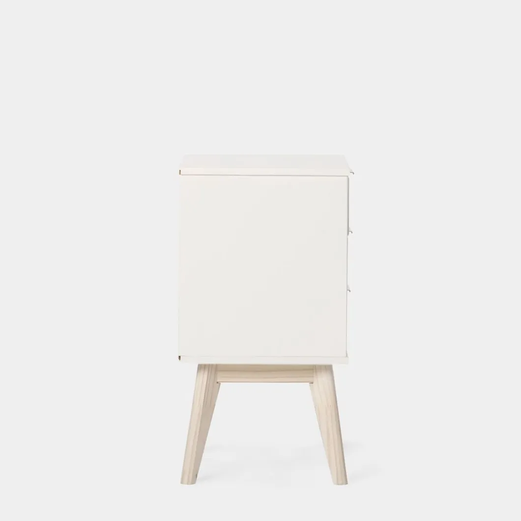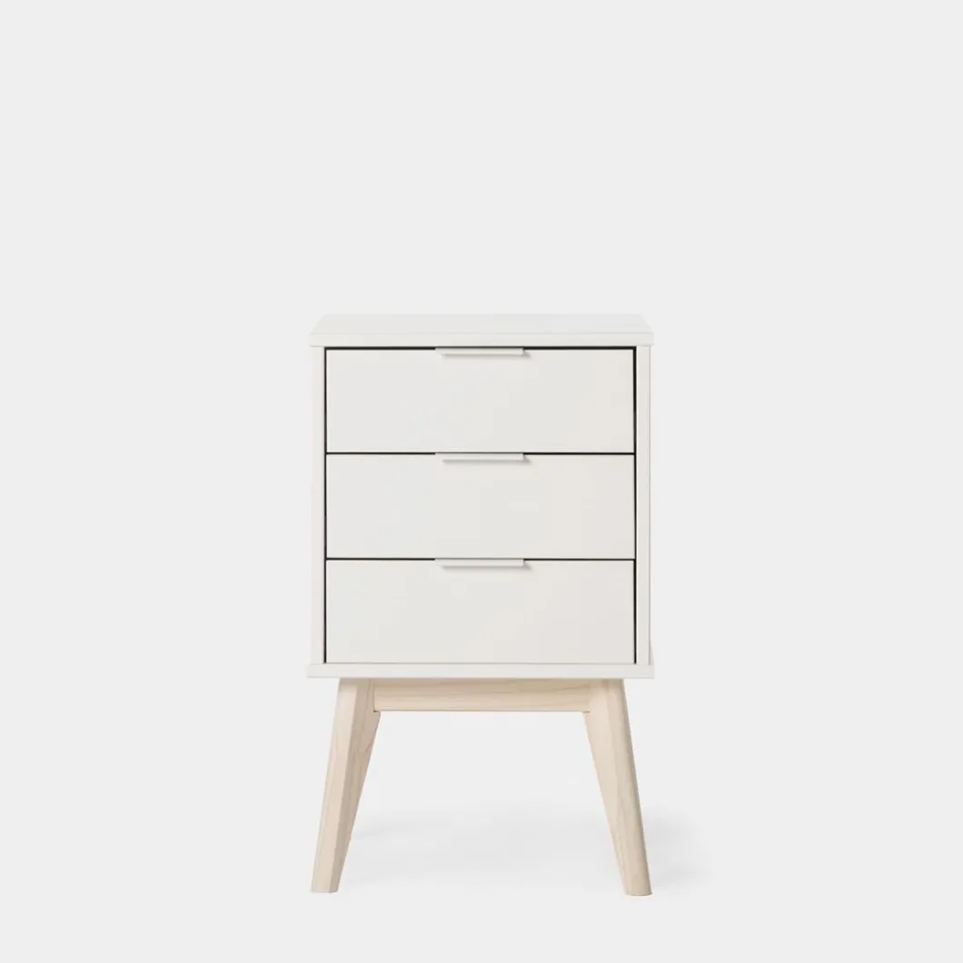 La mesita de noche lacada en blanco Troy de 3 cajones y patas en madera de pino natural es perfecta para conseguir almacenaje extra y mantener tu dormitorio limpio y ordenado. Gracias a su diseño sencillo y atemporal encaja en cualquier estilo decorativo.