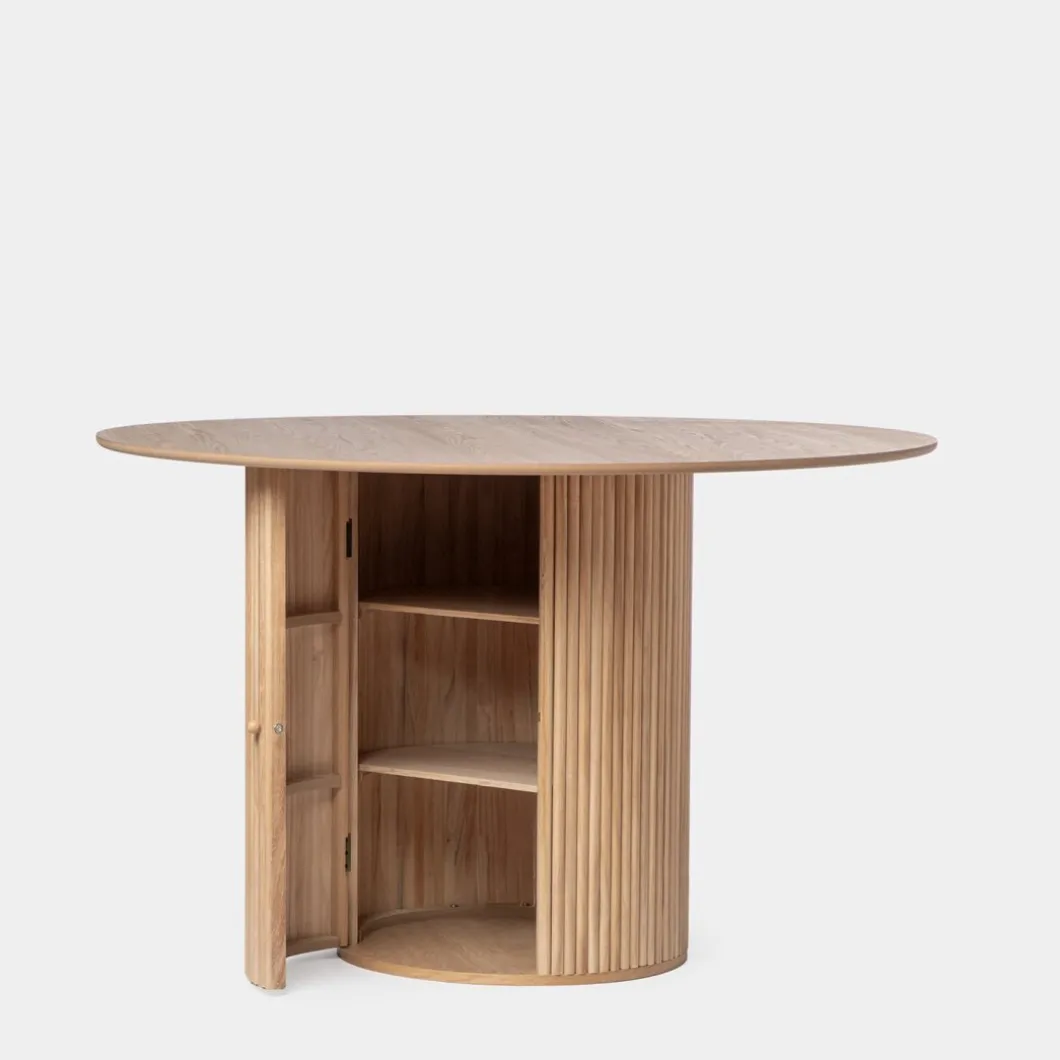 Añade a tu hogar un toque de tendencia y estilo con la mesa de comedor redonda Vemi, elaborada en chapa de fresno y madera maciza. Cuenta con un práctico espacio de almacenaje integrado, perfecto para guardar parte del menaje del hogar de manera organizada. Con capacidad para hasta 6 comensales, es perfecta para reuniones familiares o cenas con amigos.