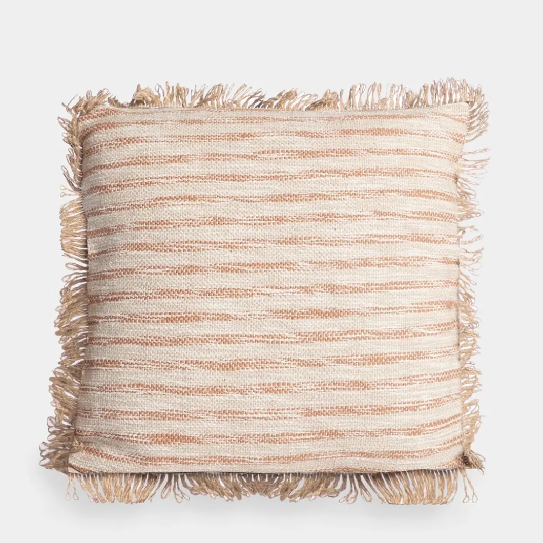 El cojín decorativo Xeda confeccionado en algodón en color beige y rayas en terracota es el elemento decorativo ideal para cualquier salón o dormitorio. Este cojín le dará un toque de color y luz al lugar donde lo sitúes, y es perfecto para combinar con cojines estampados.