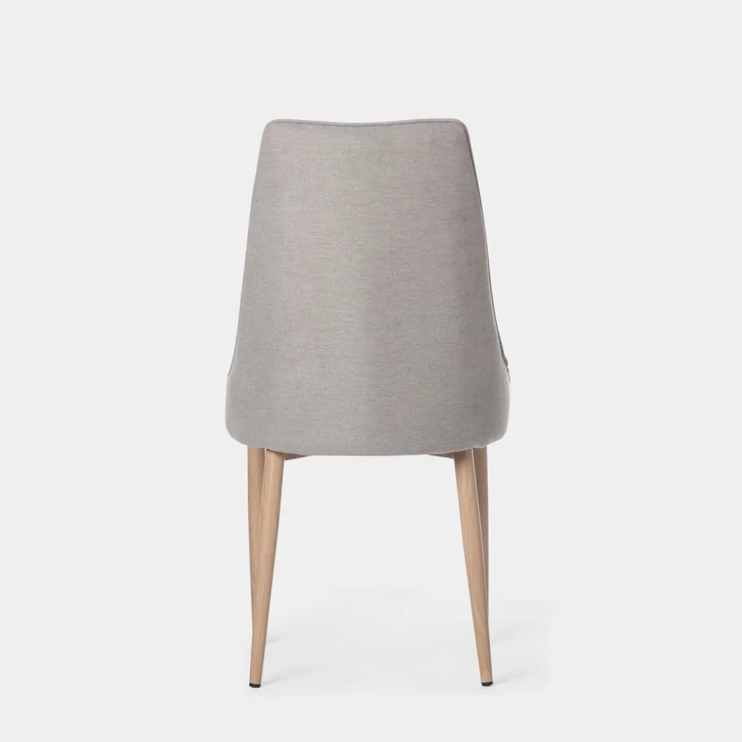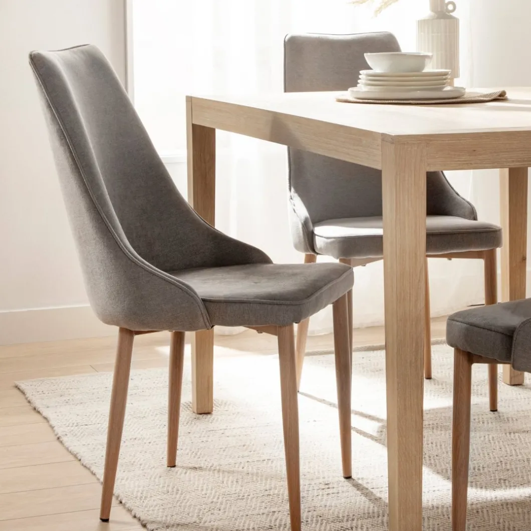 La silla de comedor Agnes tapizada en gris con pata natural presenta un diseño con un aire vintage y líneas completamente atemporales. Además de aportar elegancia y personalidad a tu comedor, su pequeña forma recogida en la zona lumbar le da una comodidad que hará de ella tu mejor aliada en las más largas sobremesas con familia o amigos.