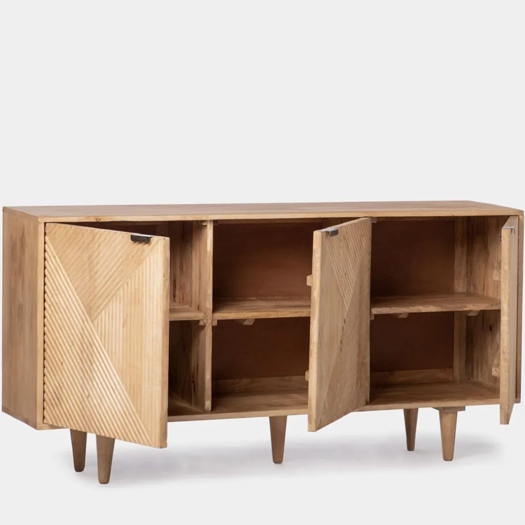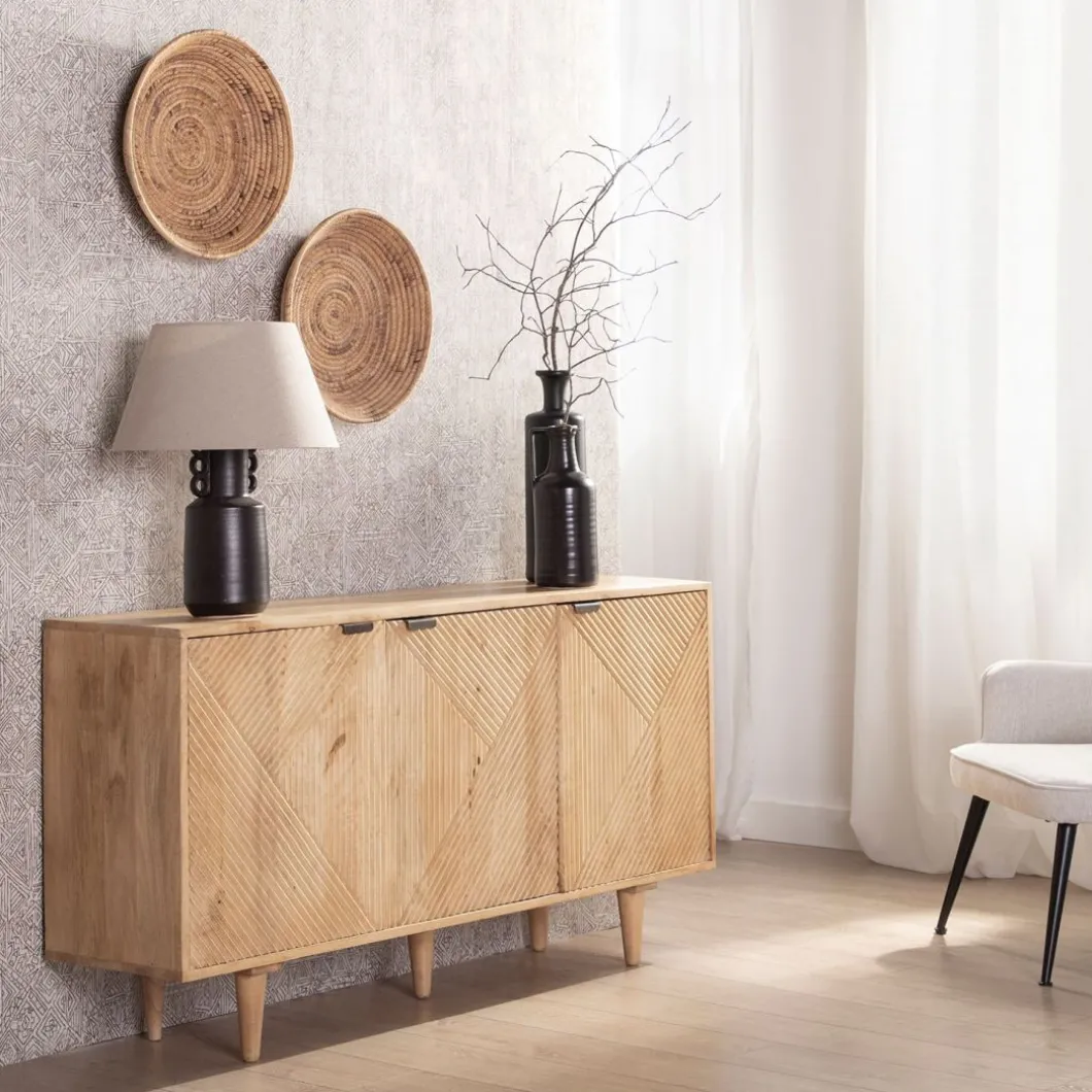 El aparador en madera de mango Arai es perfecto para conseguir un ambiente único y acogedor en tu salón. Es una pieza elaborada de manera artesanal, por lo que es única. Dispone de gran capacidad para poder almacenar tu mantelería o vajilla favorita. Para mayor estabilidad del mueble, aconsejamos su anclaje a la pared. Combínalo con el mueble de TV Arai y consigue el look completo.