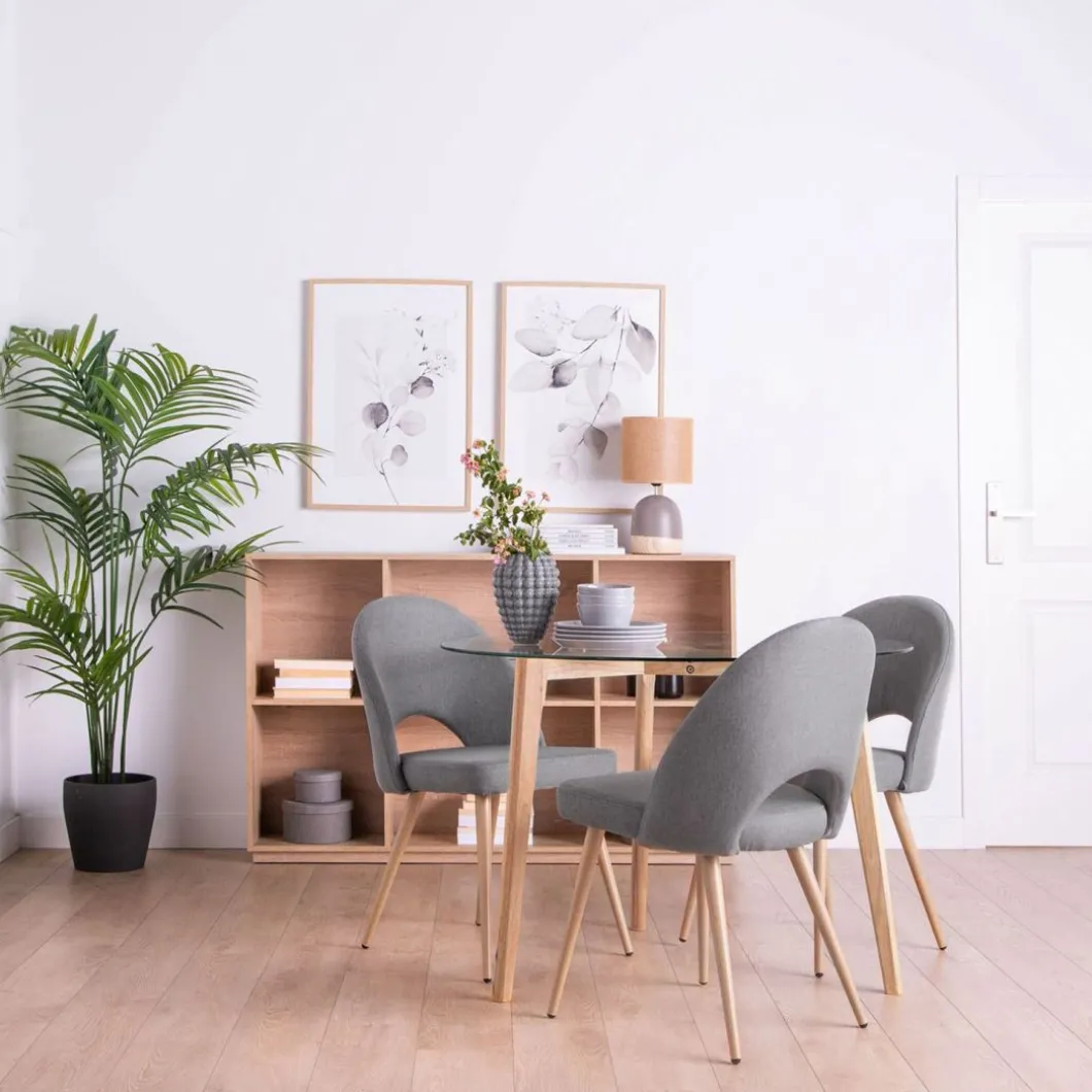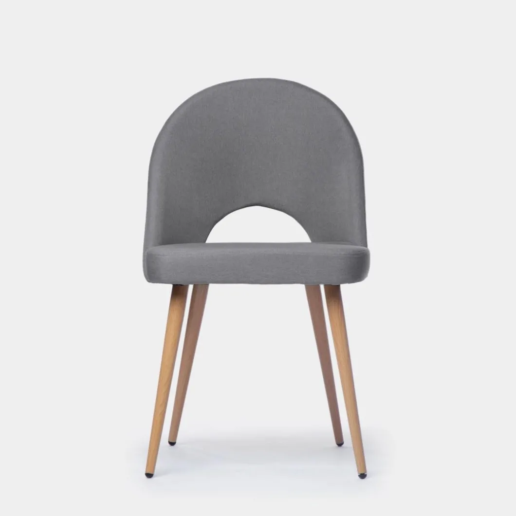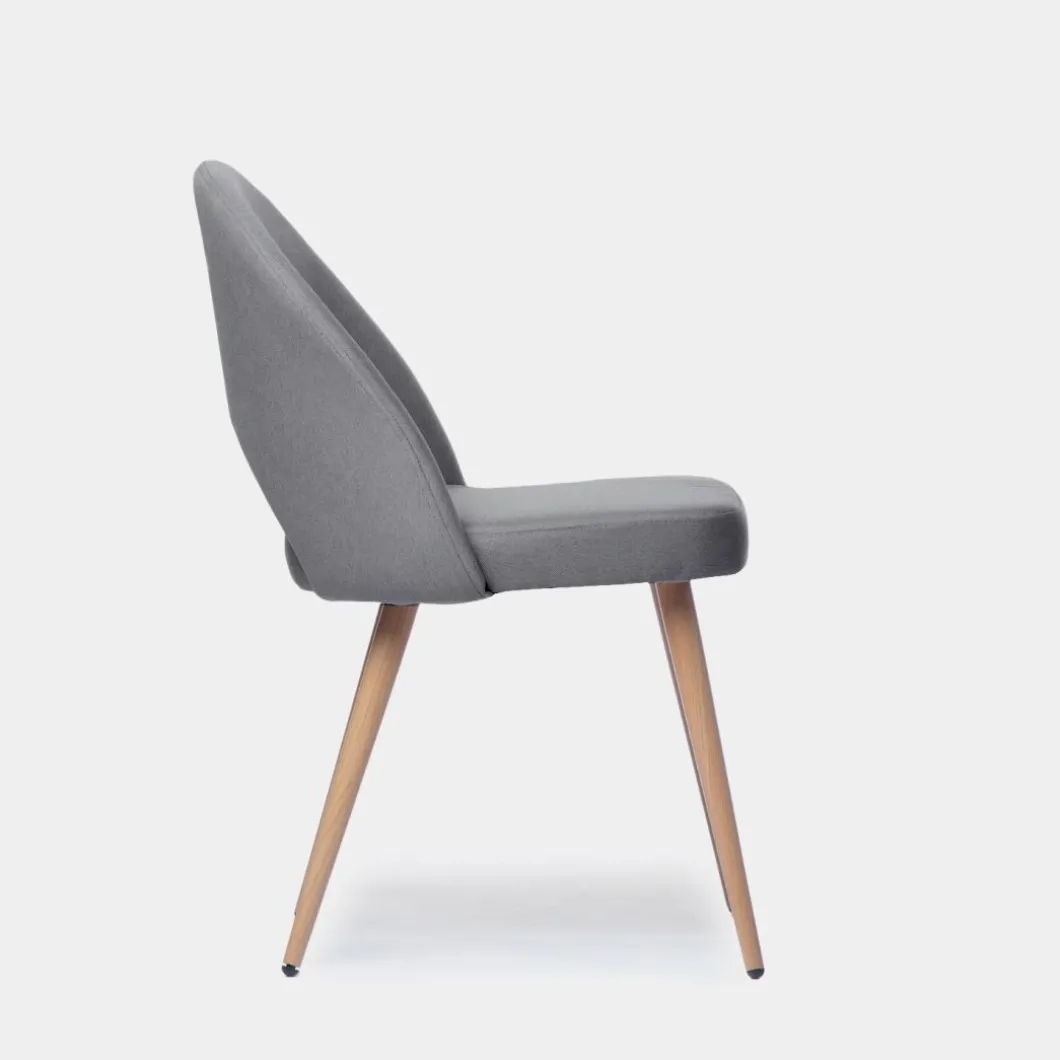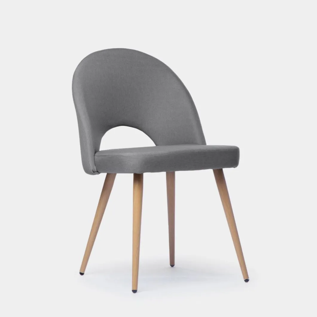 La silla de comedor tapizada Blair es una preciosa silla con respaldo ergonómico y apertura central fabricado en poliéster, lo que le aporta una sentada realmente confortable. Sus patas metálicas en efecto madera hacen de esta silla es una opción que encandilará a los amantes del diseño nórdico más actual. Elige entre los 4 colores disponibles en nuestra web y para darle un toque elegante a tu comedor.