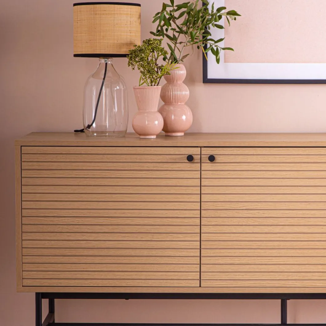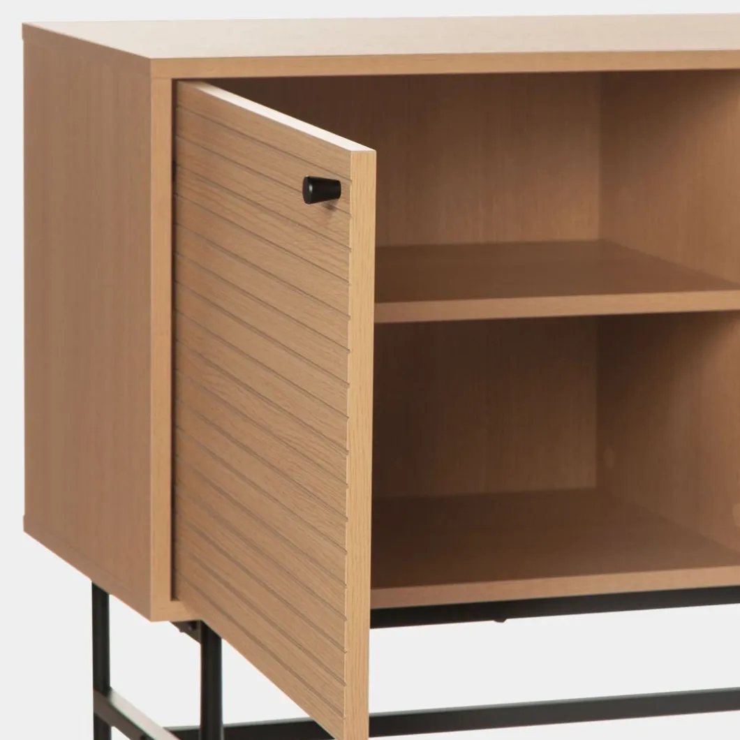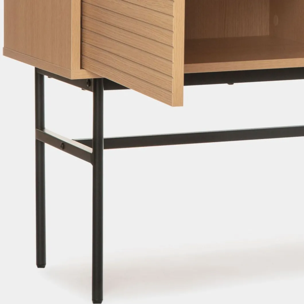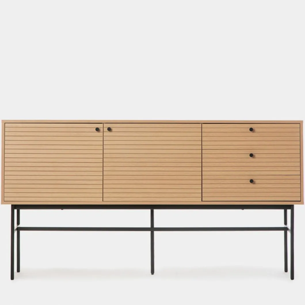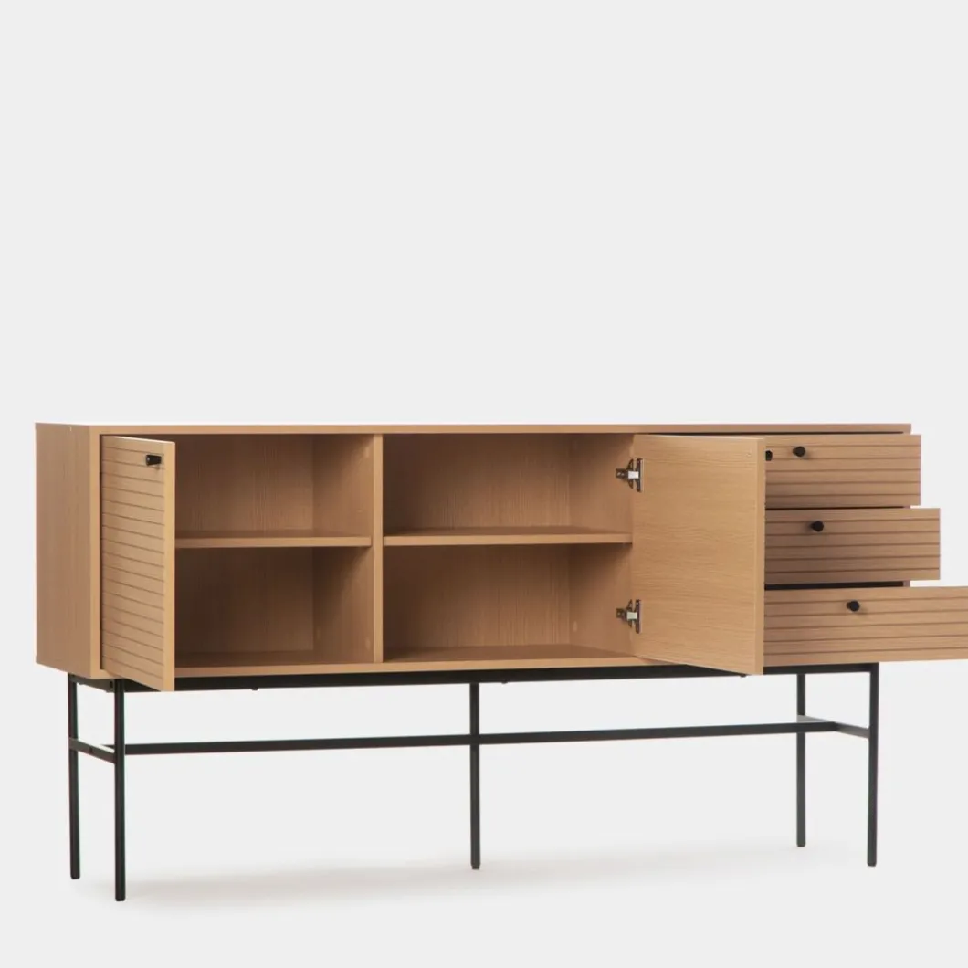 El aparador Bremen combina estilo industrial y actualidad. Su acabado en roble y sus patas fabricadas en metal negro le aportan tendencia. Está dotado de dos puertas y cajones en cuyo interior puedes guardar todo aquello que desees. Es una pieza de gran capacidad que puede emplazarse tanto en un comedor, como en un despacho u oficina. Para mayor estabilidad del mueble, aconsejamos su anclaje a la pared. Combínalo con otras piezas de la colección.
