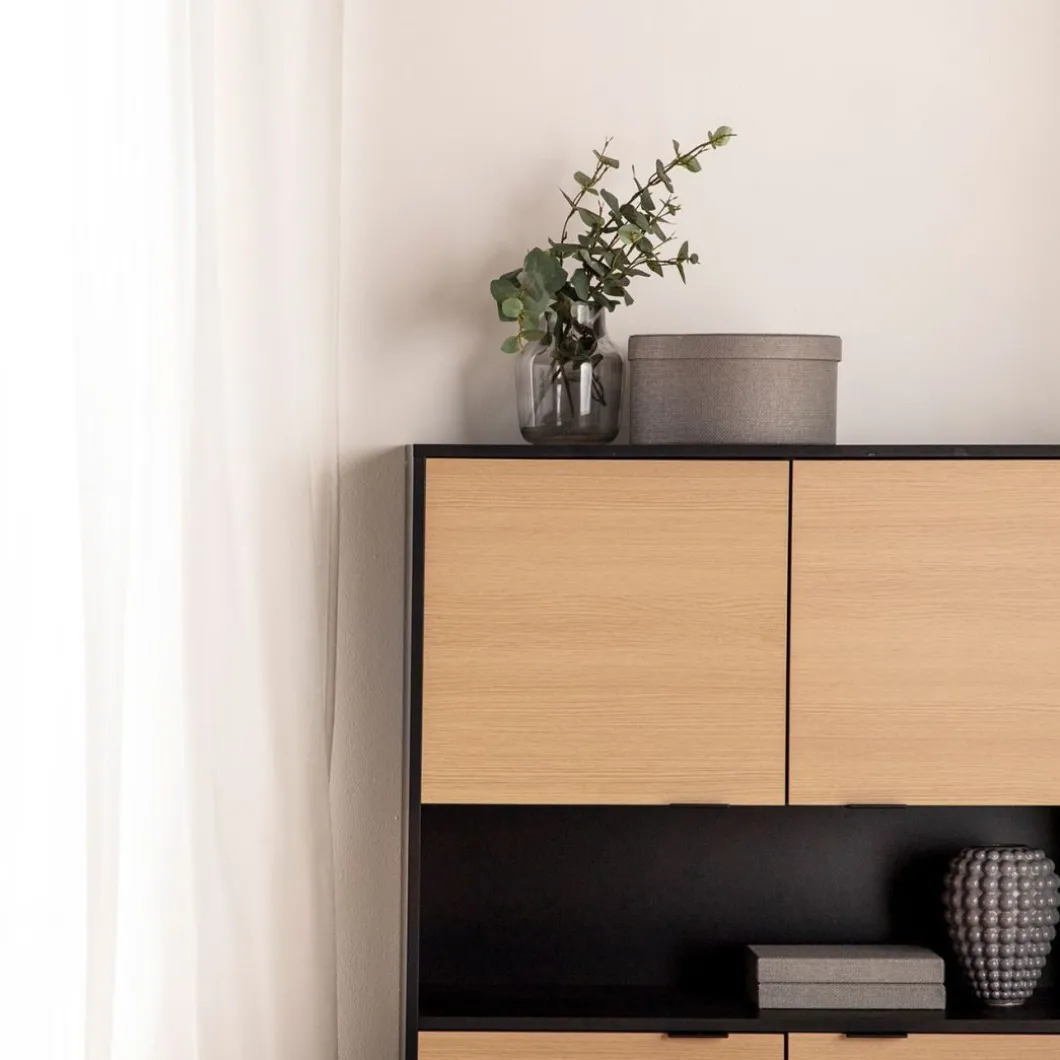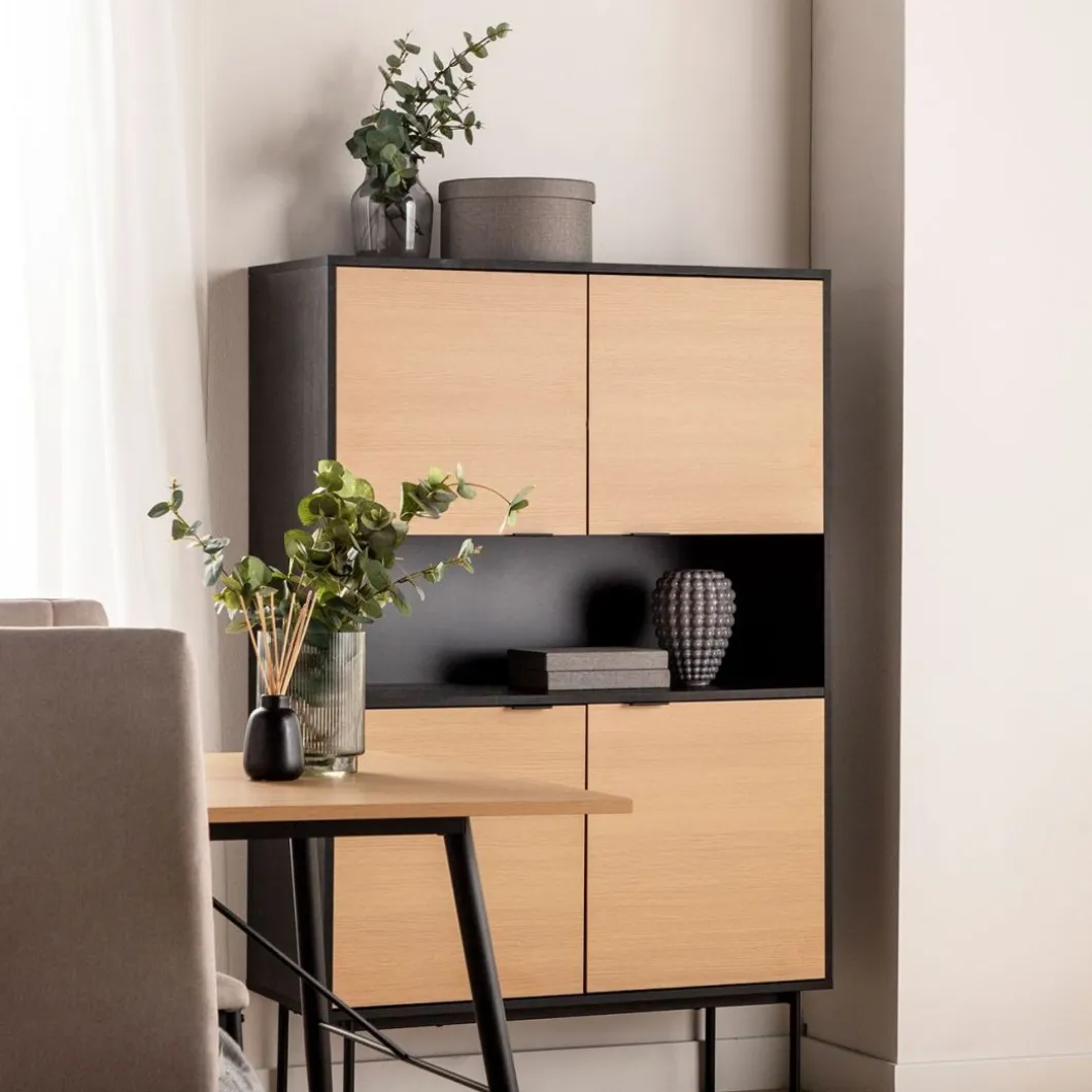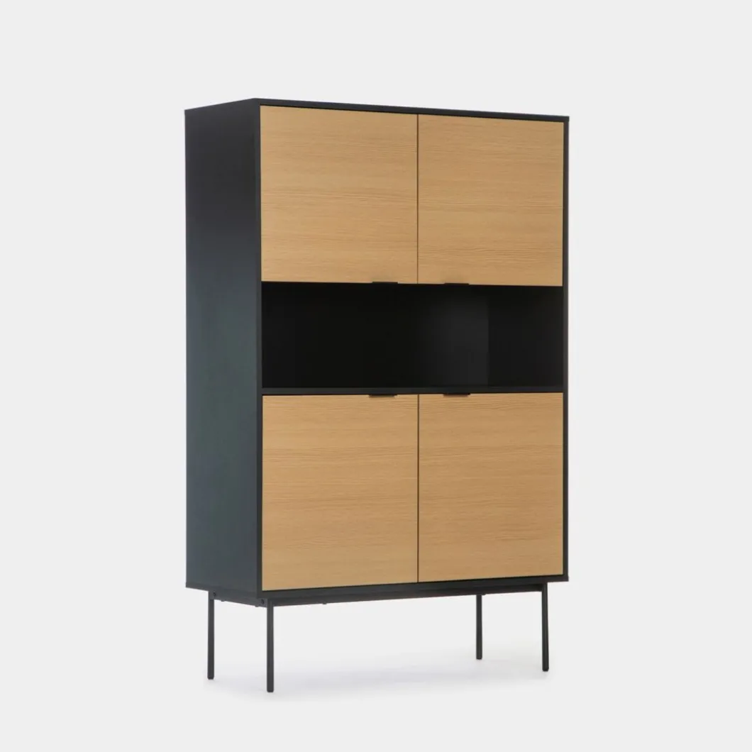 La vitrina Copenhague de estilo industrial derrocha tendencia, y es que la combinación de roble y negro es pura actualidad. Está dotada de cuatro puertas y baldas interiores dónde poder guardar lo que desees. Es una pieza de gran capacidad que puede emplazarse tanto en un comedor, como en un despacho u oficina.Para mayor estabilidad del mueble, aconsejamos su anclaje a la pared. Combínalo con otras piezas de la colección.