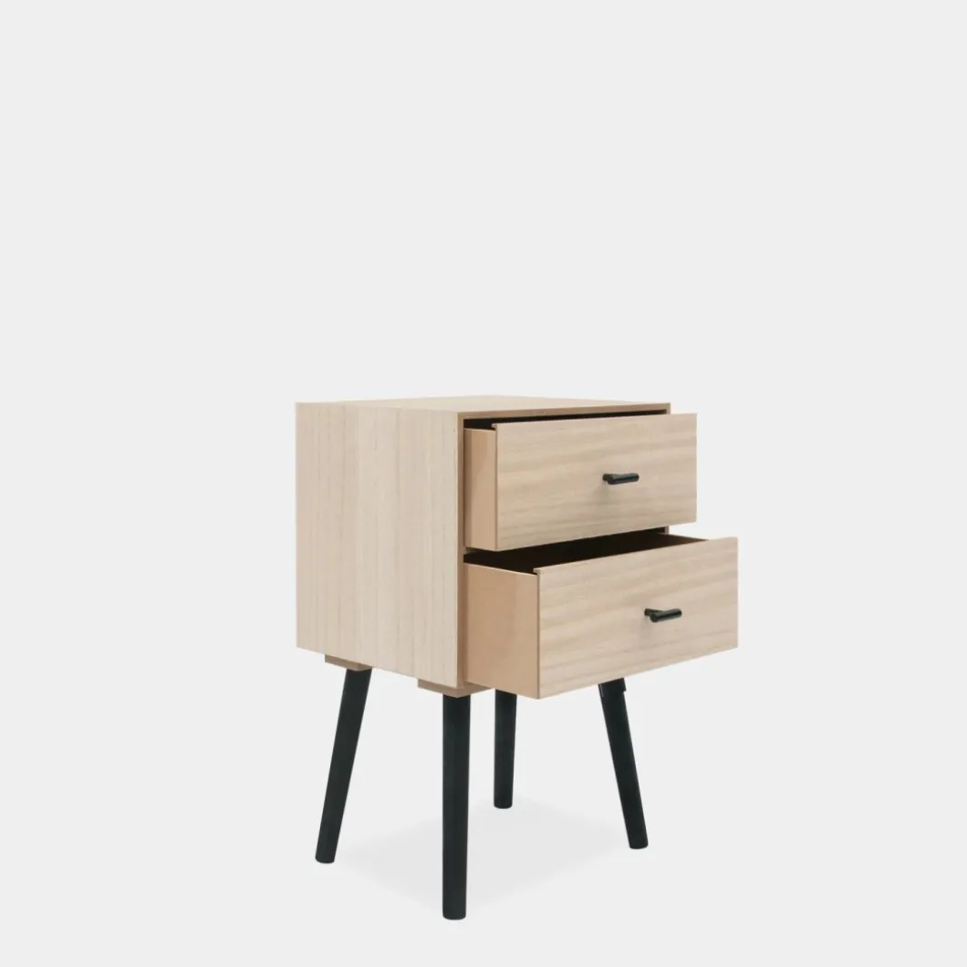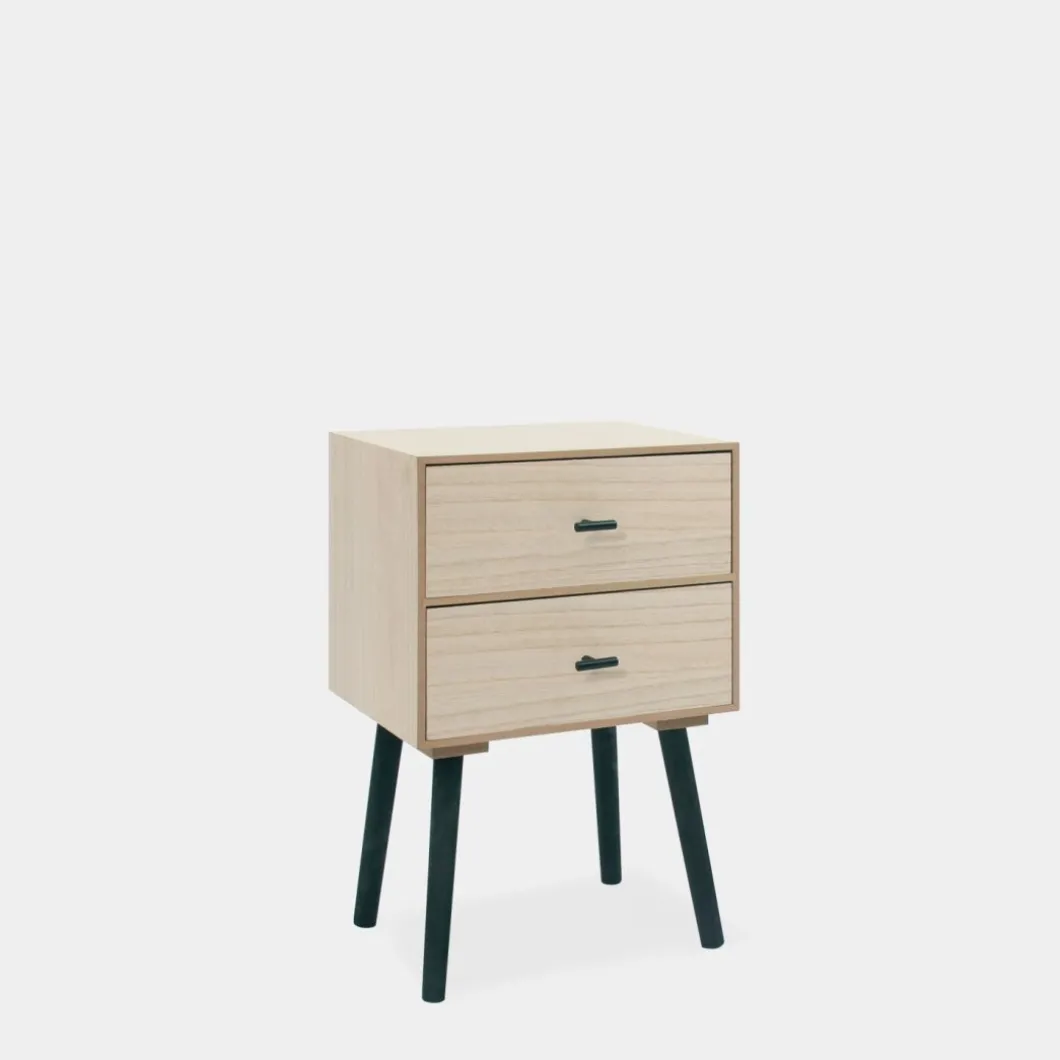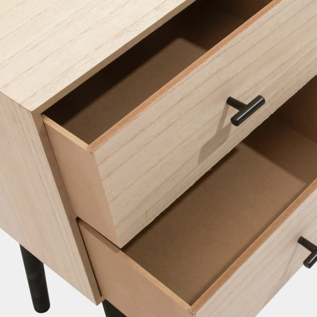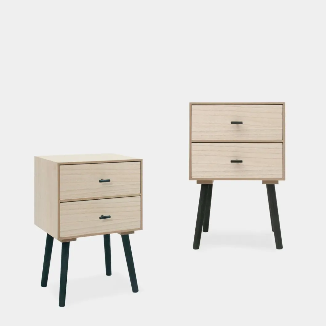 ¡Aprovéchate de este pack! Añade un toque distintivo y moderno a tu dormitorio con la mesita de noche de 2 cajones Dora, fabricada en chapa de paulownia. Sus dos cajones proporcionan un almacenamiento generoso, ideal para mantener tus objetos personales organizados y siempre a mano.