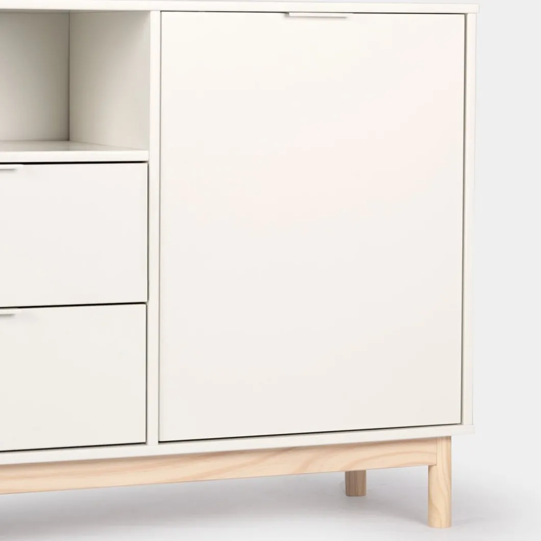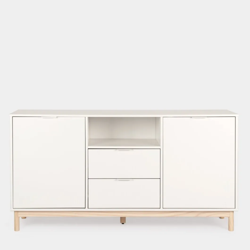El aparador lacado en color blanco Elian es la solución perfecta para el almacenaje en tu hogar. Con dos cajones, un amplio hueco y dos puertas, optimiza el espacio y mantiene el orden en tu salón. Completa tu salón combinándolo con otros muebles de la colección y consigue un espacio armonioso y acogedor.