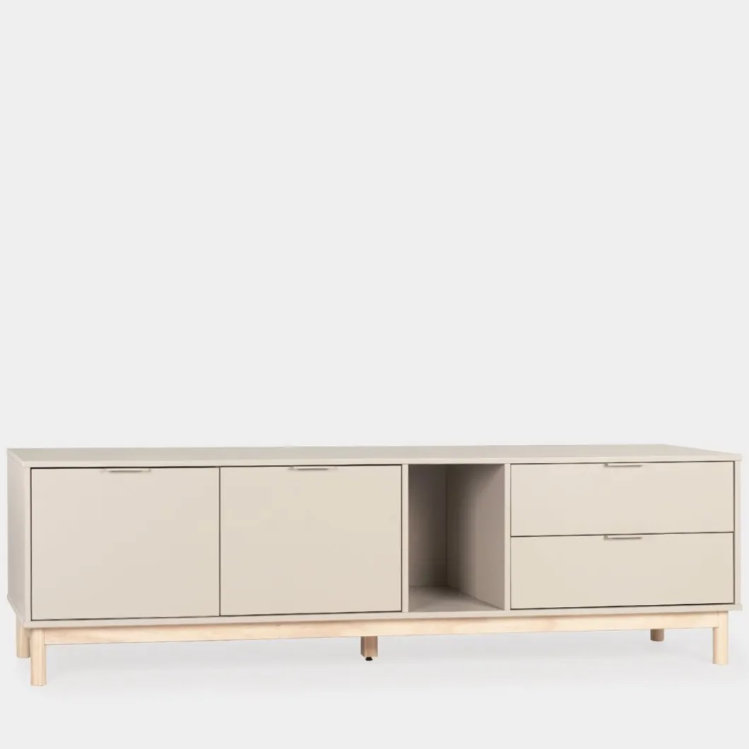 El mueble de TV lacado en color gris perla Elian es perfecto para añadir un toque nórdico y acogedor a tu hogar. Sus dos puertas, hueco y cajones te ofrecen la posibilidad de almacenar tus objetos de manera ordenada y accesible, manteniendo tu salón limpio y organizado. Combínalo con otros muebles de la colección para conseguir un look completo y armonioso.
