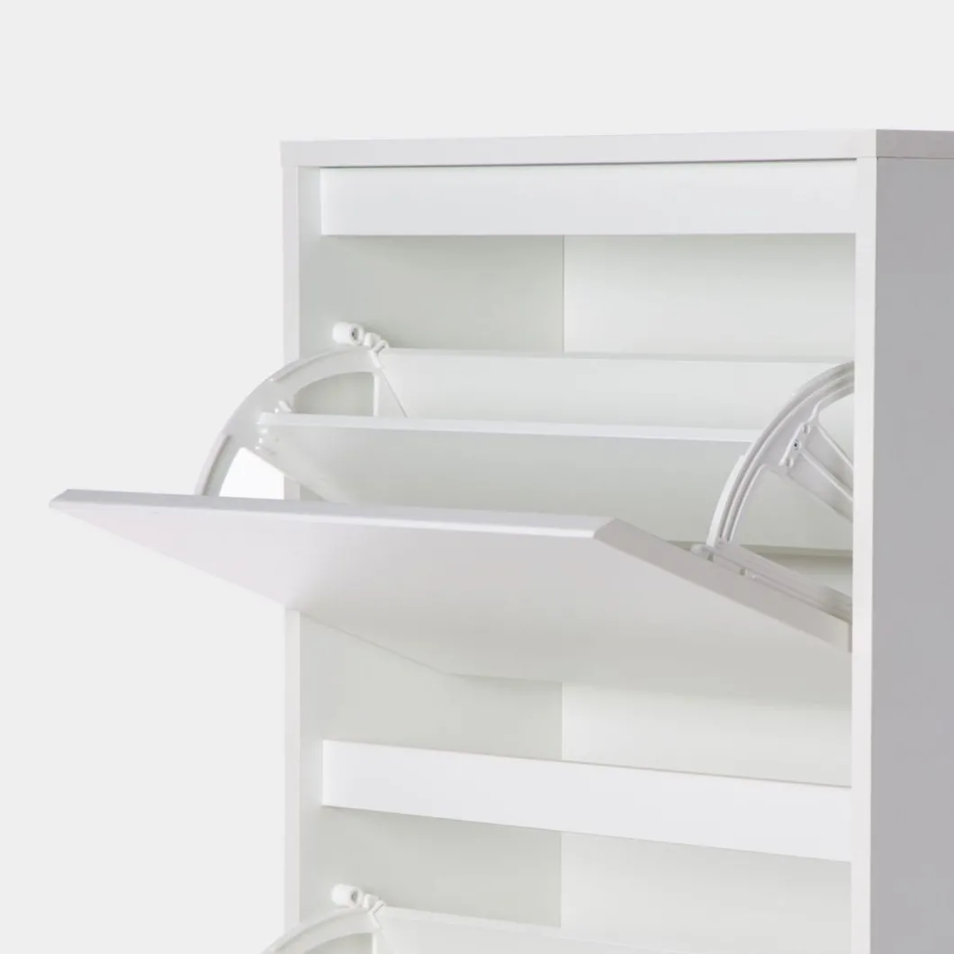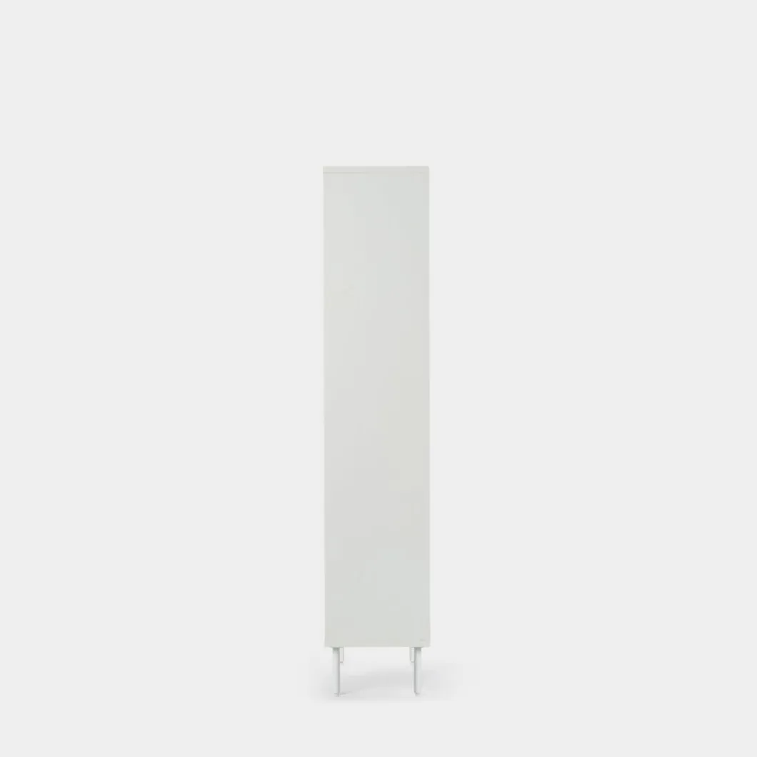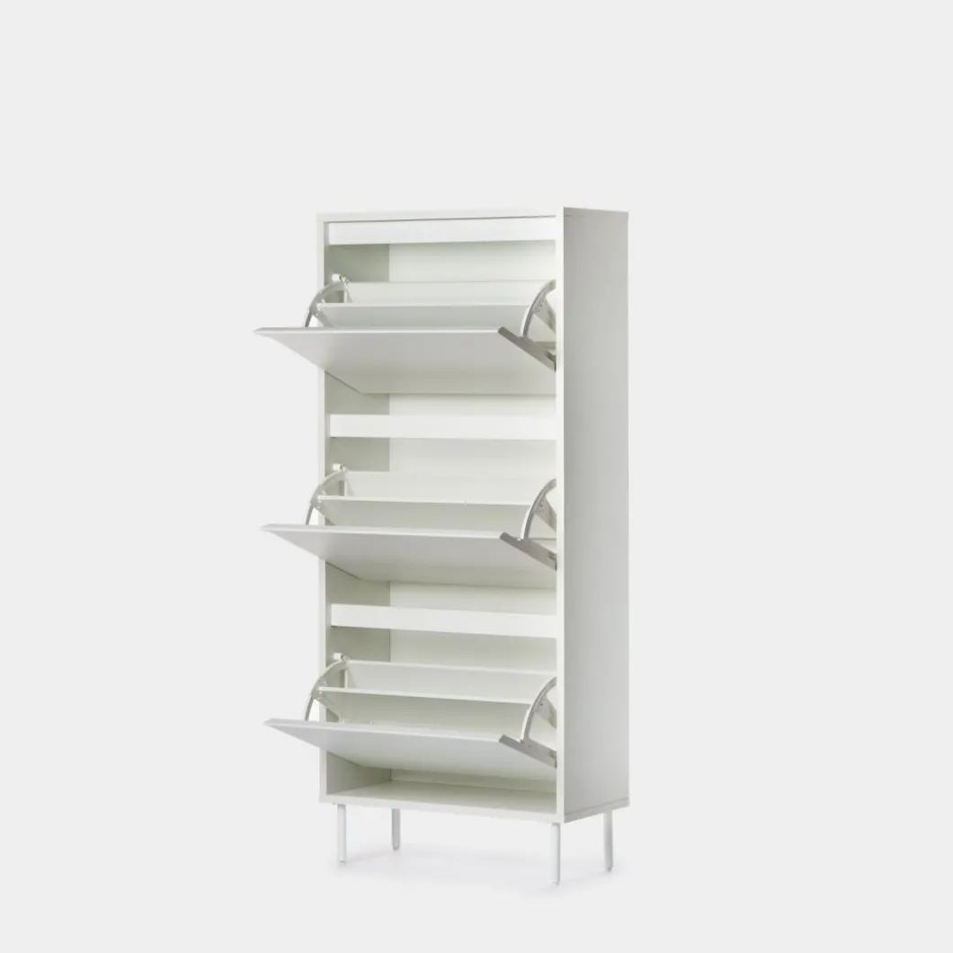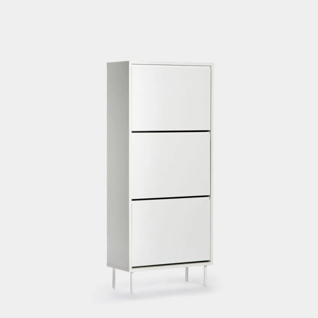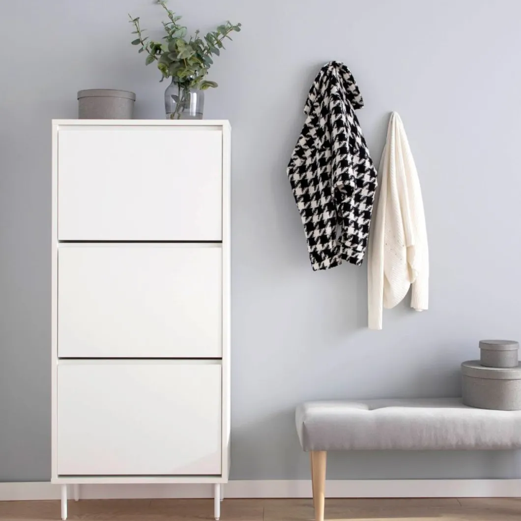 Aporta luminosidad y serenidad a tu hogar con el zapatero estrecho en madera color azul Esben. Sus tres puertas permiten almacenar hasta 11 pares de zapatos. Cada contenedor tiene un separador regulable y extraíble que permite almacenar calzado de mayor volumen. La talla máxima de zapatos que admite es el número 43. Su tamaño compacto lo hace ideal para zonas de pasillo, recibidores o dormitorios. Para mayor estabilidad del mueble, aconsejamos su anclaje a la pared. Visita el resto de la colección y completa el look.