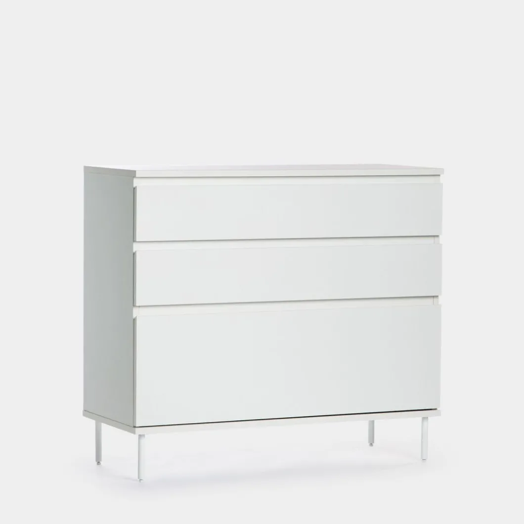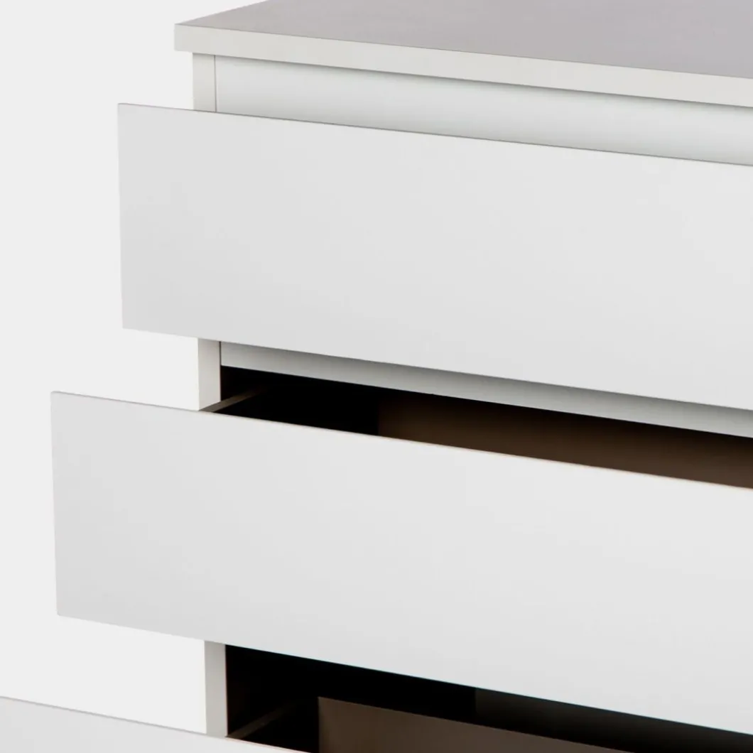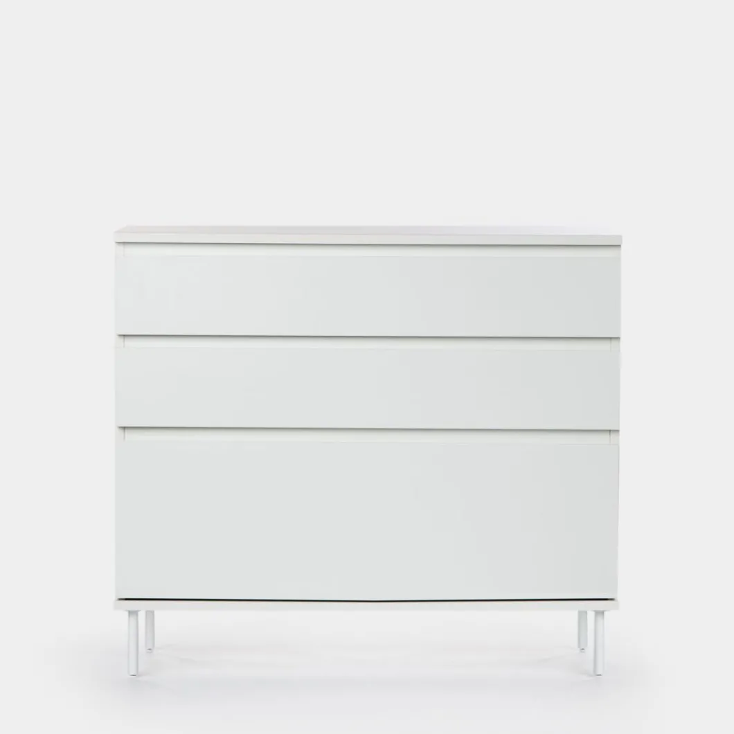 Completa la decoración de tu dormitorio con la cómoda en madera color blanco Esben. Cuenta con dos amplios cajones y un tercer cajón contenedor de mayor capacidad perfecto para almacenar ropa más voluminosa. Para mayor estabilidad del mueble, aconsejamos su anclaje a la pared.
