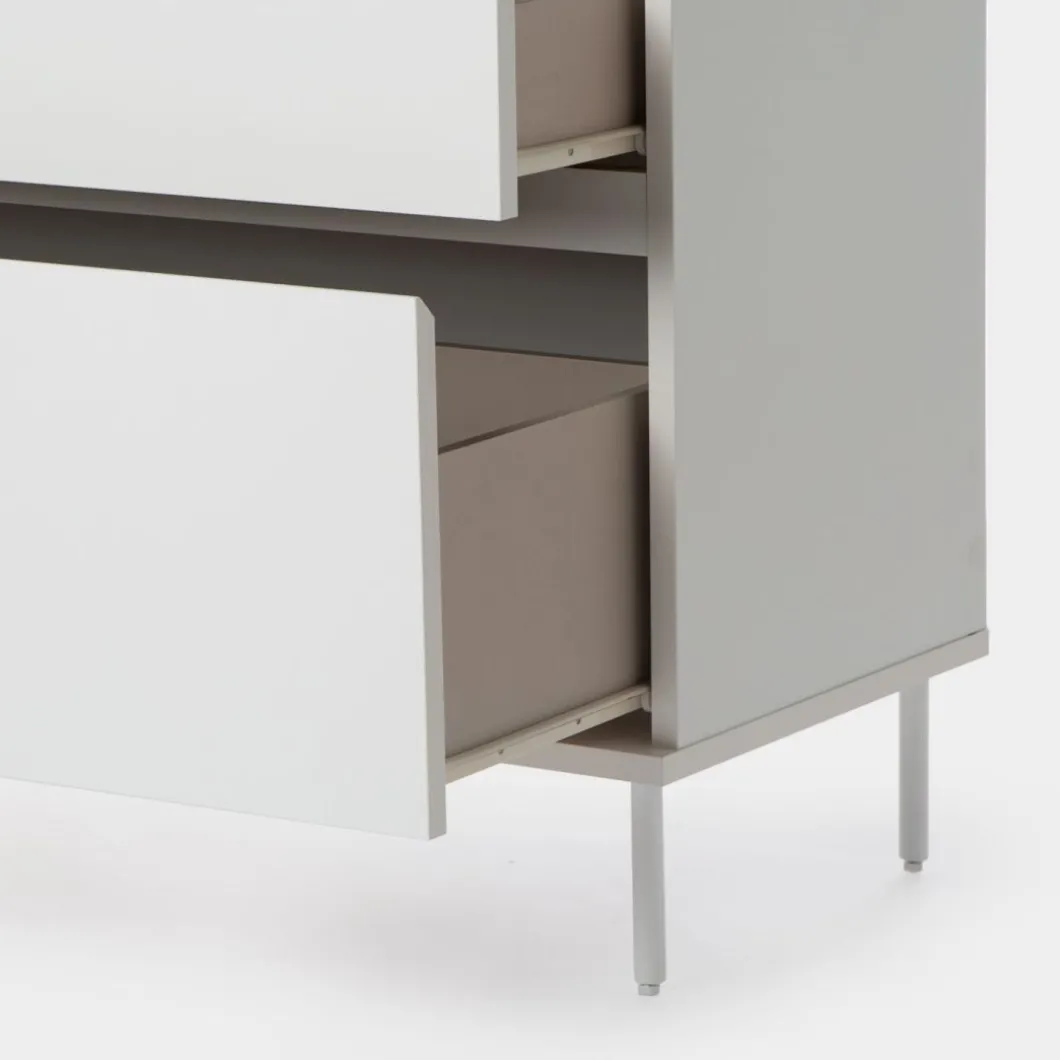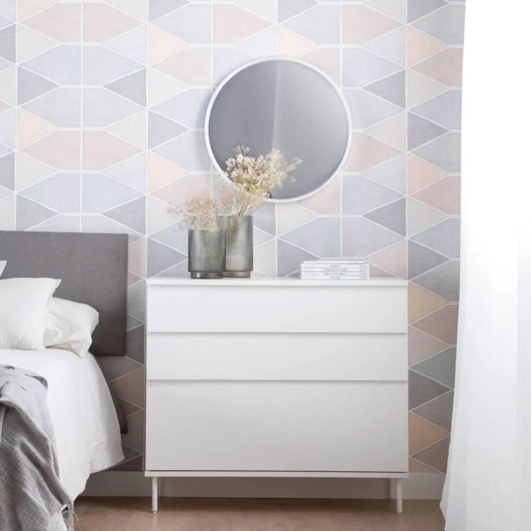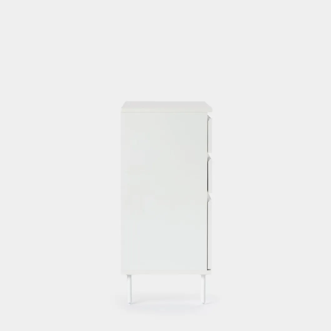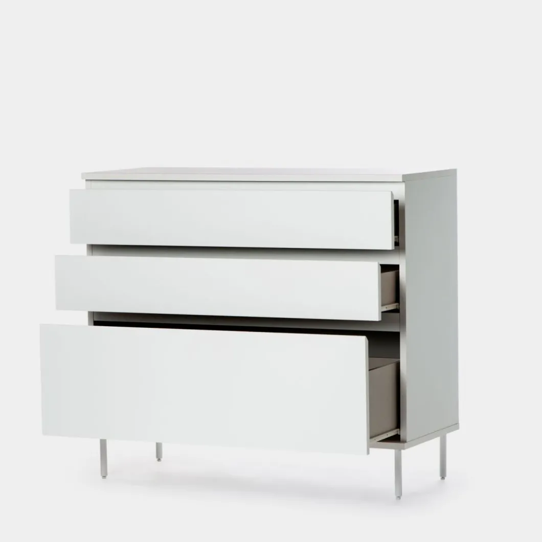 Completa la decoración de tu dormitorio con la cómoda en madera color blanco Esben. Cuenta con dos amplios cajones y un tercer cajón contenedor de mayor capacidad perfecto para almacenar ropa más voluminosa. Para mayor estabilidad del mueble, aconsejamos su anclaje a la pared.