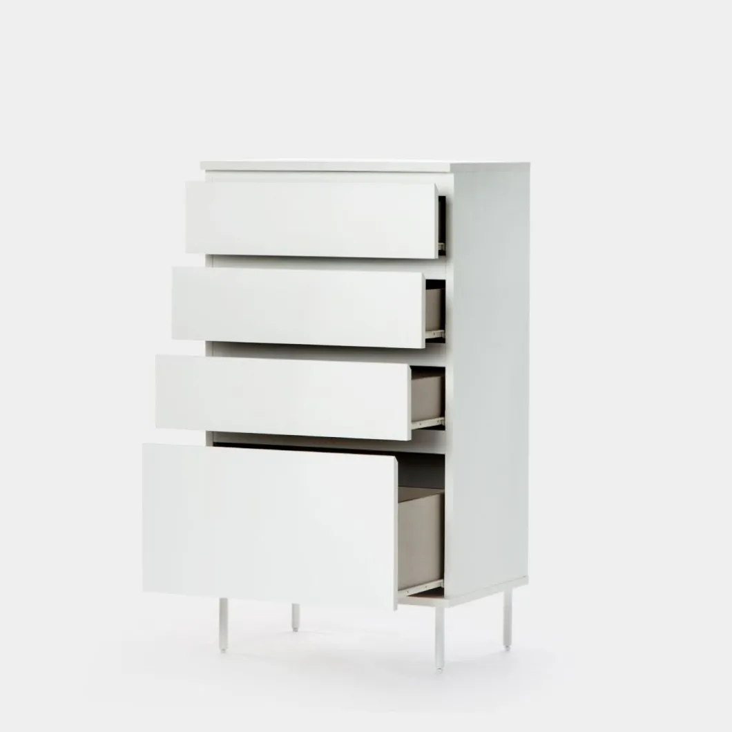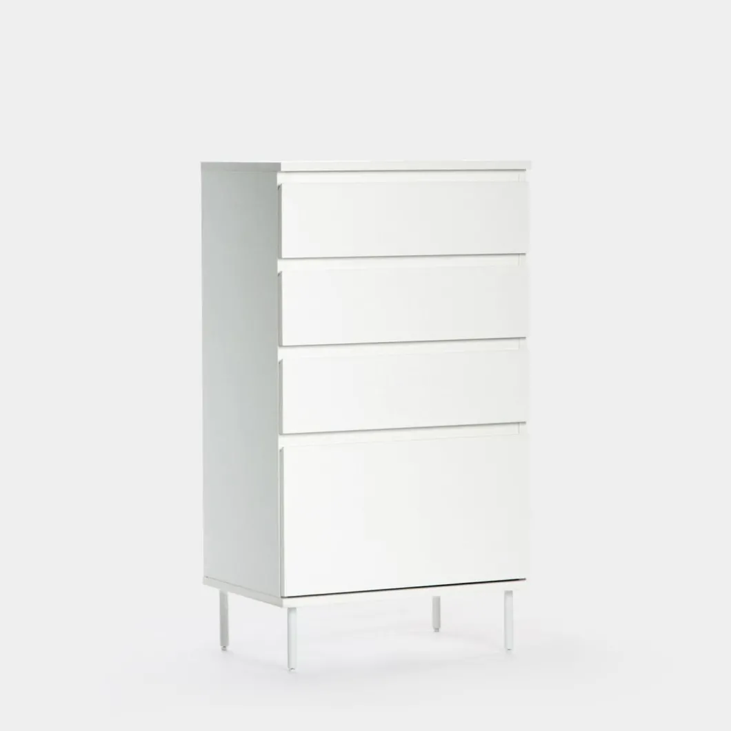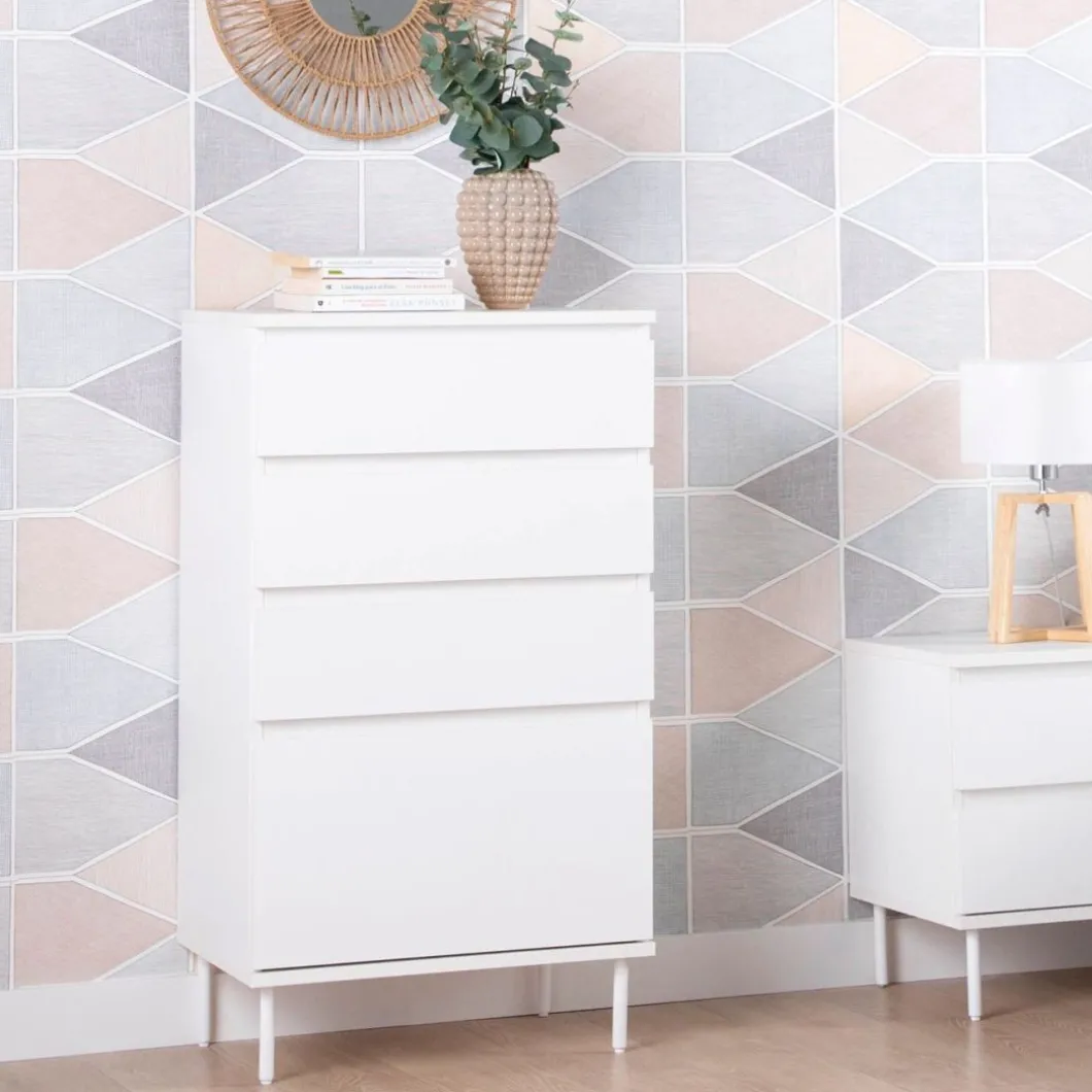 El sinfonier en madera color blanco Esben aportará luminosidad a tu dormitorio. Cuenta con cuatro cajones siendo el inferior de ellos más grande para que puedas almacenar sin ningún problema aquello que ocupa más volumen. ¡Haz que tu dormitorio sea de lo más especial! Para mayor estabilidad del mueble, asonsejamos su anclaje a la pared.