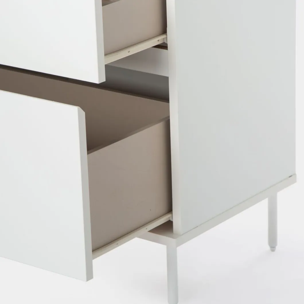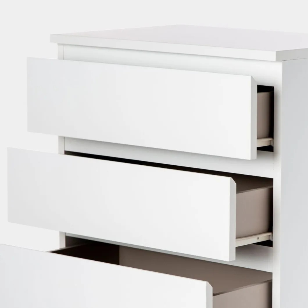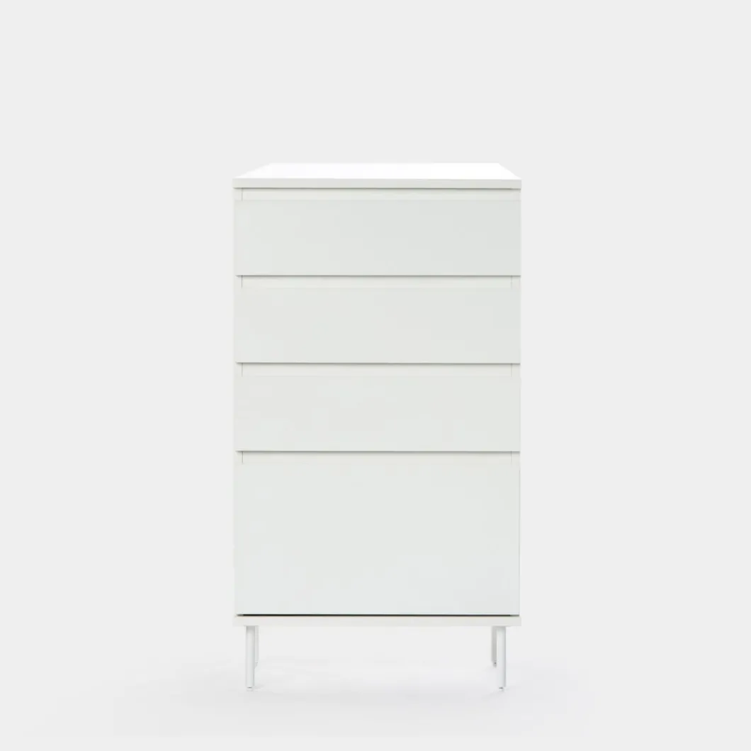 El sinfonier en madera color blanco Esben aportará luminosidad a tu dormitorio. Cuenta con cuatro cajones siendo el inferior de ellos más grande para que puedas almacenar sin ningún problema aquello que ocupa más volumen. ¡Haz que tu dormitorio sea de lo más especial! Para mayor estabilidad del mueble, asonsejamos su anclaje a la pared.
