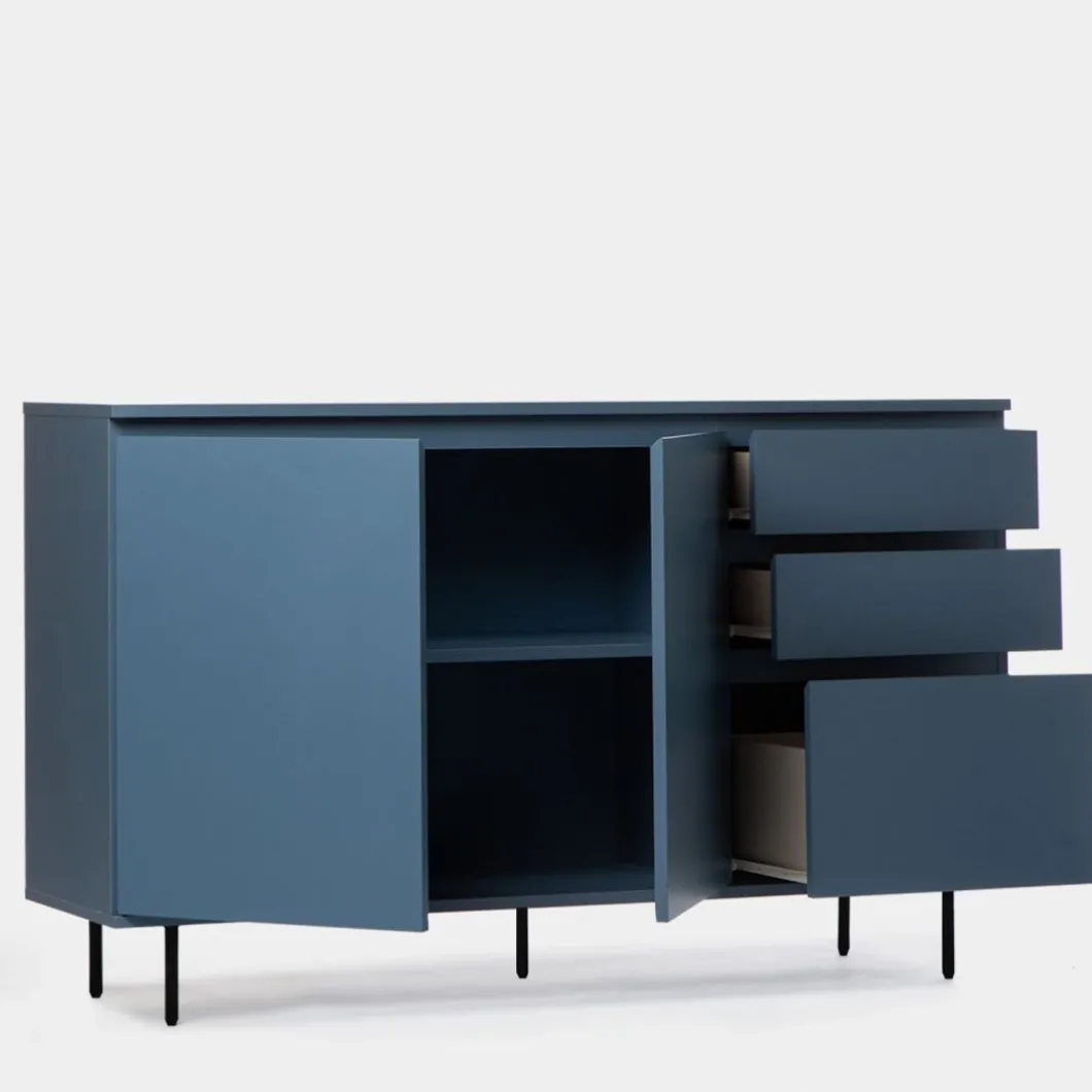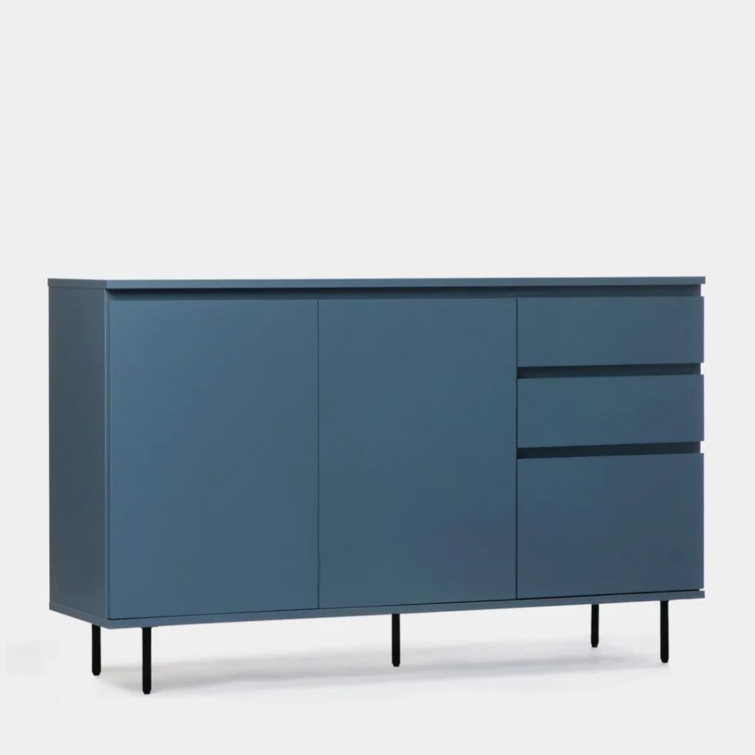 Aporta personalidad y color a tu hogar con el aparador en madera color azul Esben. Cuenta con dos puertas y tres cajones con tirador uñero integrado que permiten optimizar al máximo el espacio y mantener el orden. Para mayor estabilidad del mueble, aconsejamos su anclaje a la pared. Combínalo con otras piezas de la colección y consigue el look completo.