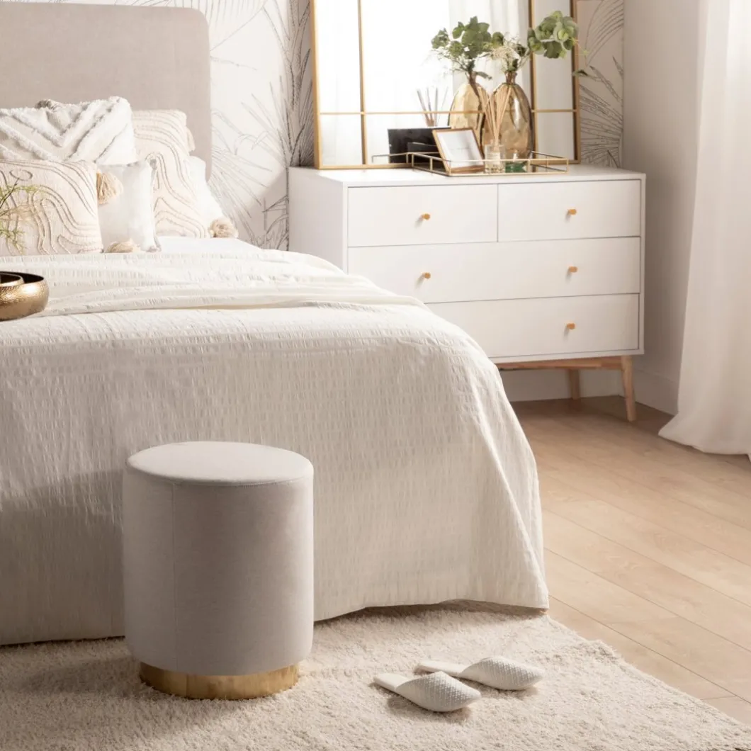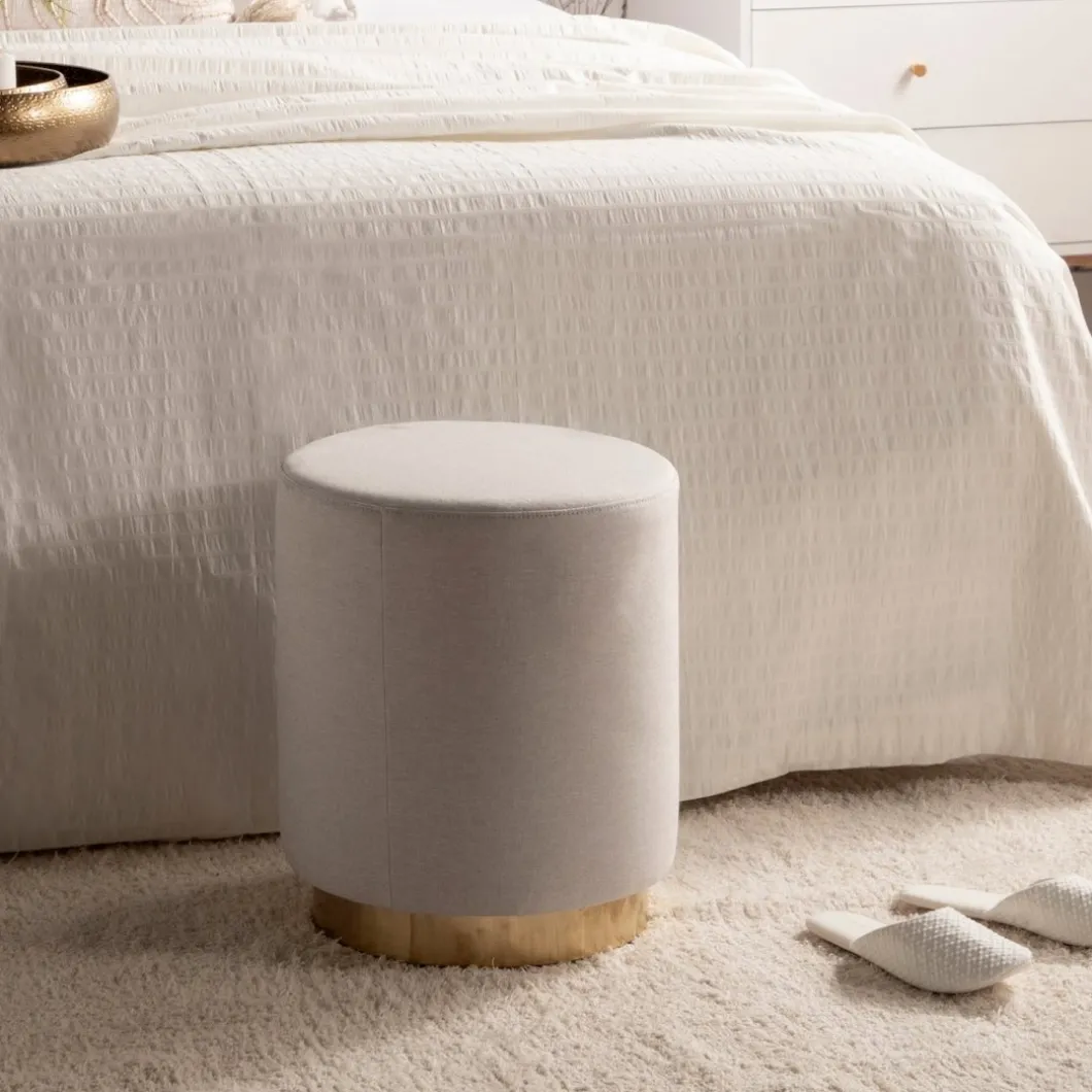 Añade un toque de elegancia y comodidad a tu hogar con el puf redondo Fani tapizado en beige. Su tapizado beige brinda una sensación de calma y neutralidad, mientras que los detalles en dorado añaden un toque de lujo y glamour. Utilízalo como asiento adicional en la sala de estar para recibir a tus invitados con estilo, o colócalo en el dormitorio como un práctico y elegante reposapiés.