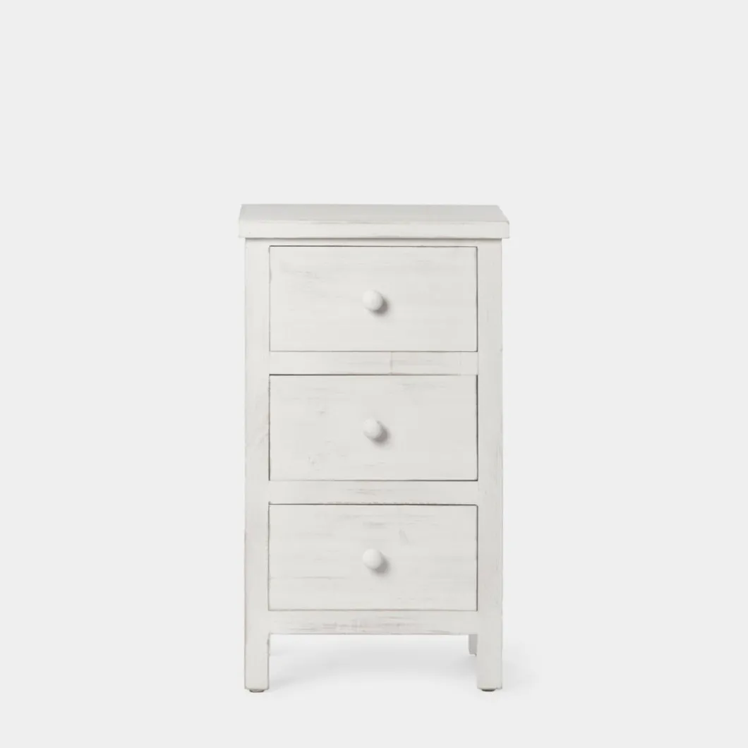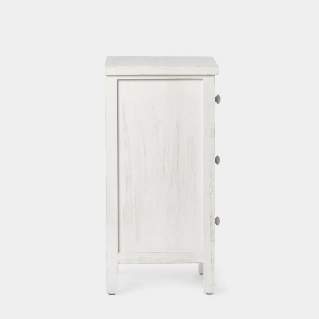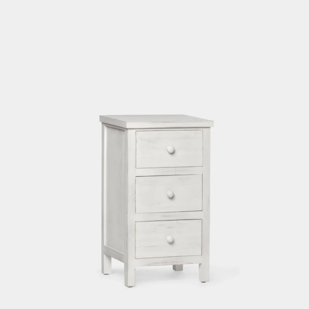 La mesita de noche estrecha blanca Folk, fabricada en madera reciclada libre de tratamientos químicos, fusiona la belleza del estilo natural con la sostenibilidad del upcycling. Cada pieza, elaborada artesanalmente, cuenta una historia única a través de sus imperfecciones y aporta carácter a cualquier estancia. Sus tres cajones te ayudarán a mantener el orden en tu dormitorio. El sistema de cierre de cajones es sin guia.