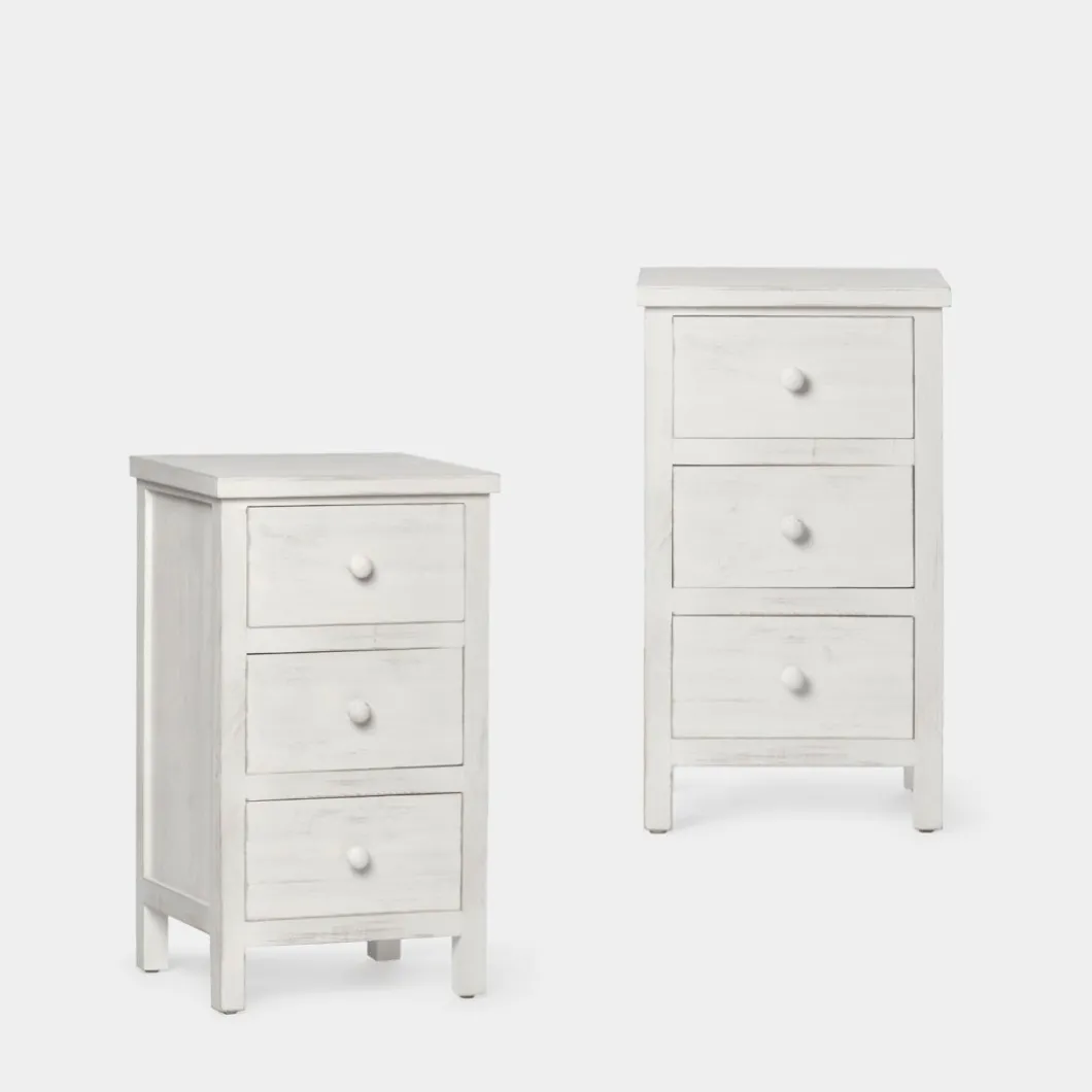 ¡Aprovéchate de este pack! La mesita de noche estrecha blanca Folk, fabricada en madera reciclada libre de tratamientos químicos, fusiona la belleza del estilo natural con la sostenibilidad del upcycling. Cada pieza, elaborada artesanalmente, cuenta una historia única a través de sus imperfecciones y aporta carácter a cualquier estancia. Sus tres cajones te ayudarán a mantener el orden en tu dormitorio.