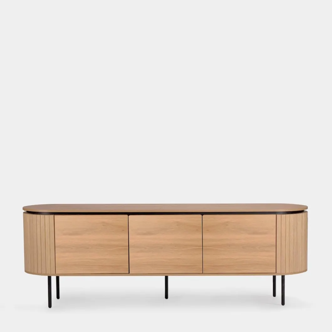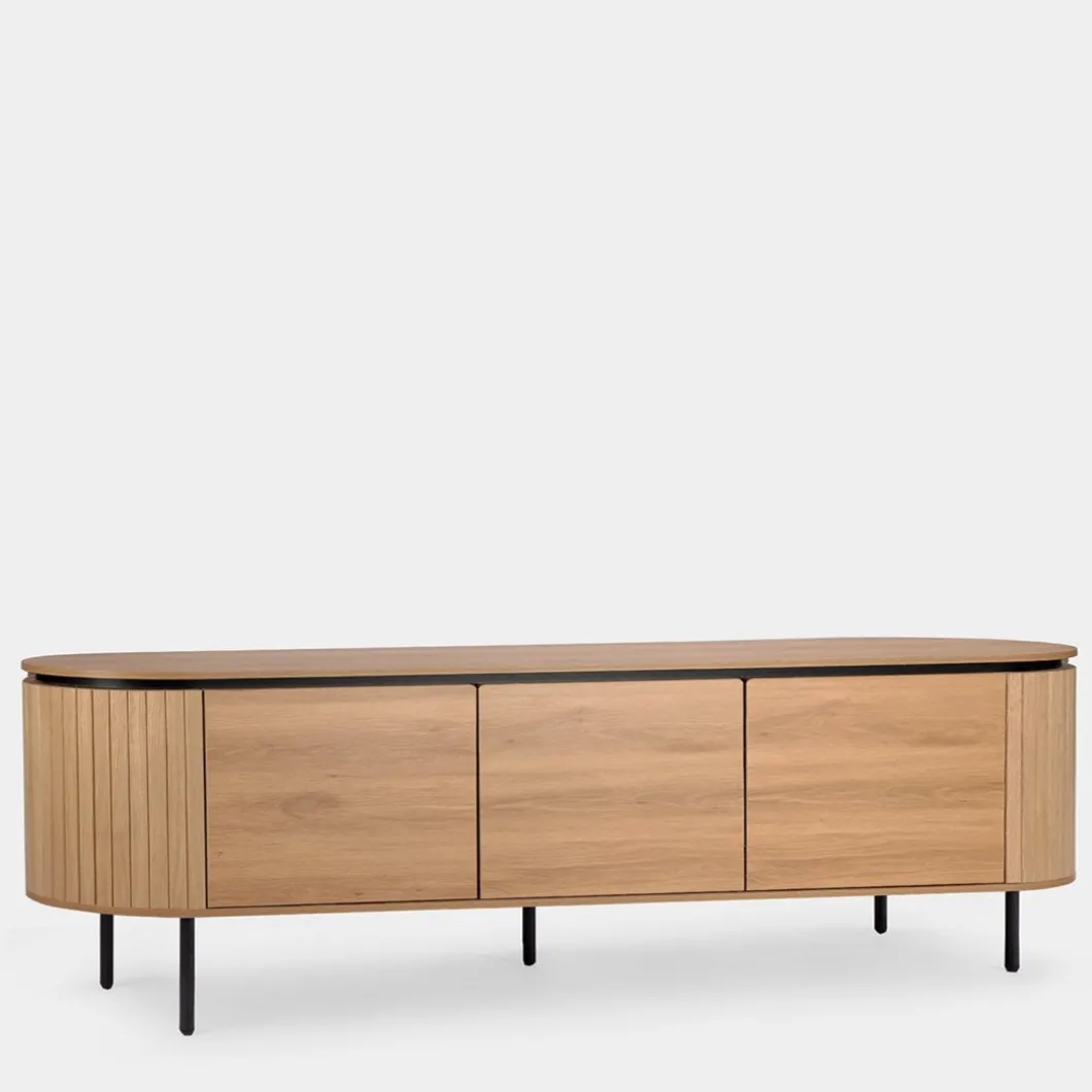 El mueble TV Helios en madera color natural combina elegancia y funcionalidad en un diseño de líneas suaves y forma redondeada. Sus puertas con cantos redondeados no solo realzan su estilo, sino que también permiten un acceso cómodo al amplio espacio de almacenamiento. Combínalo con el resto de la colección para conseguir un look armonioso y estilizado.