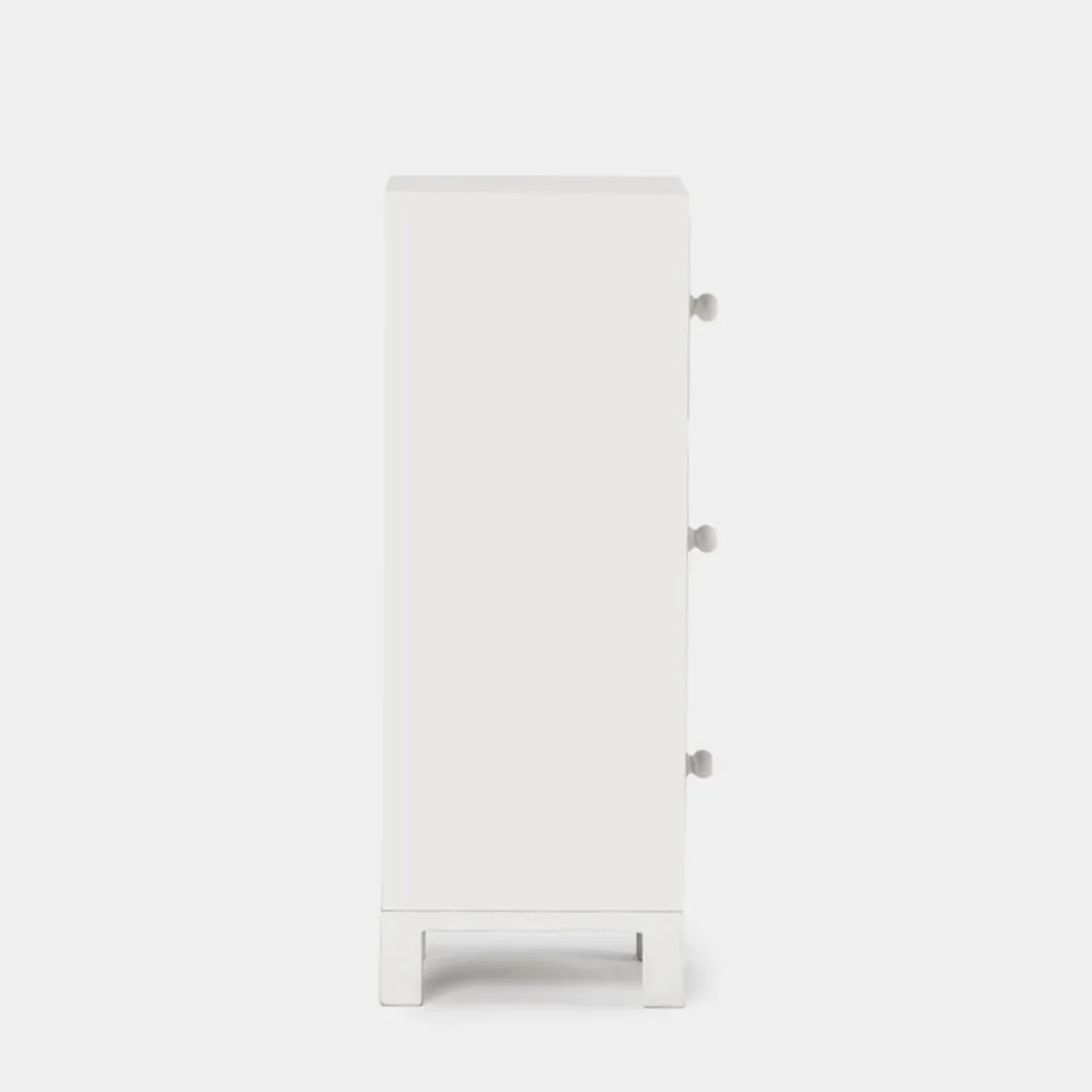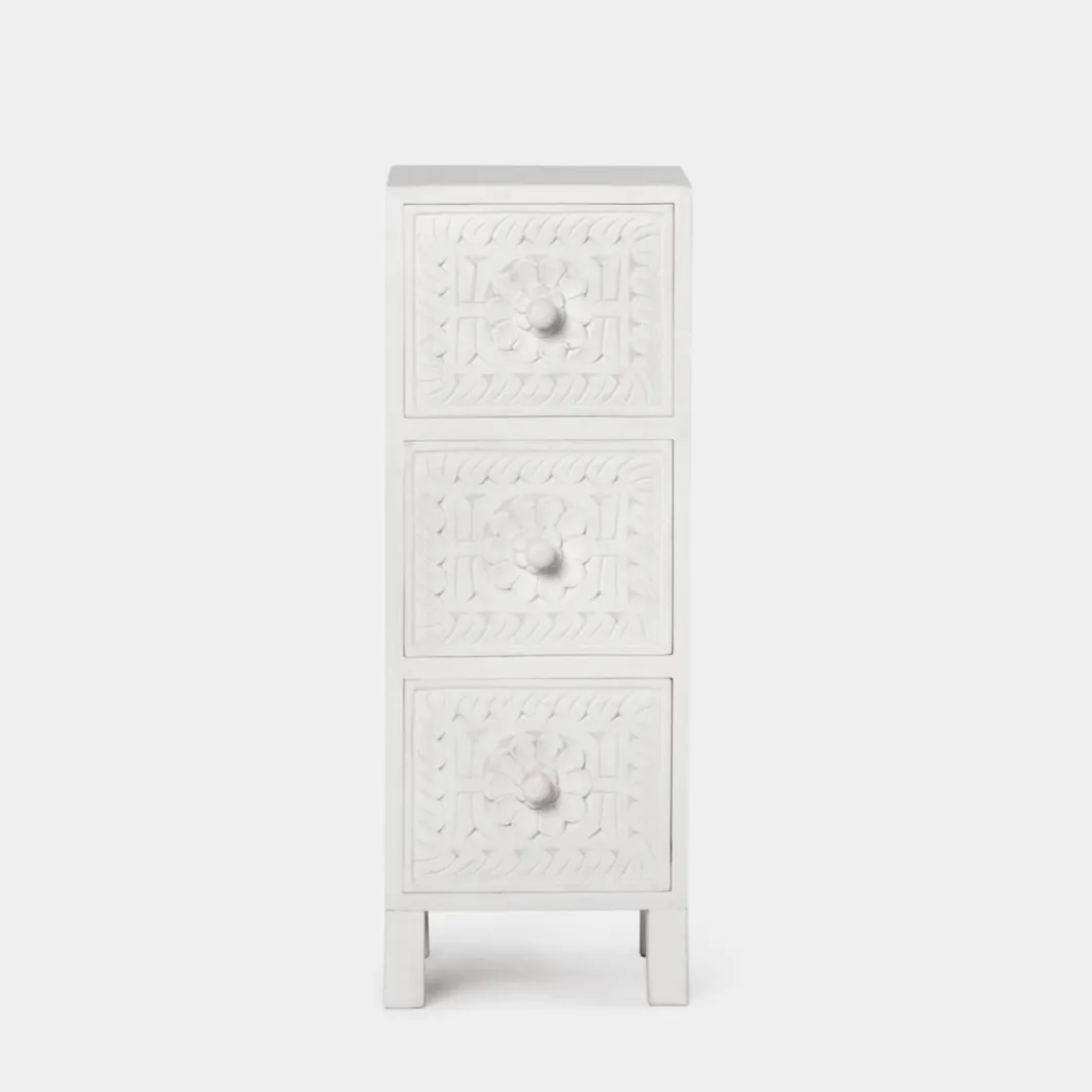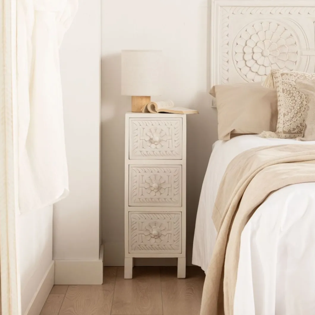 Con la mesita de noche estrecha de 3 cajones en blanco vintage Iraya conseguirás darle personalidad y carácter a tu dormitorio. Sus tres cajones que te ayudarán a organizar y mantener en orden tu hogar. Ha sido tallada a mano, por lo que puede presentar ligeras variaciones que la convierten en una pieza única.