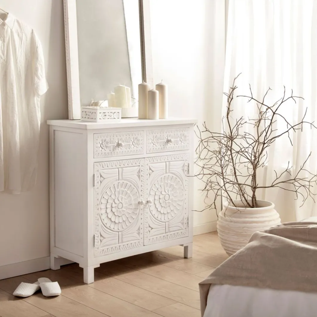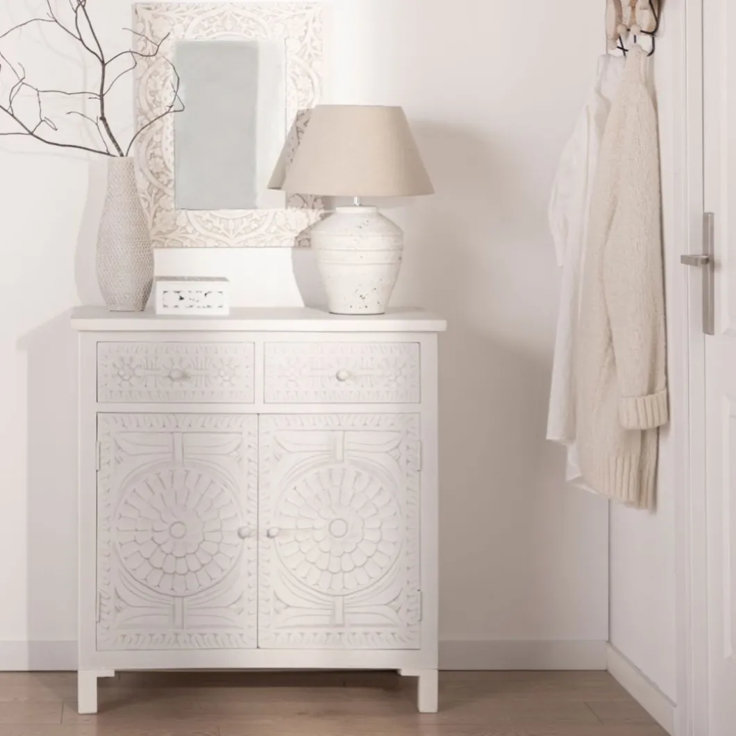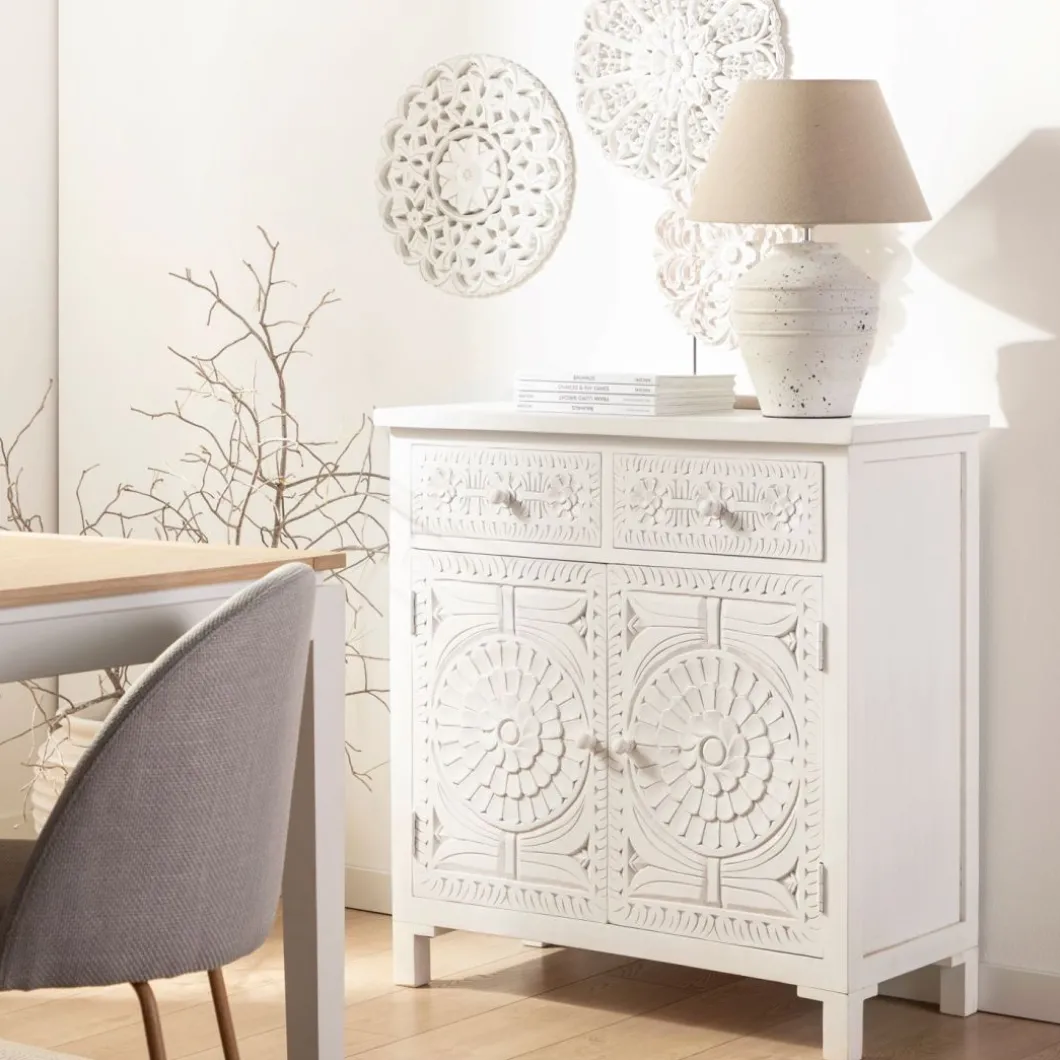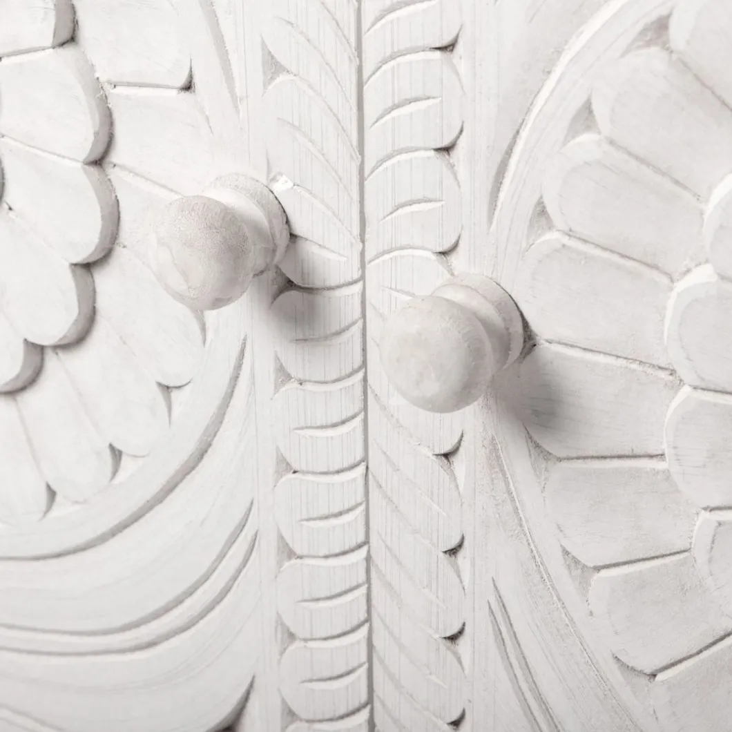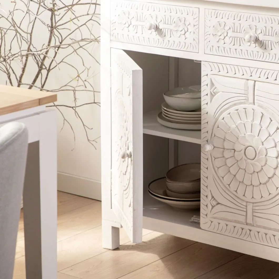 Con el aparador en blanco vintage Iraya conseguirás darle un toque distintivo a tu hogar y ganar un extra de almacenaje. Las puertas y los cajones han sido tallados a mano por maestros artesanos, por lo que se trata de una pieza única. Para mayor estabilidad del mueble, aconsejamos su anclaje a la pared.