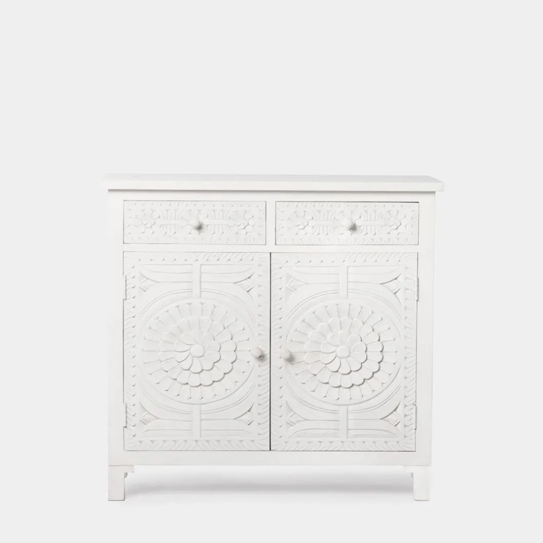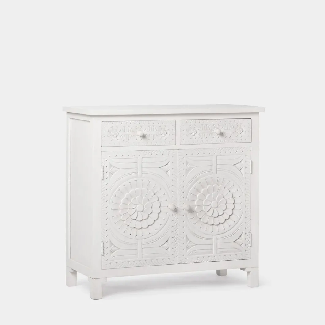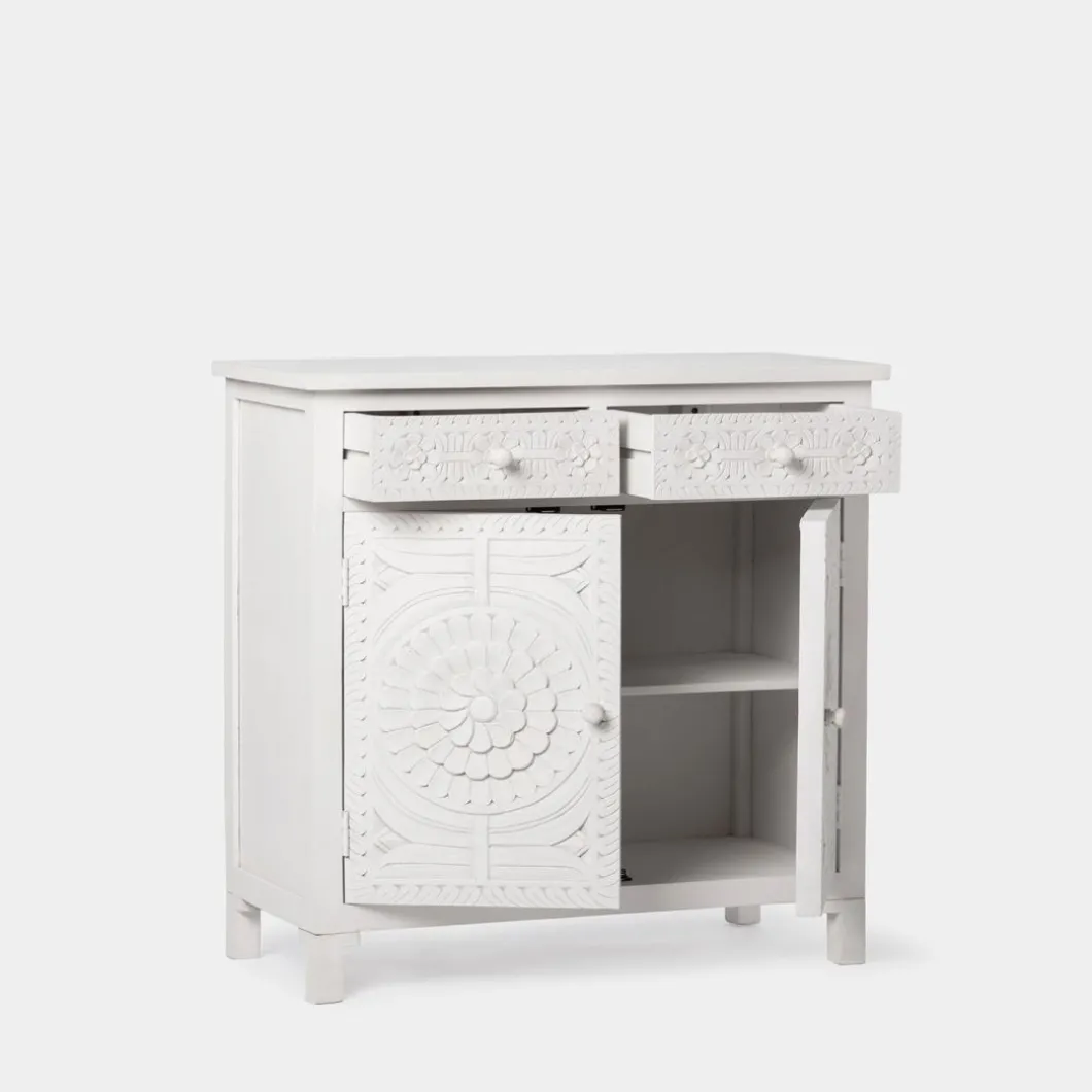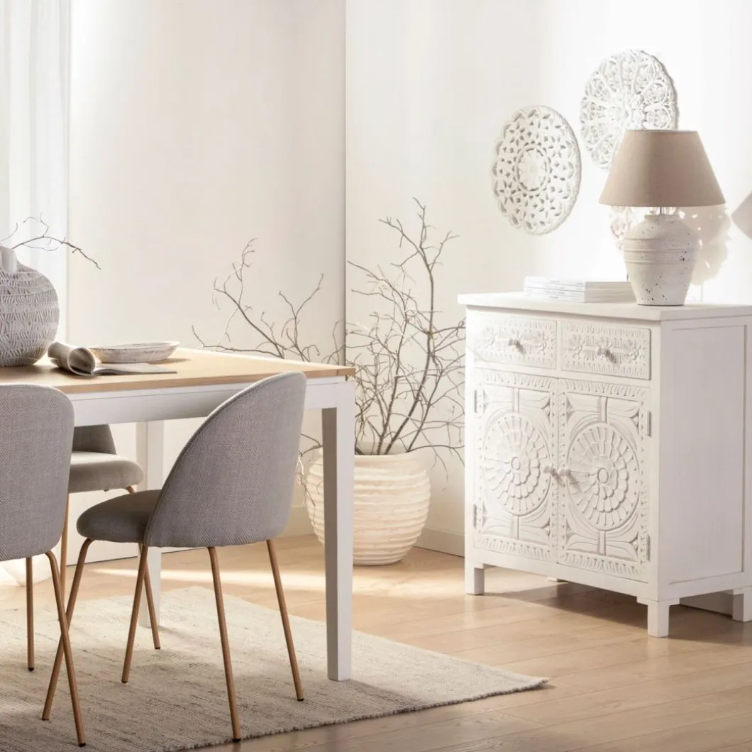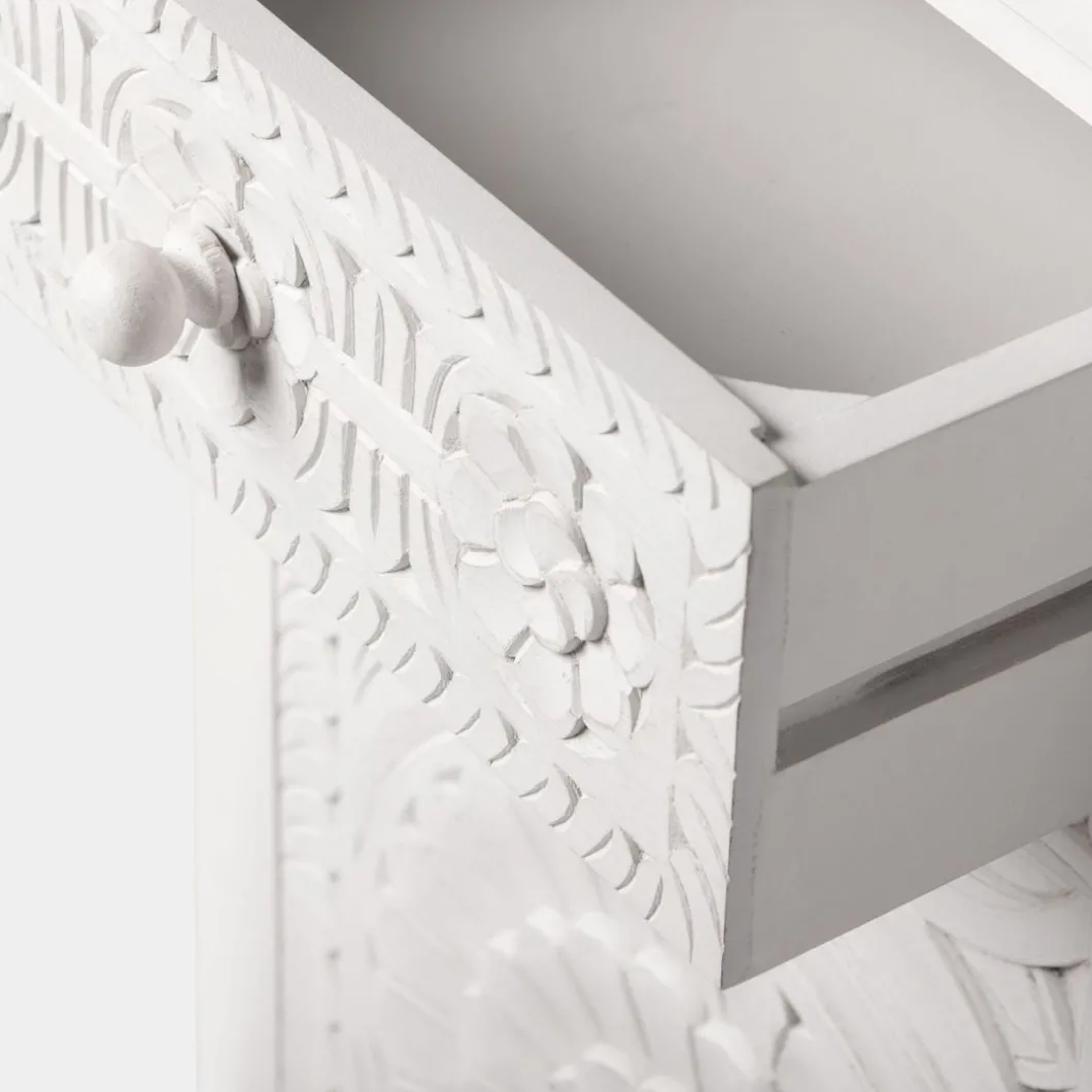 Con el aparador en blanco vintage Iraya conseguirás darle un toque distintivo a tu hogar y ganar un extra de almacenaje. Las puertas y los cajones han sido tallados a mano por maestros artesanos, por lo que se trata de una pieza única. Para mayor estabilidad del mueble, aconsejamos su anclaje a la pared.
