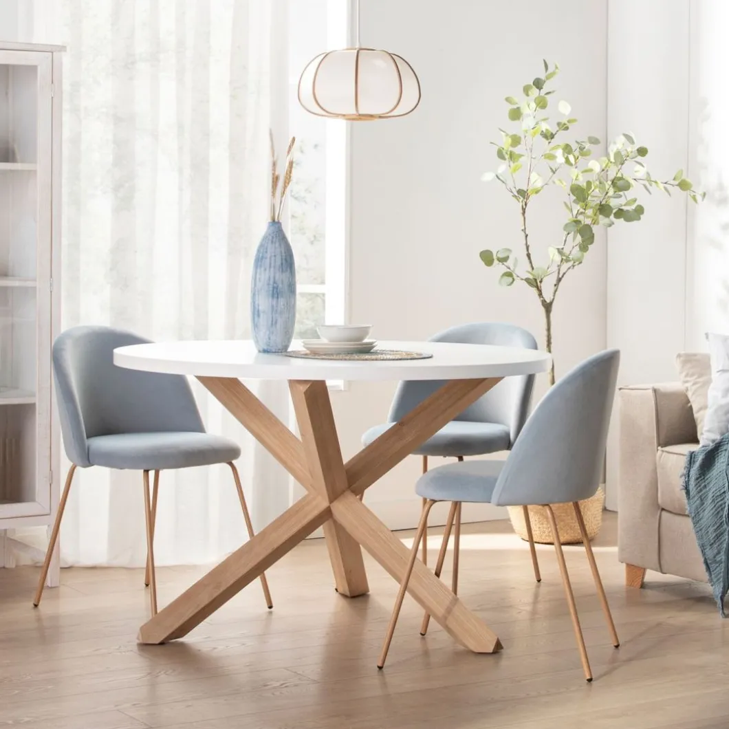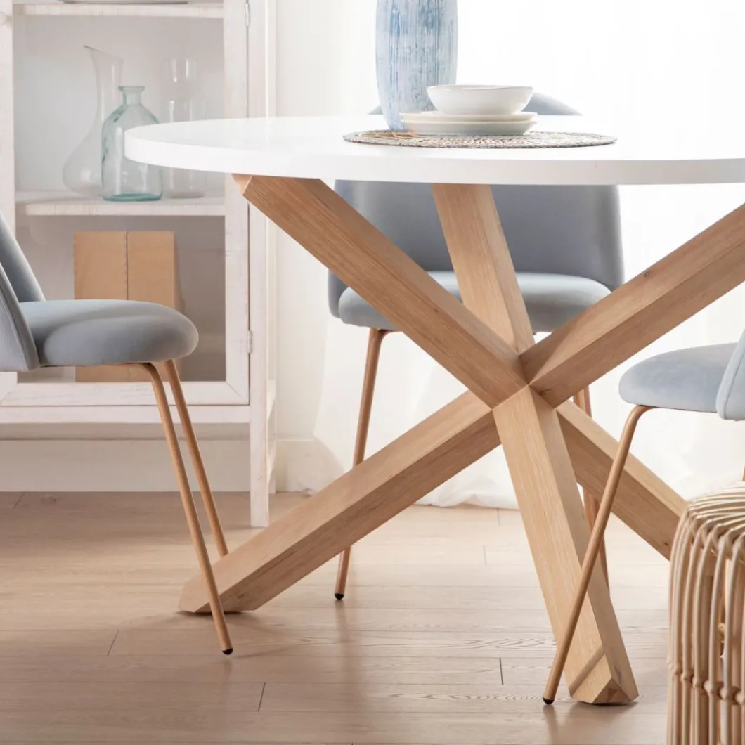 La mesa de comedor redonda Isak es la mesa ideal con la que completar tu salón, comedor o cocina. Su sobre blanco y su estructura de madera maciza natural aportan calidez y frescura a la estancia. Es apta para reunir hasta 6 comensales. También está disponible en acabado natural, escoge el que más te guste.