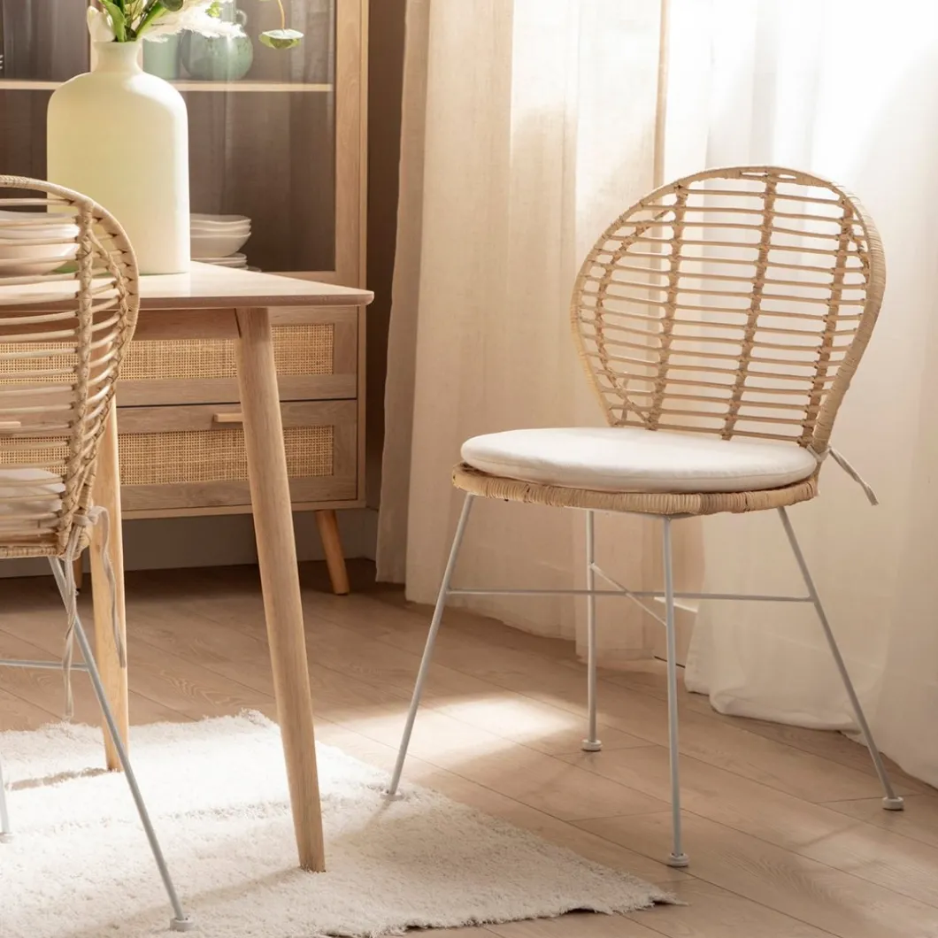 La silla de comedor en ratán natural y pata metálica negra Kala aporta naturalidad, calidez y elegancia a la decoración de cualquier hogar. Su asiento ha sido trenzado a mano por expertos en el arte del ratán natural. Por ello, puede presentar irregularidades propias del material. Incluye un cojín desenfundable que le aporta un extra de confort a la sentada, aunque puedes quitarlo siempre que quieras.