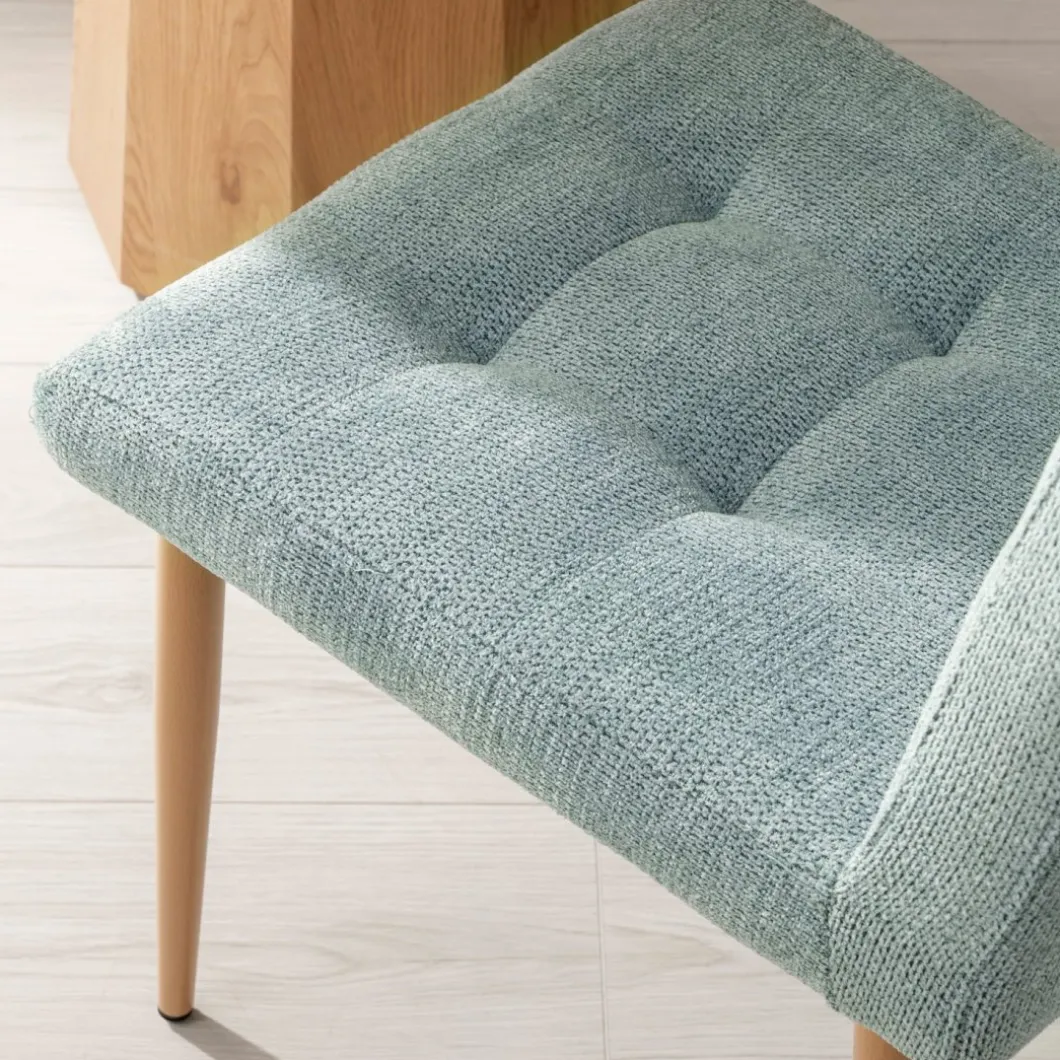 La silla de comedor tapizada Leia en menta con pata metálica efecto madera es ideal para quienes buscan combinar estilo, confort y sofisticación en su comedor. Con su diseño elegante y el detalle de capitoné en el respaldo, la silla Leia será un complemento perfecto para reuniones familiares y cenas formales. Disponible en varios acabados, escoge el que mejor encaje con tu estilo.