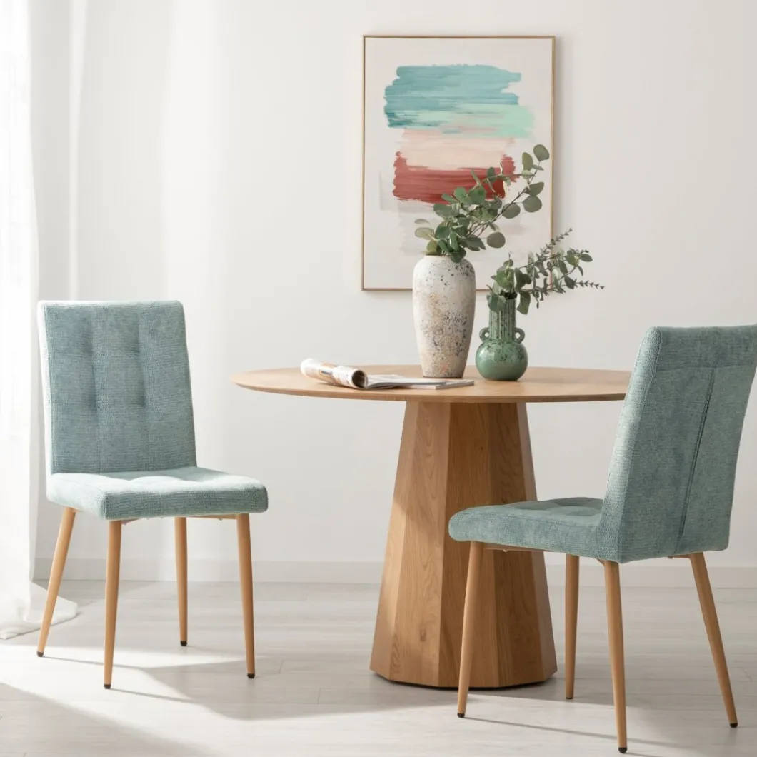 La silla de comedor tapizada Leia en menta con pata metálica efecto madera es ideal para quienes buscan combinar estilo, confort y sofisticación en su comedor. Con su diseño elegante y el detalle de capitoné en el respaldo, la silla Leia será un complemento perfecto para reuniones familiares y cenas formales. Disponible en varios acabados, escoge el que mejor encaje con tu estilo.
