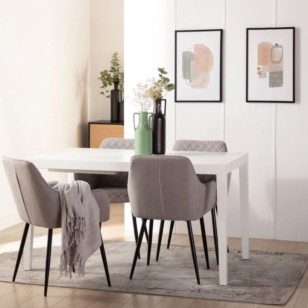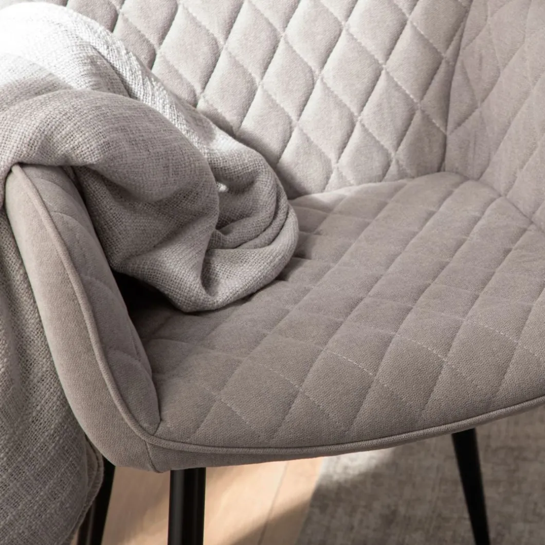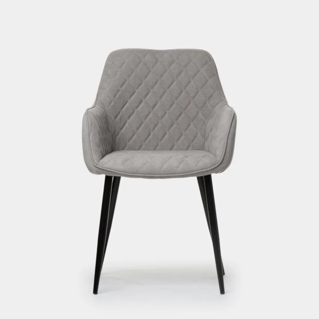 Las silla de comedor tapizada Lizel con pata metálica negra es una apuesta por el confort gracias a su forma ergonómica con reposabrazos integrado. Su acabado en poliéster con dibujo en rombos está disponible en 2 colores, elige entre uno de ellos para darle un toque de modernidad y sofisticación a tu salón.