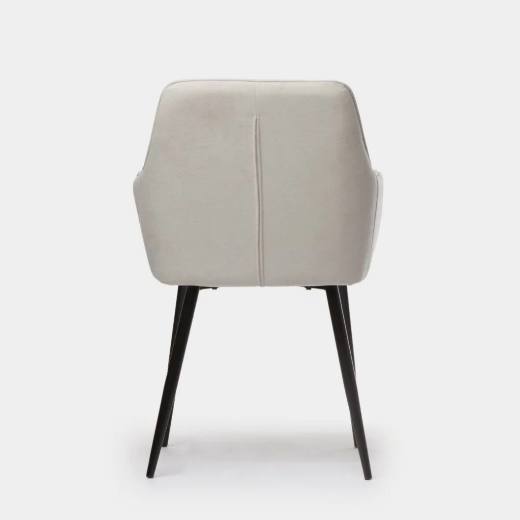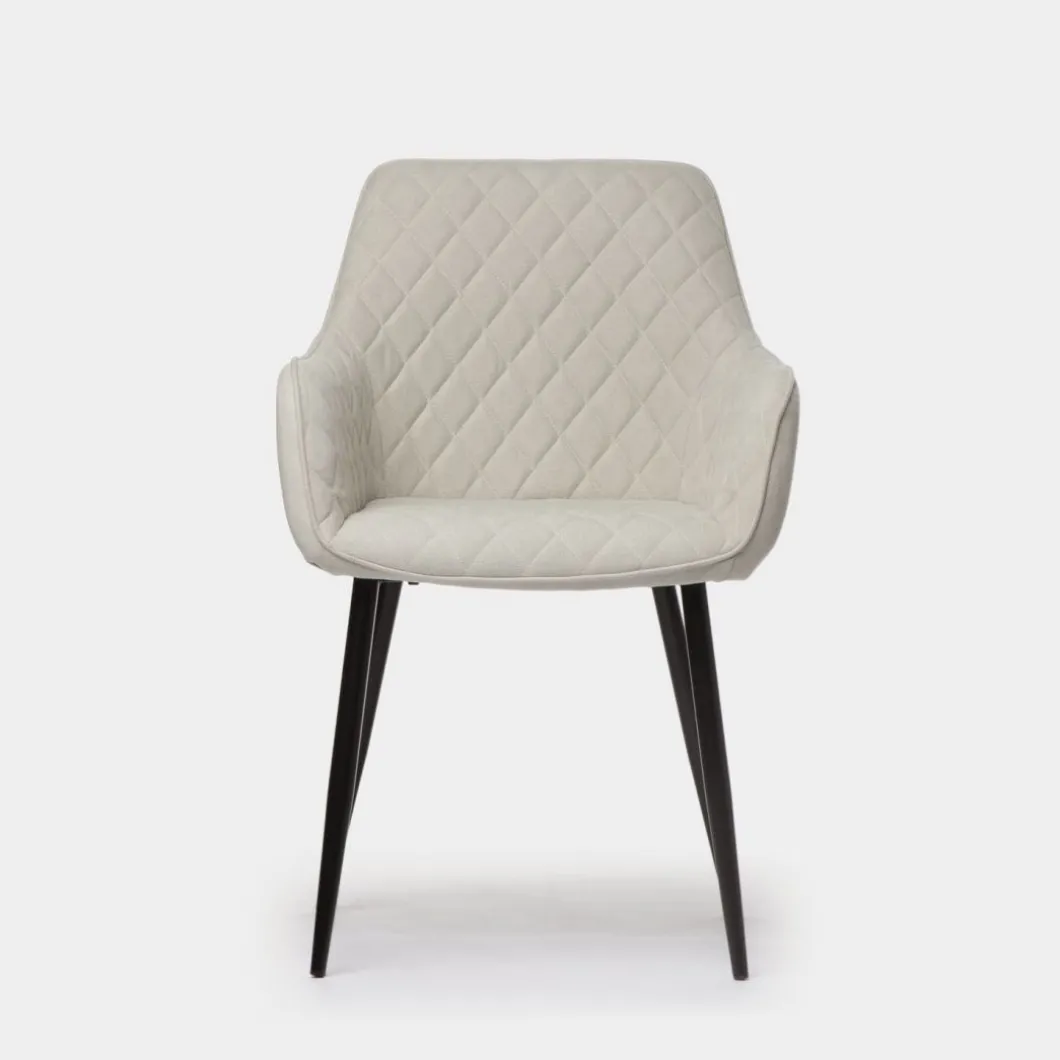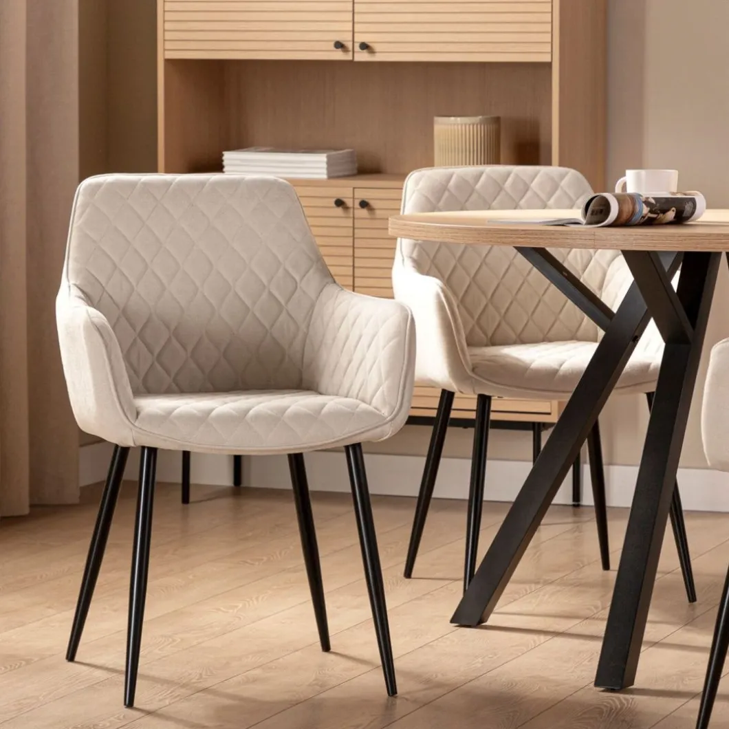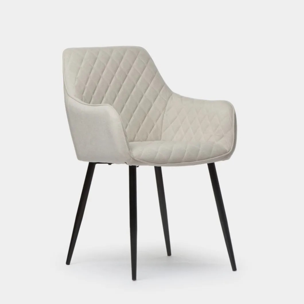 Las silla de comedor tapizada Lizel con pata metálica negra es una apuesta por el confort gracias a su forma ergonómica con reposabrazos integrado. Su acabado en poliéster con dibujo en rombos está disponible en 2 colores, elige entre uno de ellos para darle un toque de modernidad y sofisticación a tu salón.