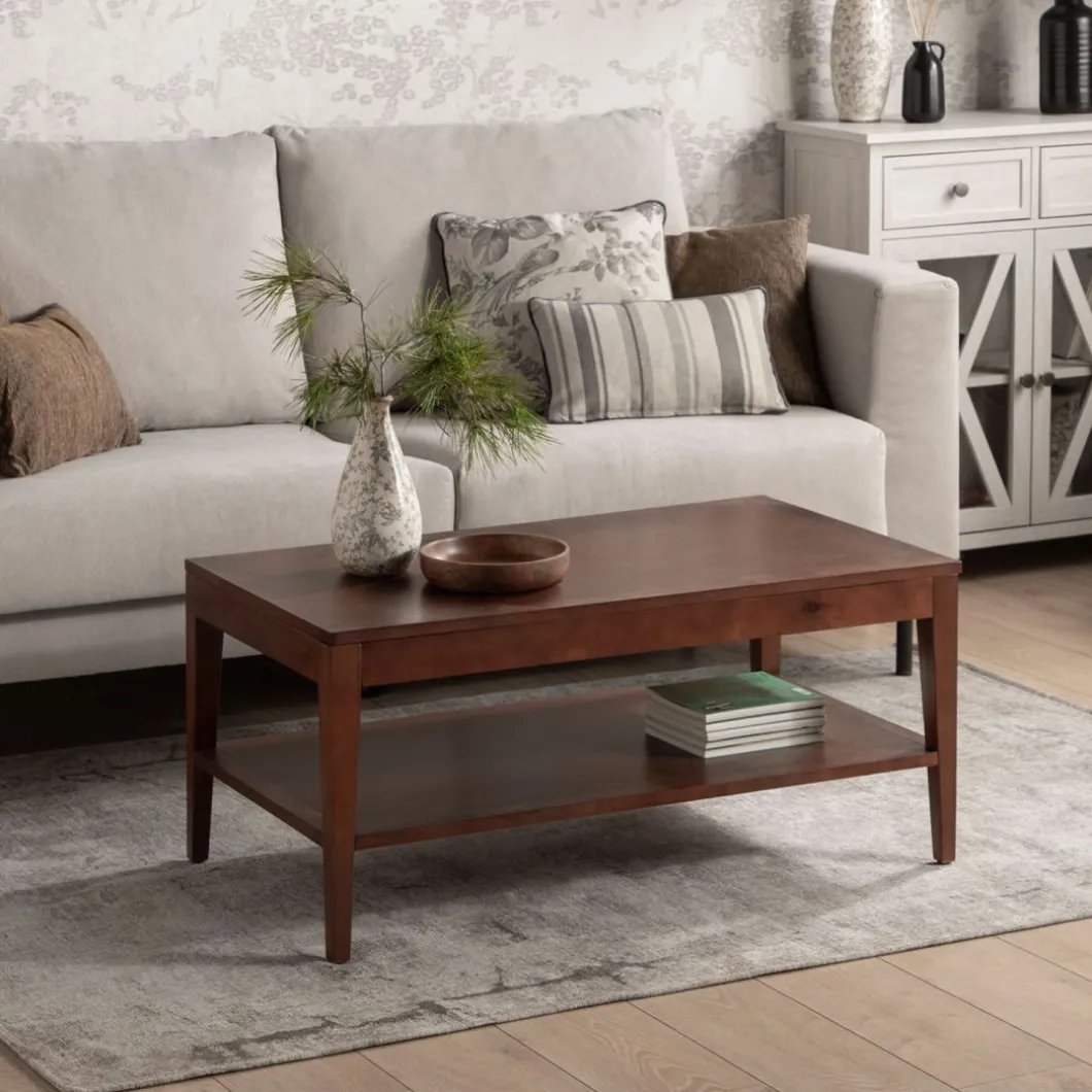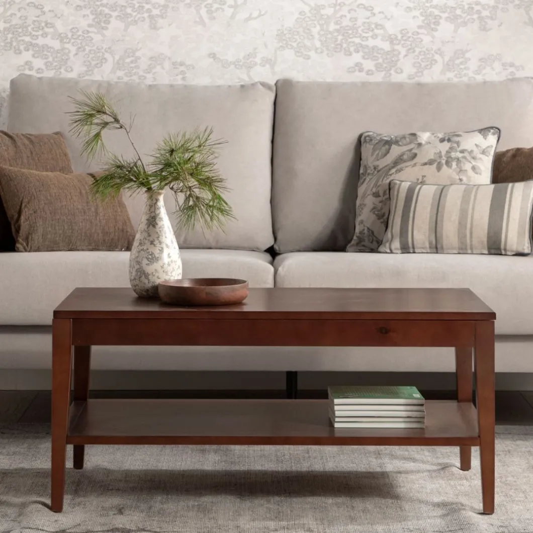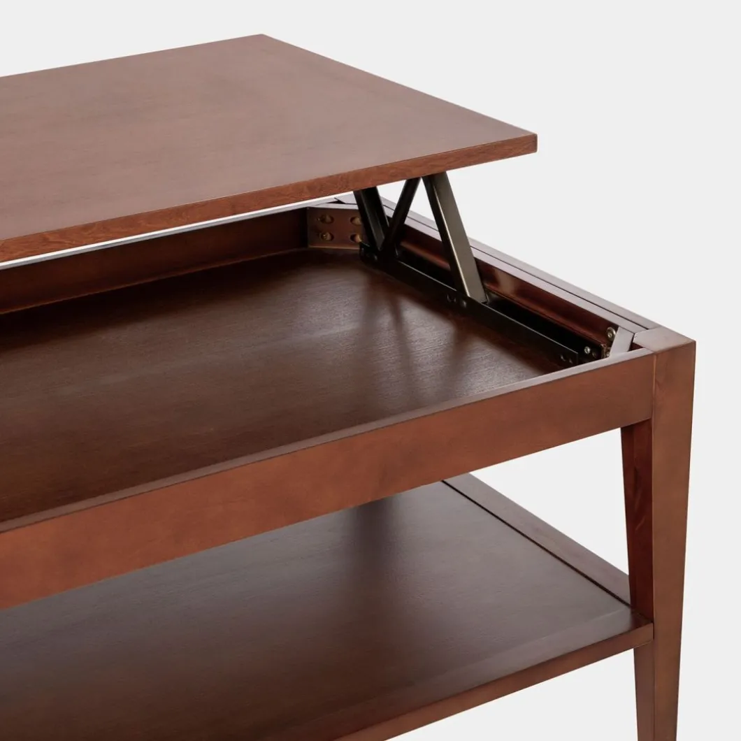 La mesa de centro elevable Mara en madera color castaño es una pieza esencial para completar cualquier salón/comedor. Es una mesa práctica y funcional que cuenta con un estante y un amplio cajón. Además, su sobre es elevable, lo que te permite comer o cenar comodamente desde el sofá. Está disponible en varios acabados.