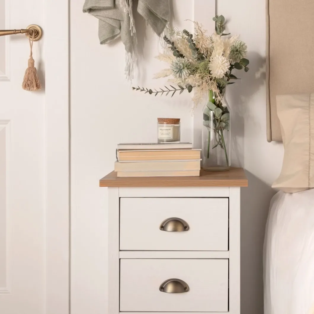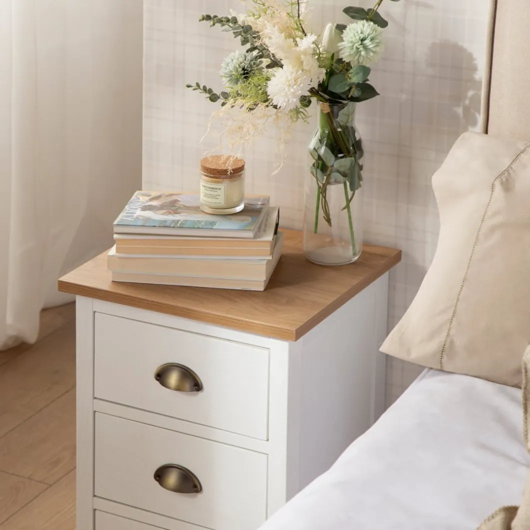 La mesita de noche blanca de 3 cajones Marais es la pieza perfecta para conseguir almacenaje extra y mantener tu dormitorio limpio y ordenado. Gracias a su diseño sencillo y atemporal encaja en cualquier estilo decorativo. Sus tres cajones cuentan con un sistema de cierre con retención que evita que se den golpes al cerrar e impide la apertura involuntaria. Combínala con la cómoda Marais y crea un dormitorio lleno de encanto.