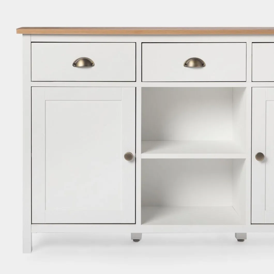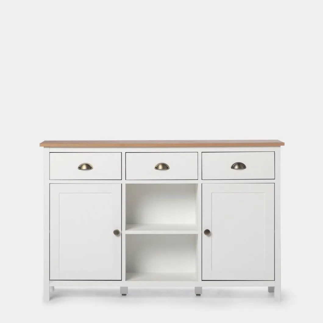 Con el aparador estrecho blanco Marais conseguirás el espacio de almacenamiento adicional que estás buscando para tu hogar. Gracias a su gran capacidad de almacenaje podrás guardar todo el menaje del hogar y mantener el orden en casa. Sus tres cajones cuentan con un sistema de cierre con retención que evita que se den golpes al cerrar e impide la apertura involuntaria. Para mayor estabilidad del mueble, aconsejamos su anclaje a la pared.