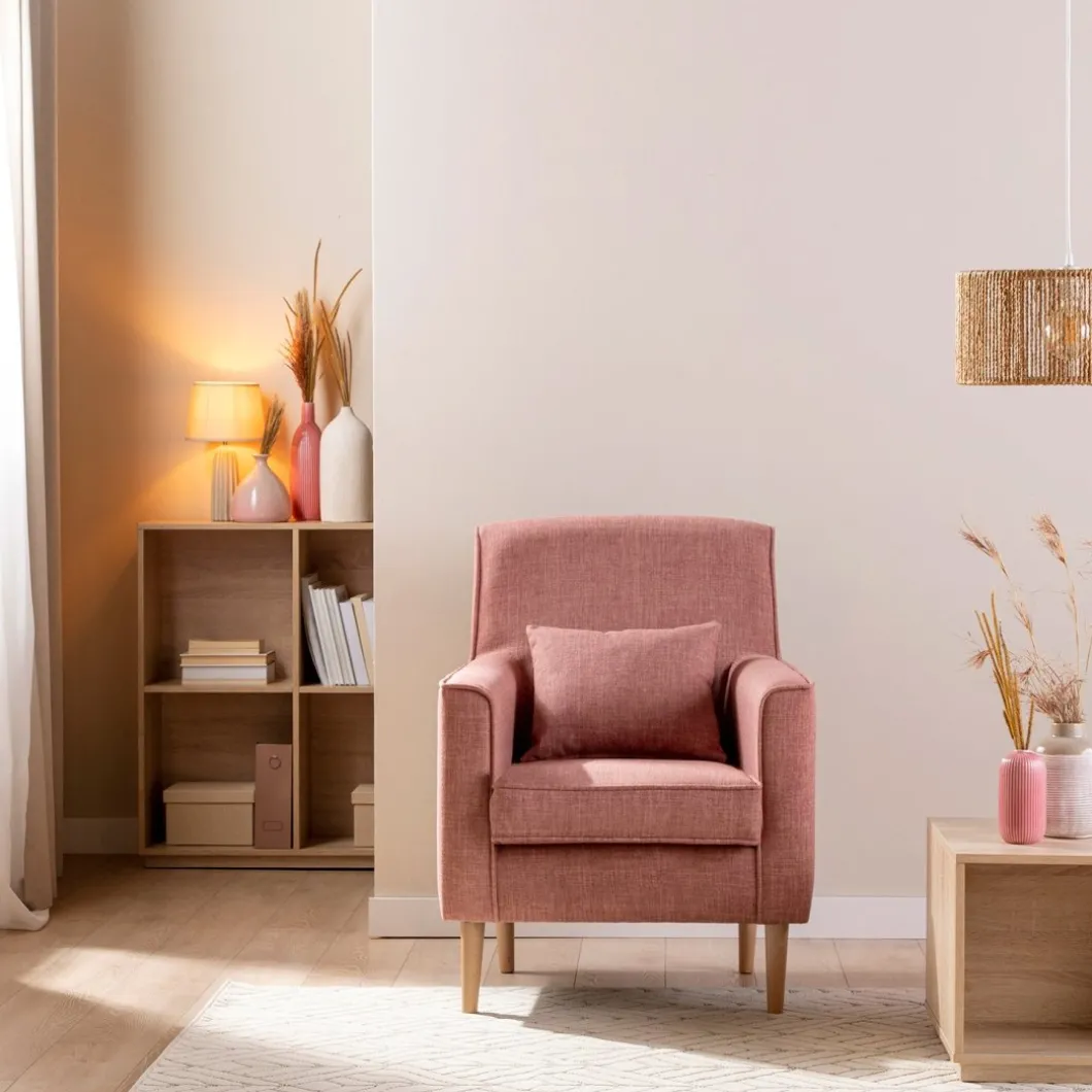 La butaca de lectura Naia en color rosa es ideal para completar cualquier salón, dormitorio o recibidor. Incluye un cojín desenfundable a juego con el tapizado de la butaca que le aporta mayor confort y comodidad a la zona lumbar. Está disponible en tres colores diferentes para que puedas escoger el que mejor se ajuste a tus gustos y necesidades.