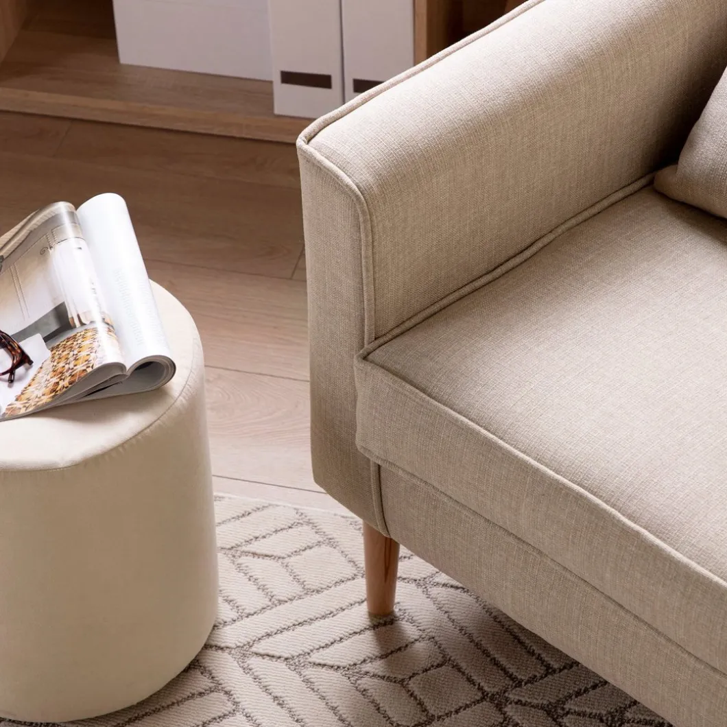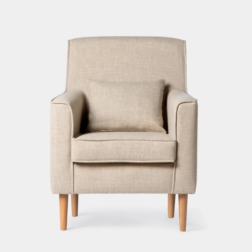 La butaca de lectura Naia en color beige es ideal para completar cualquier salón, dormitorio o recibidor. Incluye un cojín desenfundable a juego con el tapizado de la butaca que le aporta mayor confort y comodidad a la zona lumbar. Está disponible en tres colores diferentes para que puedas escoger el que mejor se ajuste a tus gustos y necesidades.