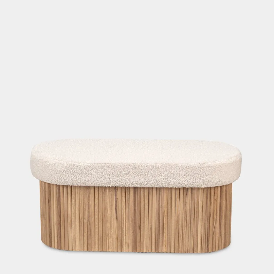 El banco Naira, elaborado en madera de paulownia y tapizado con suave borreguito blanco, fusiona funcionalidad y estilo de manera excepcional. Su práctico compartimento de almacenamiento es perfecto para mantener organizados objetos como mantas o cojines. Ideal para el dormitorio, el salón o el recibidor, este banco añade calidez y elegancia, destacándose por su diseño compacto y versátil.
