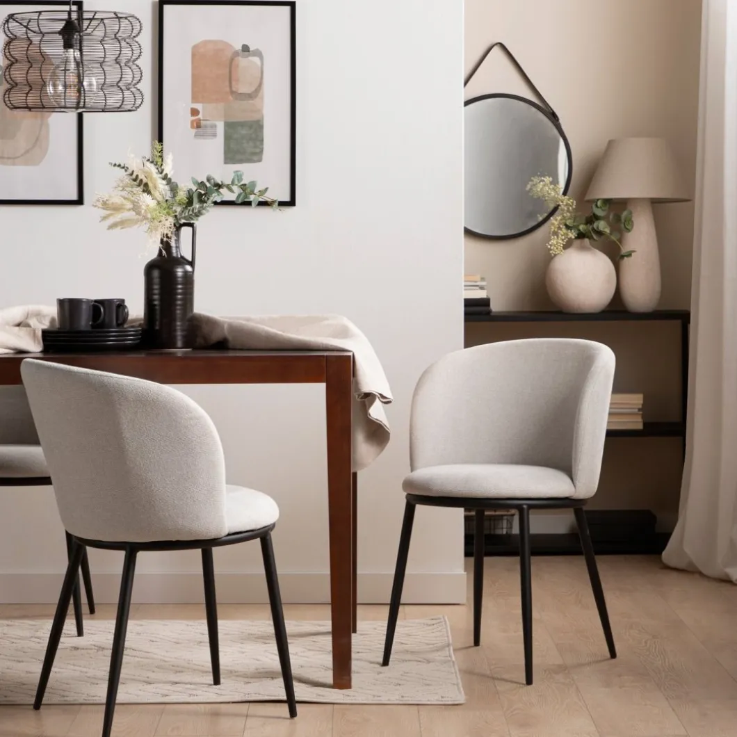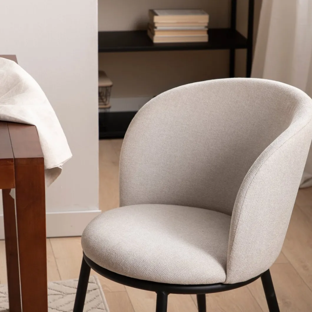 La silla de comedor Nolan tapizada en beige con pata metálica negra es la pieza ideal para completar la decoración de tu hogar. Su respaldo curvado envuelve a la perfección la espalda y aporta una gran sensación de confort y comodidad. Está disponible en una amplia gama de tonos, escoge el que más te guste y crea un espacio lleno de encanto.