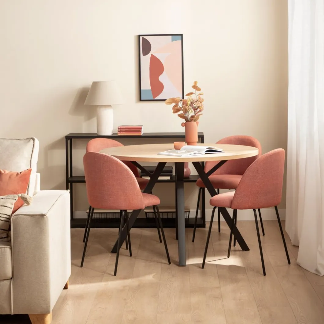 La silla de comedor Olivia tapizada en terracota y pata metálica negra tiene un diseño elegante y sencillo inspirado en los años 50. Su respaldo corto y redondeado unido al diseño de sus patas cónicas despuntadas recuerdan a esos modelos de sillería sofisticados y funcionales adaptables a cualquier estilo. Elige entre una de nuestras tonalidades de tapizados disponibles y haz de esta silla un elemento distintivo de tu salón, comedor o escritorio.
