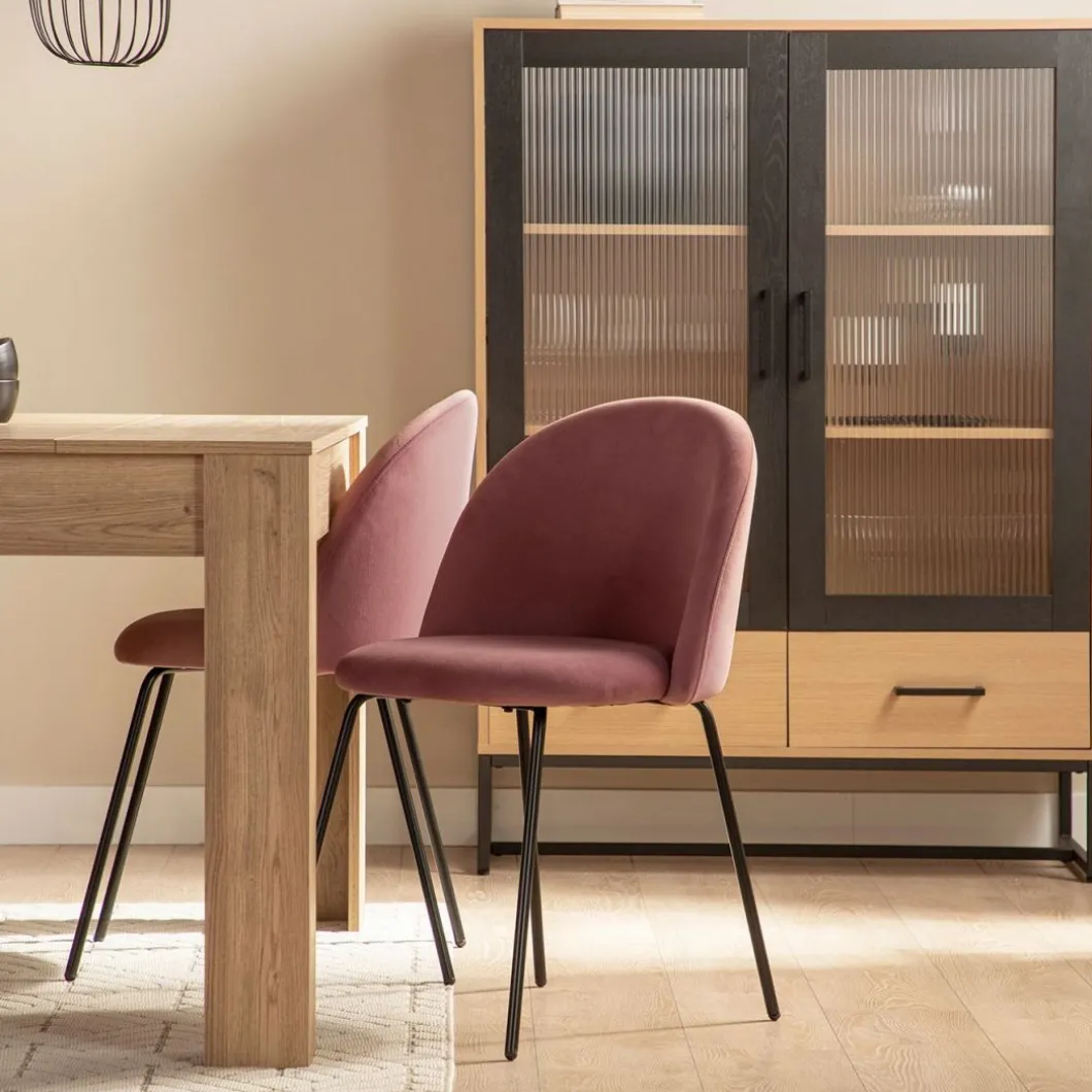 La silla de comedor Olivia en terciopelo rosa y pata metálica negra tiene un diseño elegante y sencillo inspirado en los años 50. Su respaldo corto y redondeado unido al diseño de sus patas cónicas despuntadas recuerdan a esos modelos de sillería sofisticados y funcionales adaptables a cualquier estilo.