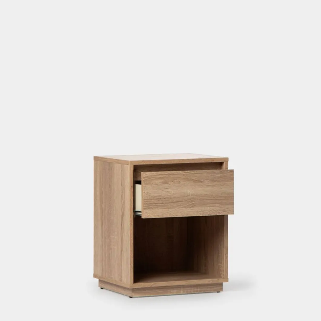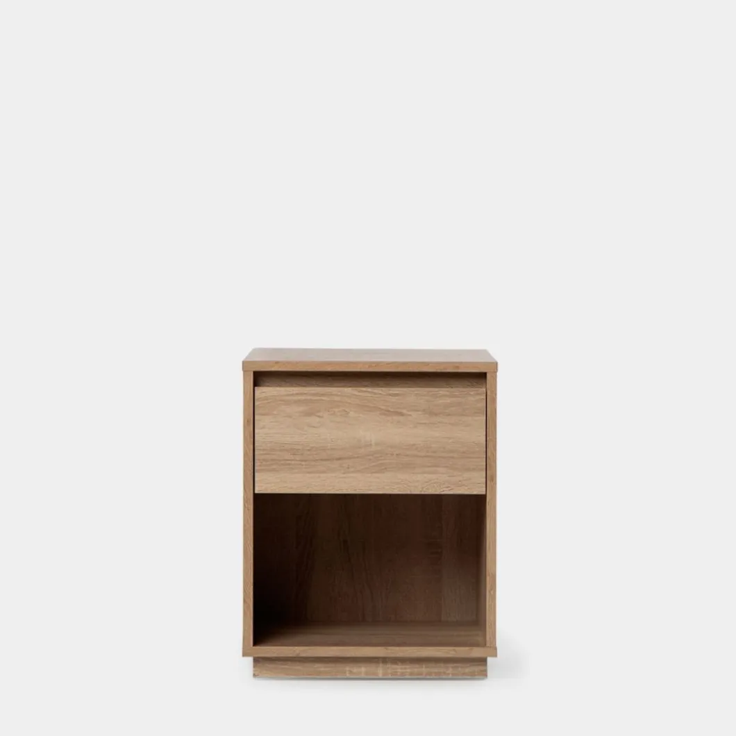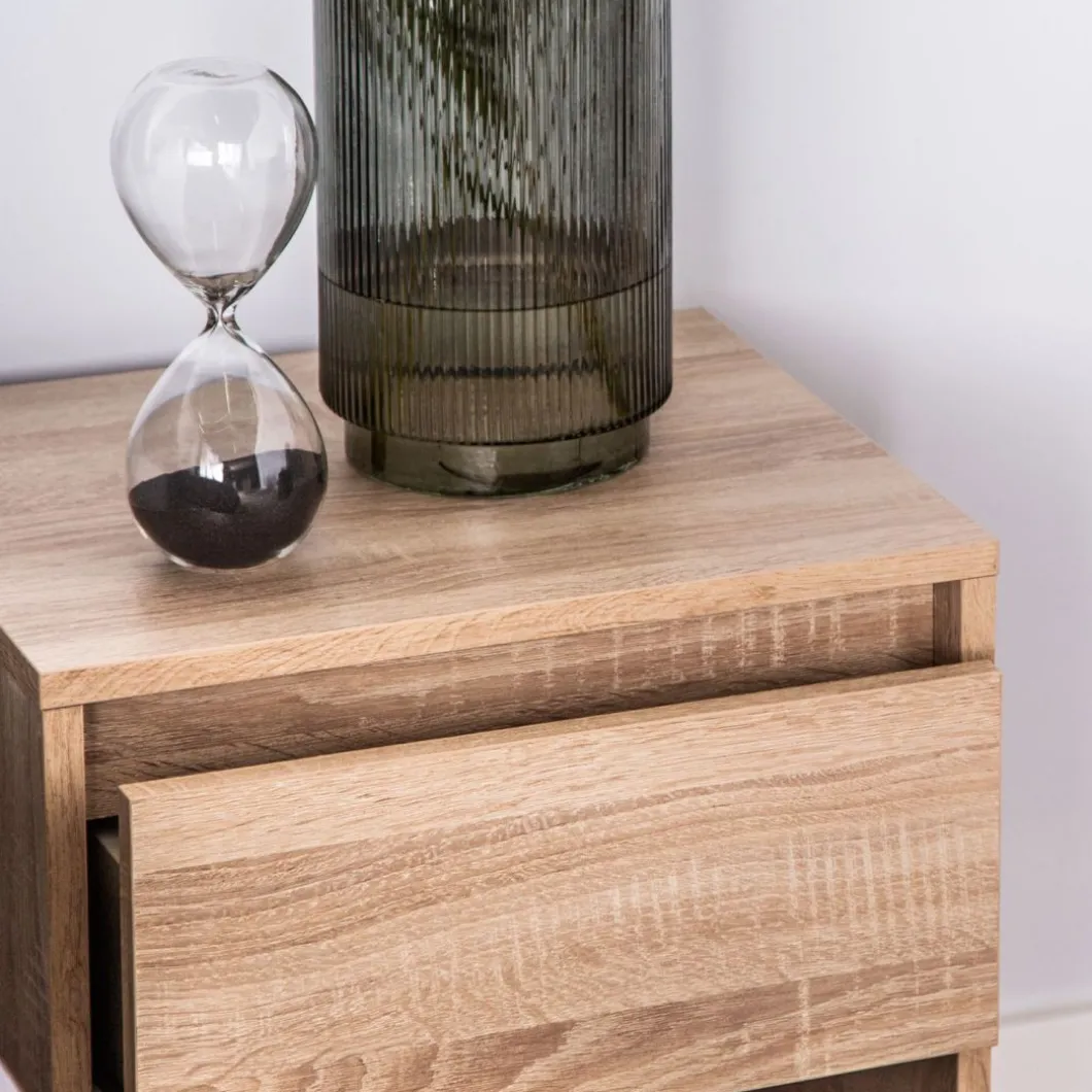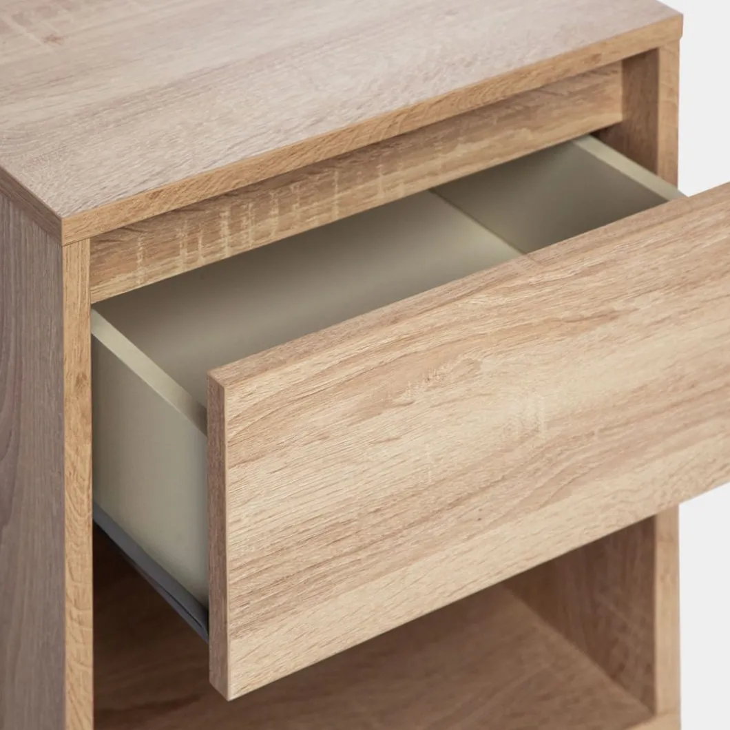 ¡Aprovéchate de este pack de 2 mesitas! La mesita de noche Oslo de efecto madera en color natural cuenta con un cajón y un espacio abierto que te permitirá guardar objetos de mayor volumen y que quieres tener en el dormitorio. Su diseño nórdico convierte a esta mesita en una de las apuestas seguras puesto que el estilo escandinavo nunca falla. También está disponible en otros colores.