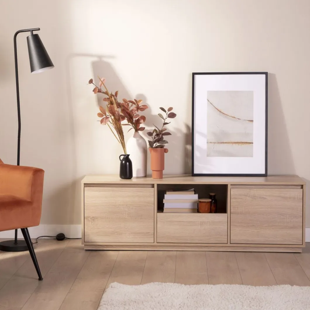 El mueble TV Oslo de 150 cm para salón te cautivará. Es de diseño propio y su estilo predominante es el nórdico, pero debido a sus líneas simples y geométricas se puede integrar en cualquier espacio.Está dotado de dos puertas batientes laterales y en su interior puedes guardar todos tus accesorios multimedia y/o libros que desees. La parte central, con cajón, es perfecta para colocar todos los suplementos de tu televisor. Es una pieza de gran capacidad y su tirador oculto la dota de sobriedad.Está disponible en más acabados. Combínalo con otras piezas de la colección.