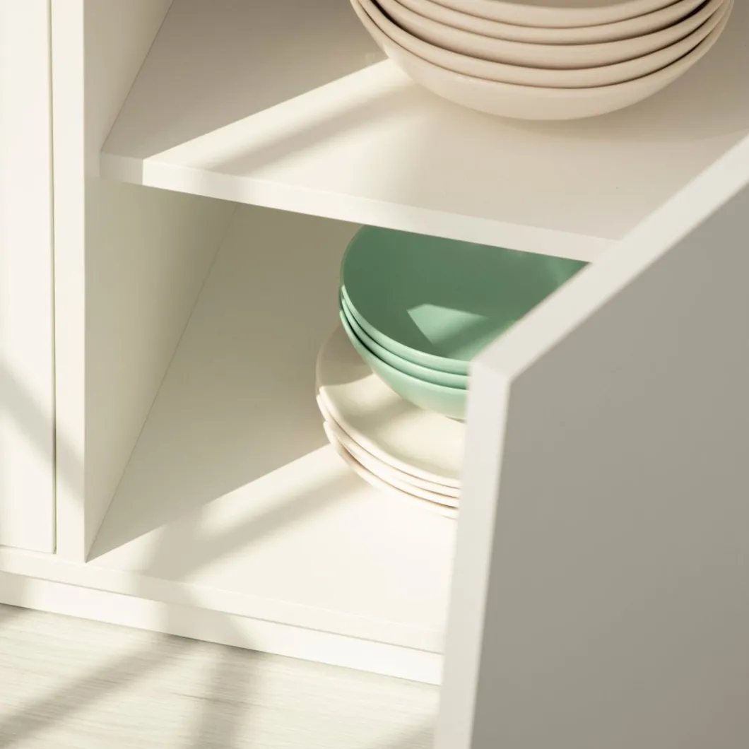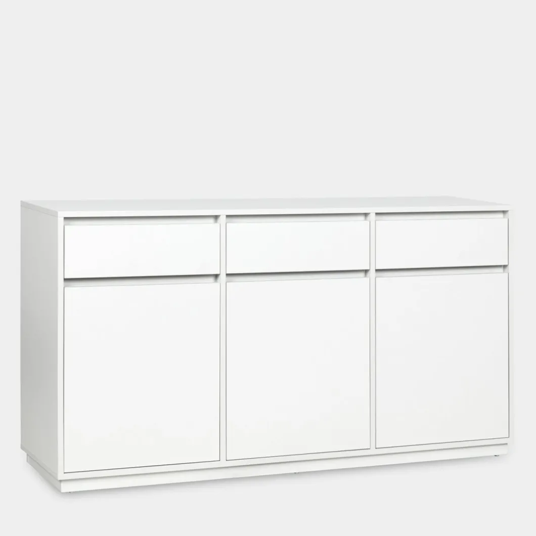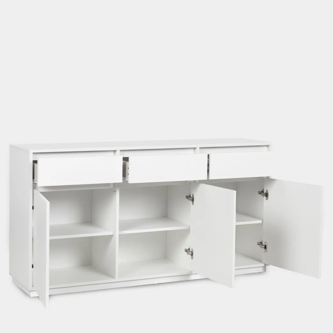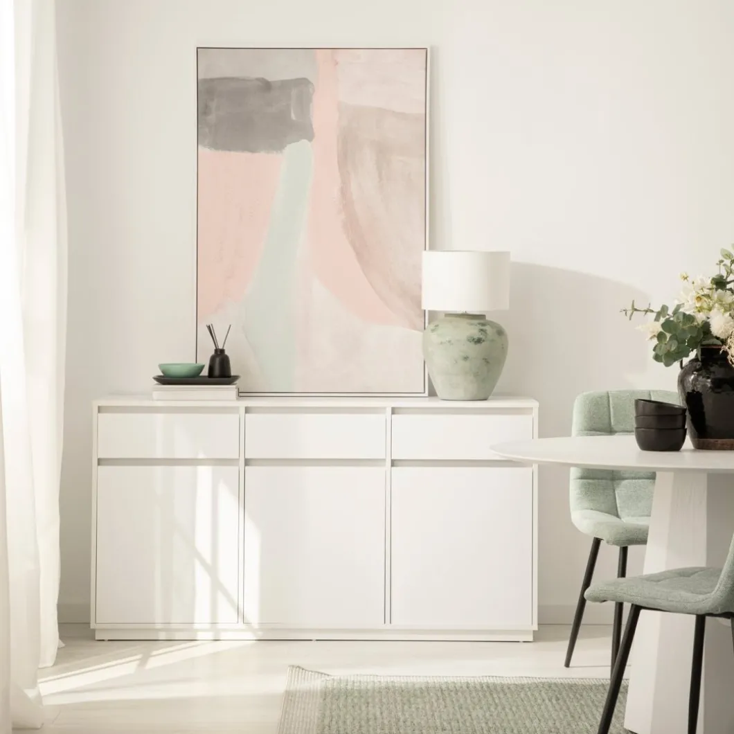 Dale un toque nórdico a tu hogar con el aparador Oslo en madera de color blanco. Equipado con tres cajones superiores y tres puertas abatibles, este mueble ofrece un amplio espacio de almacenamiento, perfecto para organizar tus pertenencias con comodidad y estilo. Además, puedes completar la atmósfera combinándolo con otras piezas de la colección Oslo, creando así un ambiente acogedor y armonioso en tu hogar.