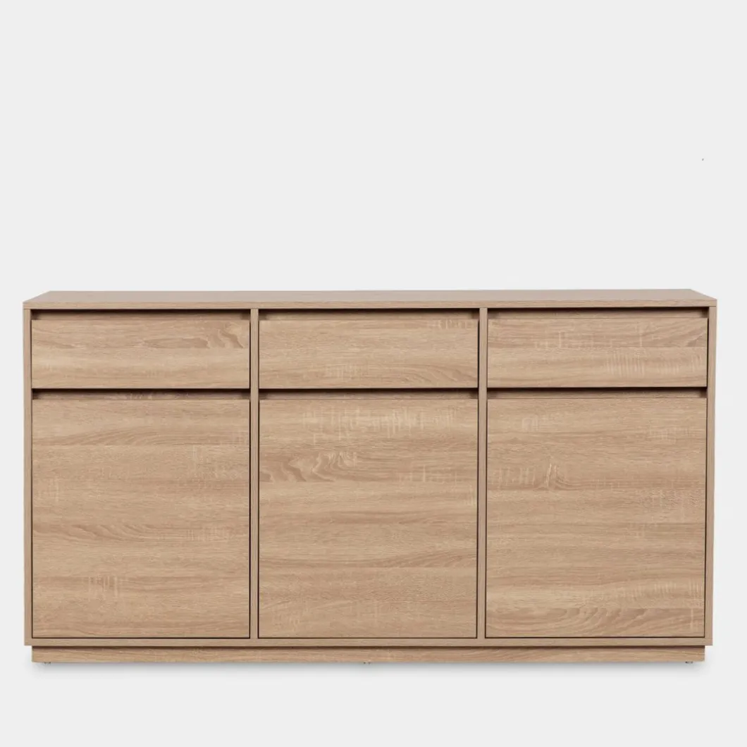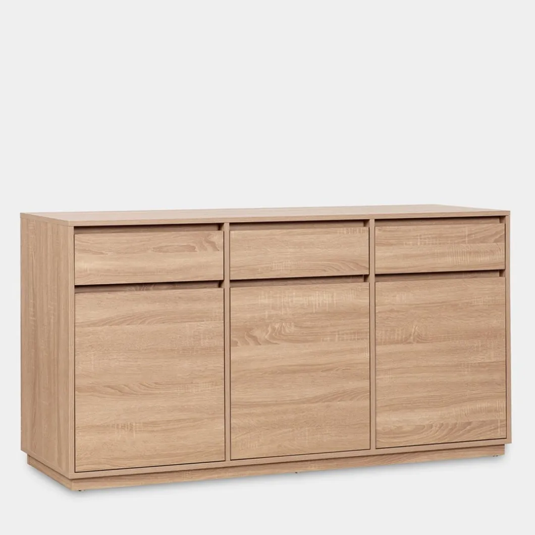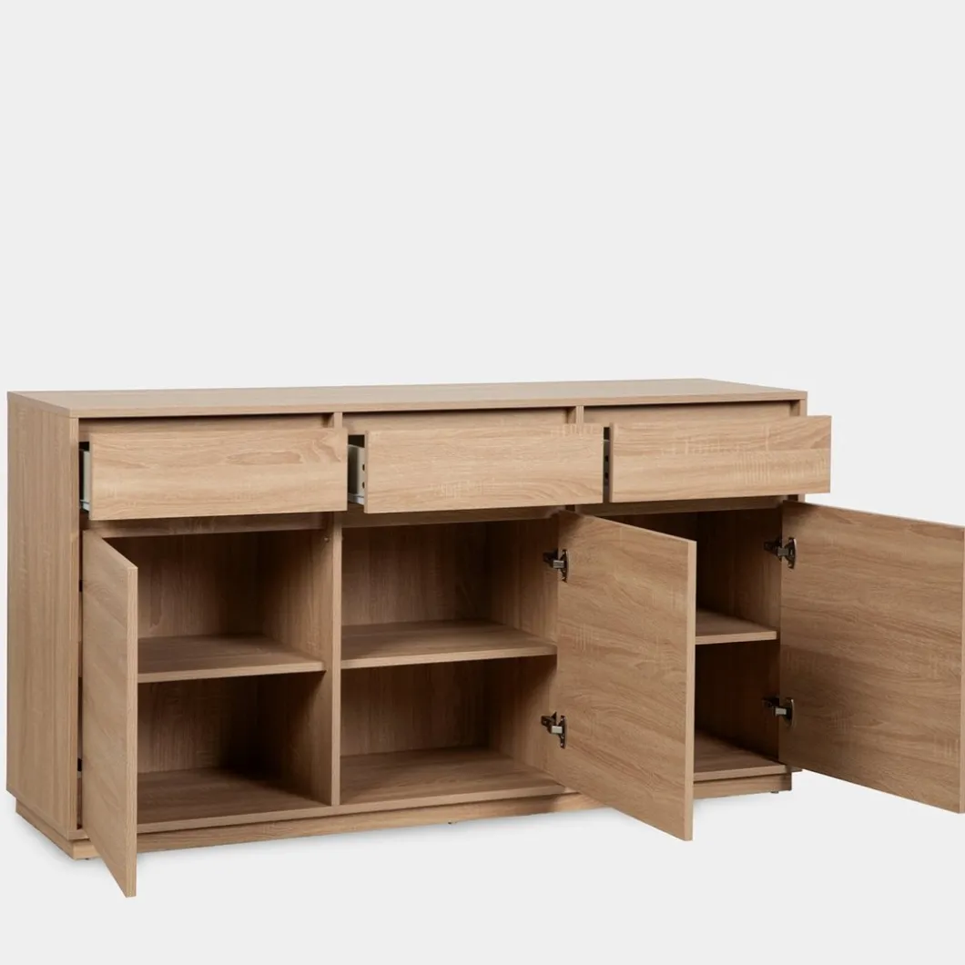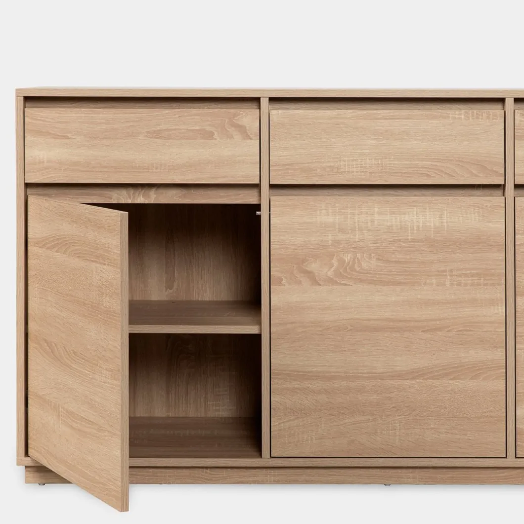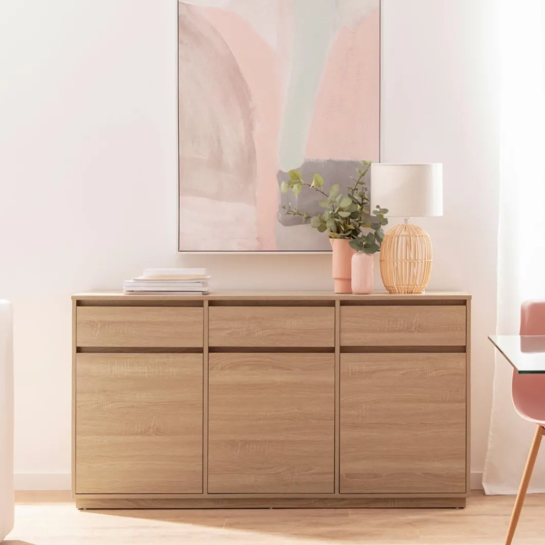 Dale un toque nórdico a tu hogar con el aparador Oslo en madera de color natural. Equipado con tres cajones superiores y tres puertas abatibles, este mueble ofrece un amplio espacio de almacenamiento, perfecto para organizar tus pertenencias con comodidad y estilo. Además, puedes completar la atmósfera combinándolo con otras piezas de la colección Oslo, creando así un ambiente acogedor y armonioso en tu hogar.