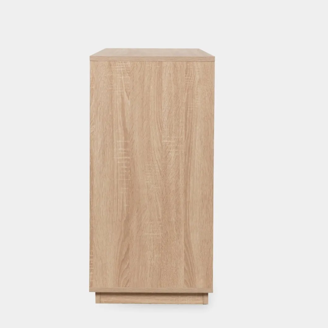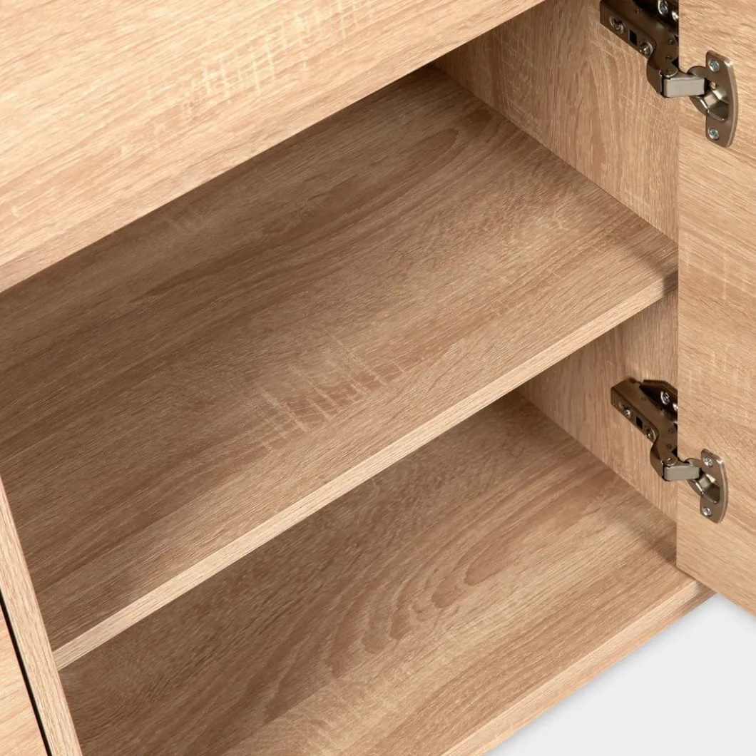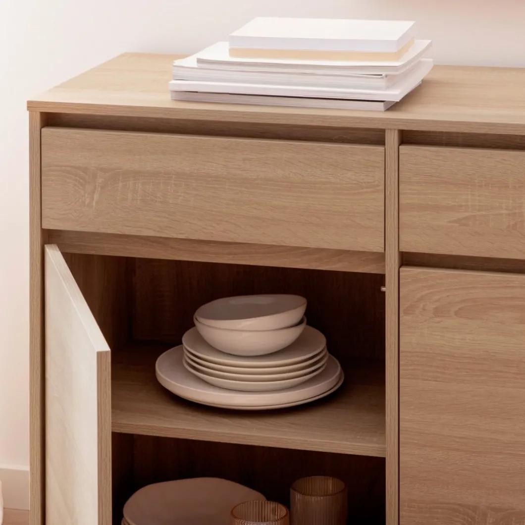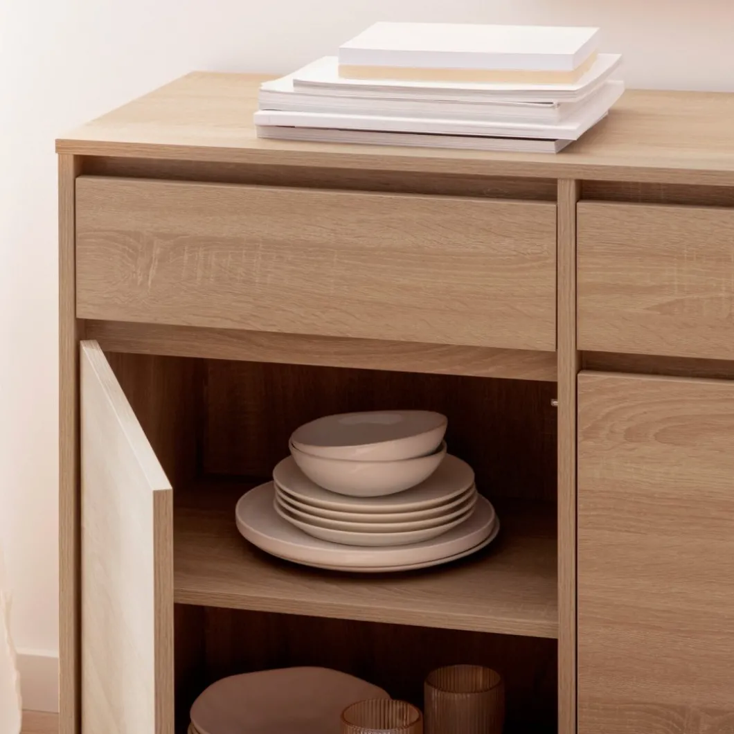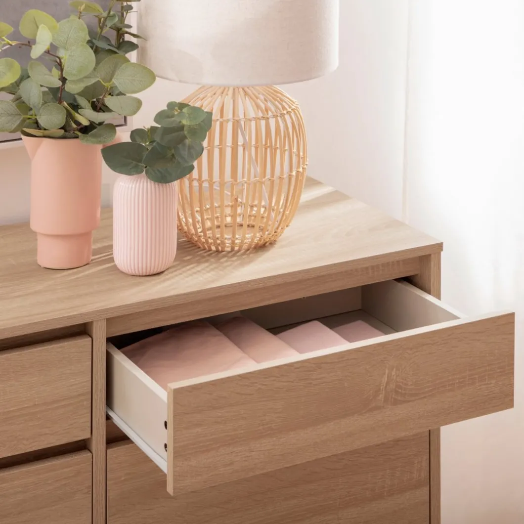 Dale un toque nórdico a tu hogar con el aparador Oslo en madera de color natural. Equipado con tres cajones superiores y tres puertas abatibles, este mueble ofrece un amplio espacio de almacenamiento, perfecto para organizar tus pertenencias con comodidad y estilo. Además, puedes completar la atmósfera combinándolo con otras piezas de la colección Oslo, creando así un ambiente acogedor y armonioso en tu hogar.